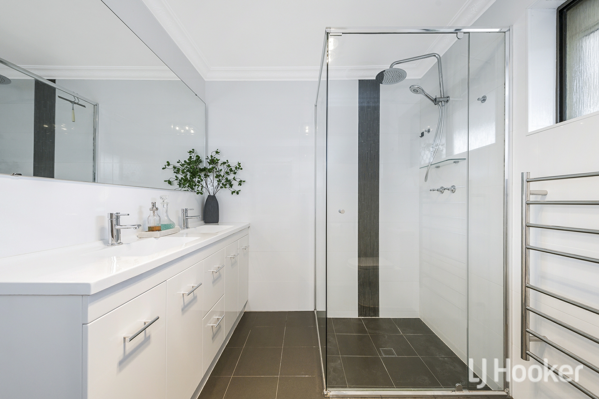 The ground-floor master bedroom is a sanctuary of its own, complete with a full wall of built-ins, backyard and firepit access, and a beautifully finished ensuite with twin vanities, rain shower head, heated towel rails and heat lamps.