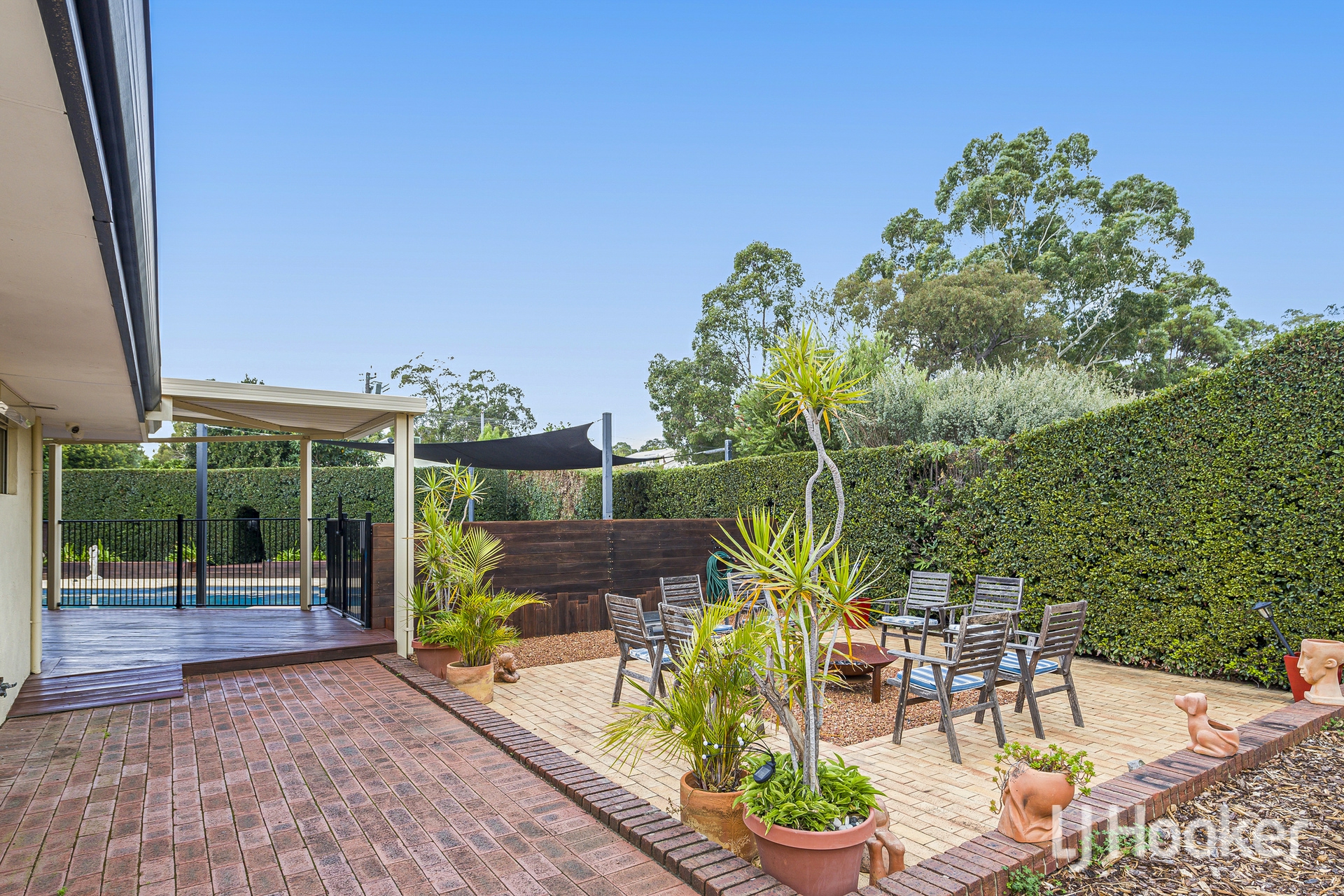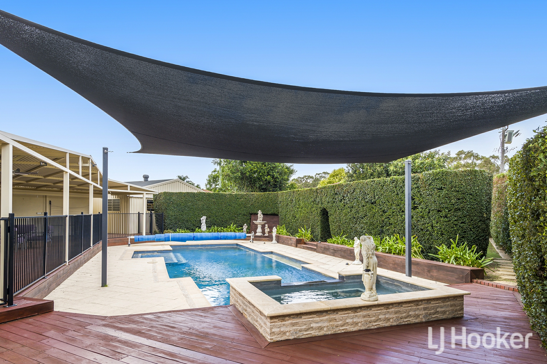 Step outside, and the home truly comes alive. An expansive pitched patio overlooks a heated below-ground pool with a waterfall feature, alongside a bubbling outdoor spa under a shade sail and surrounded by well-manicured hedges.