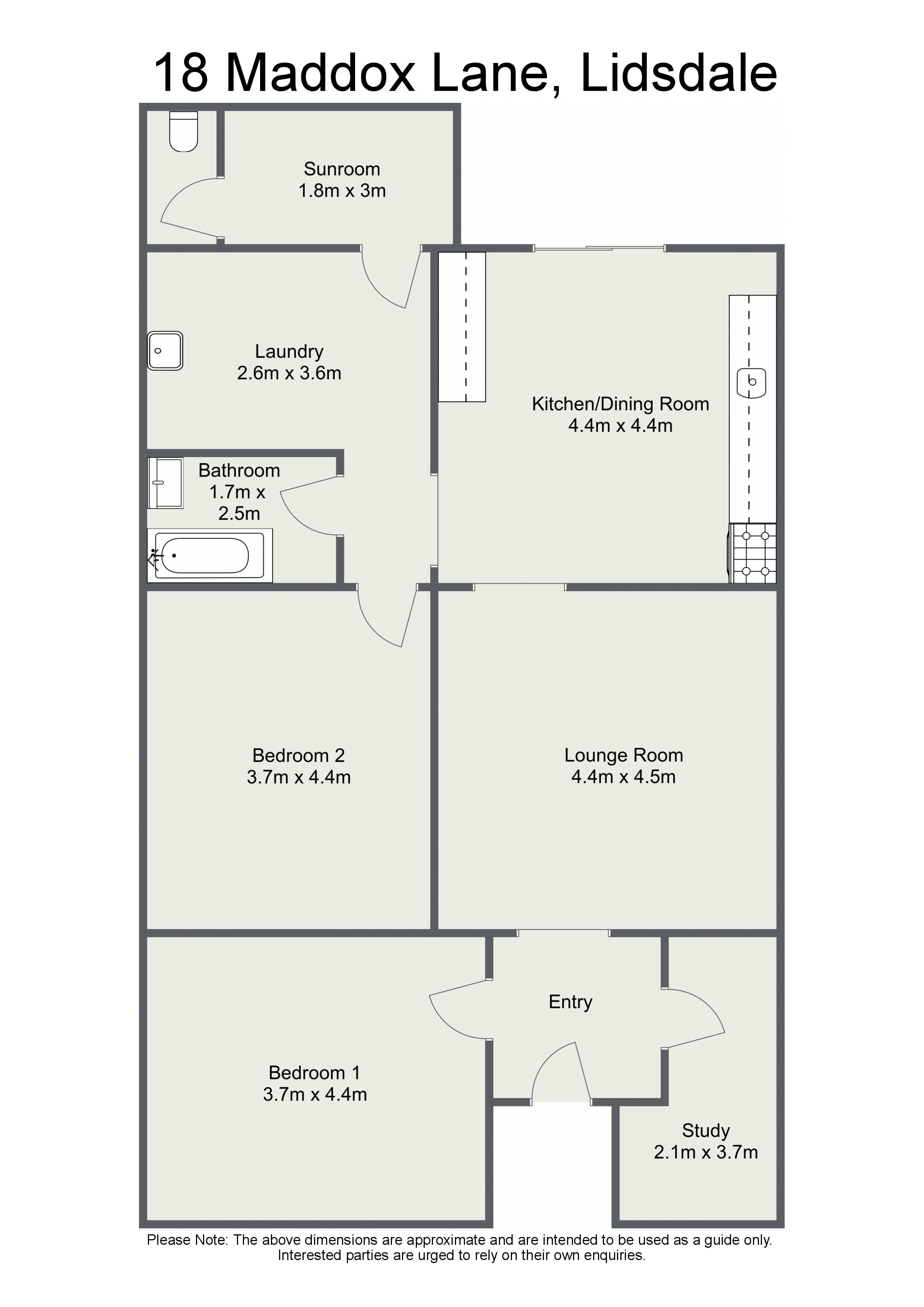 The floor plan features 2 large bedrooms and a study, eat-in kitchen with LP gas stove, a neat bathroom, a lounge room with cosy wood burner, and a small rear sunroom.