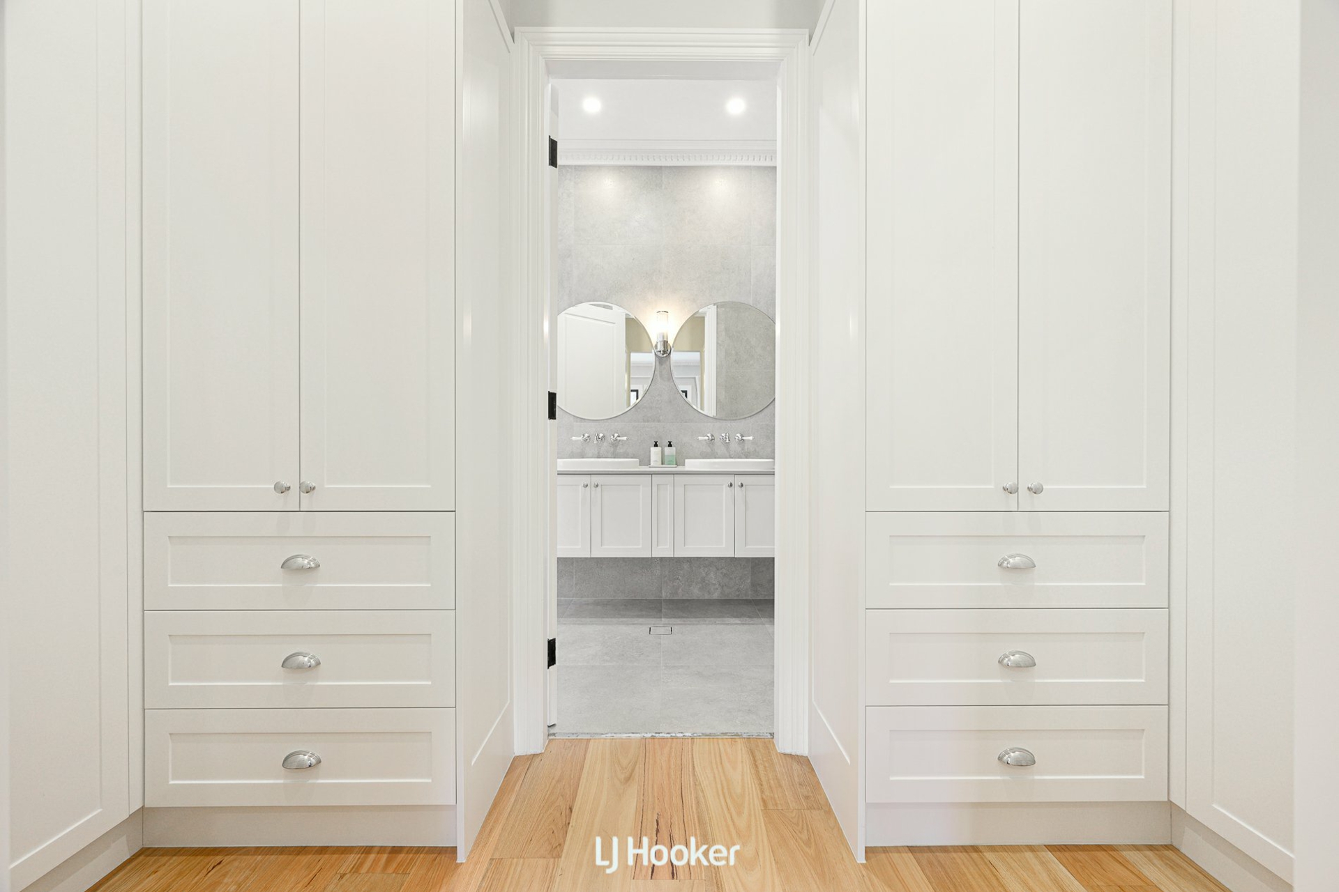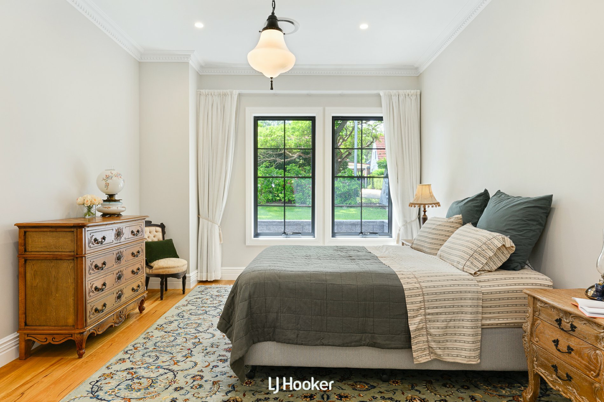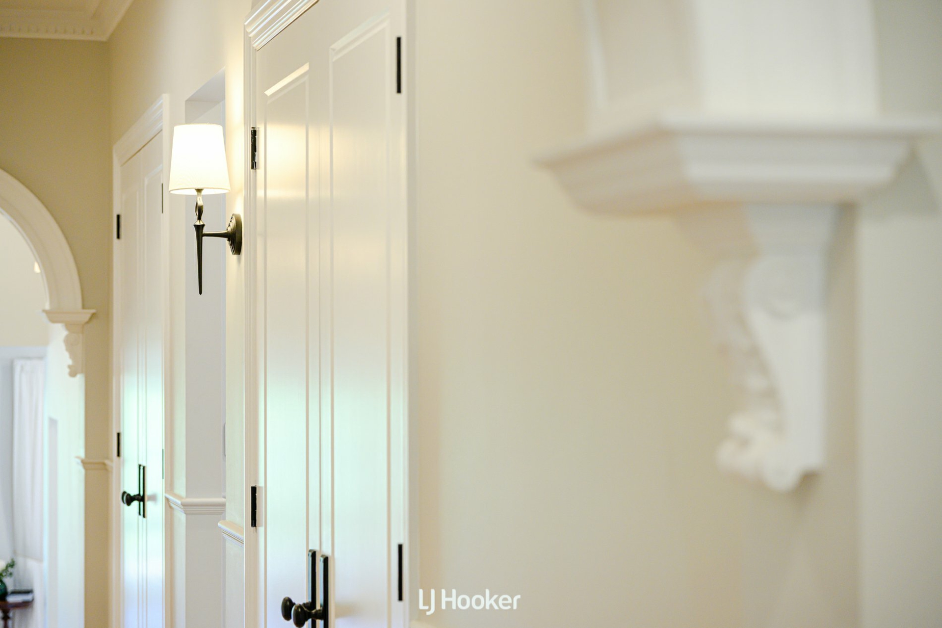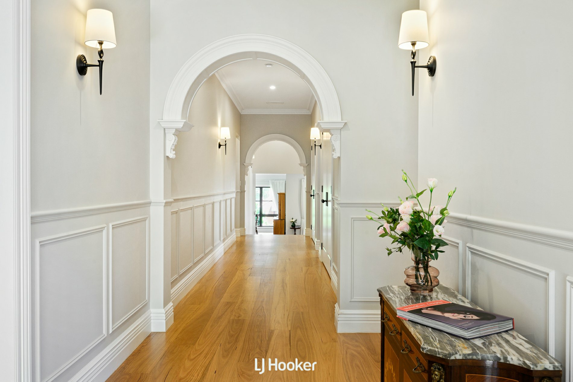 Step inside and the atmosphere is one of warmth and quiet luxury. Blackbutt hardwood floors flow seamlessly underfoot, while 3-meter-high ceilings and detailed wainscoting frame arched hallways adorned with ceiling roses. Designer chandeliers shimmer above the living spaces, complemented by Kate Spade wall sconces that cast a soft, ambient glow. Every finish feels considered, every space intentional.