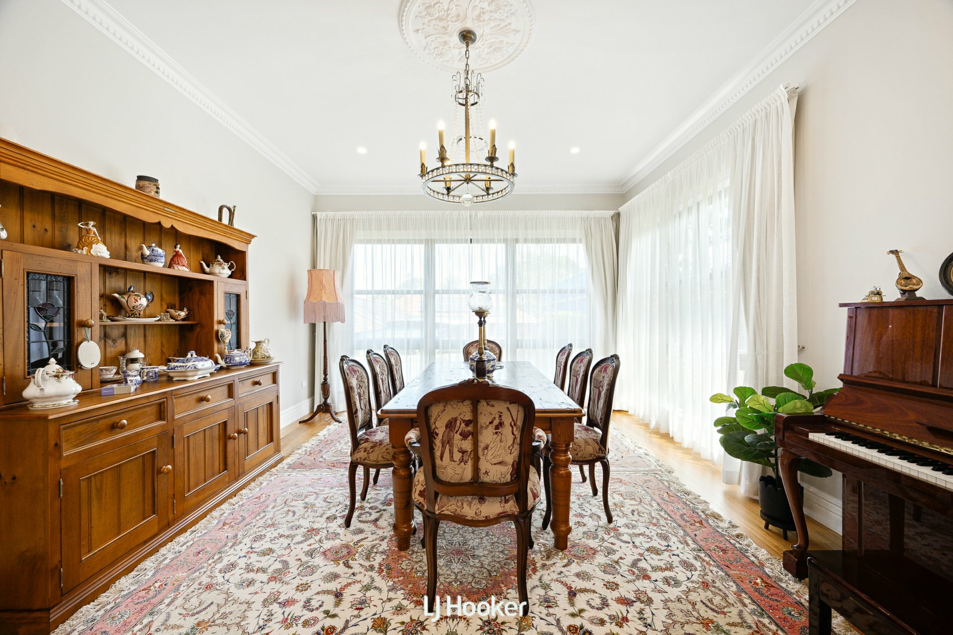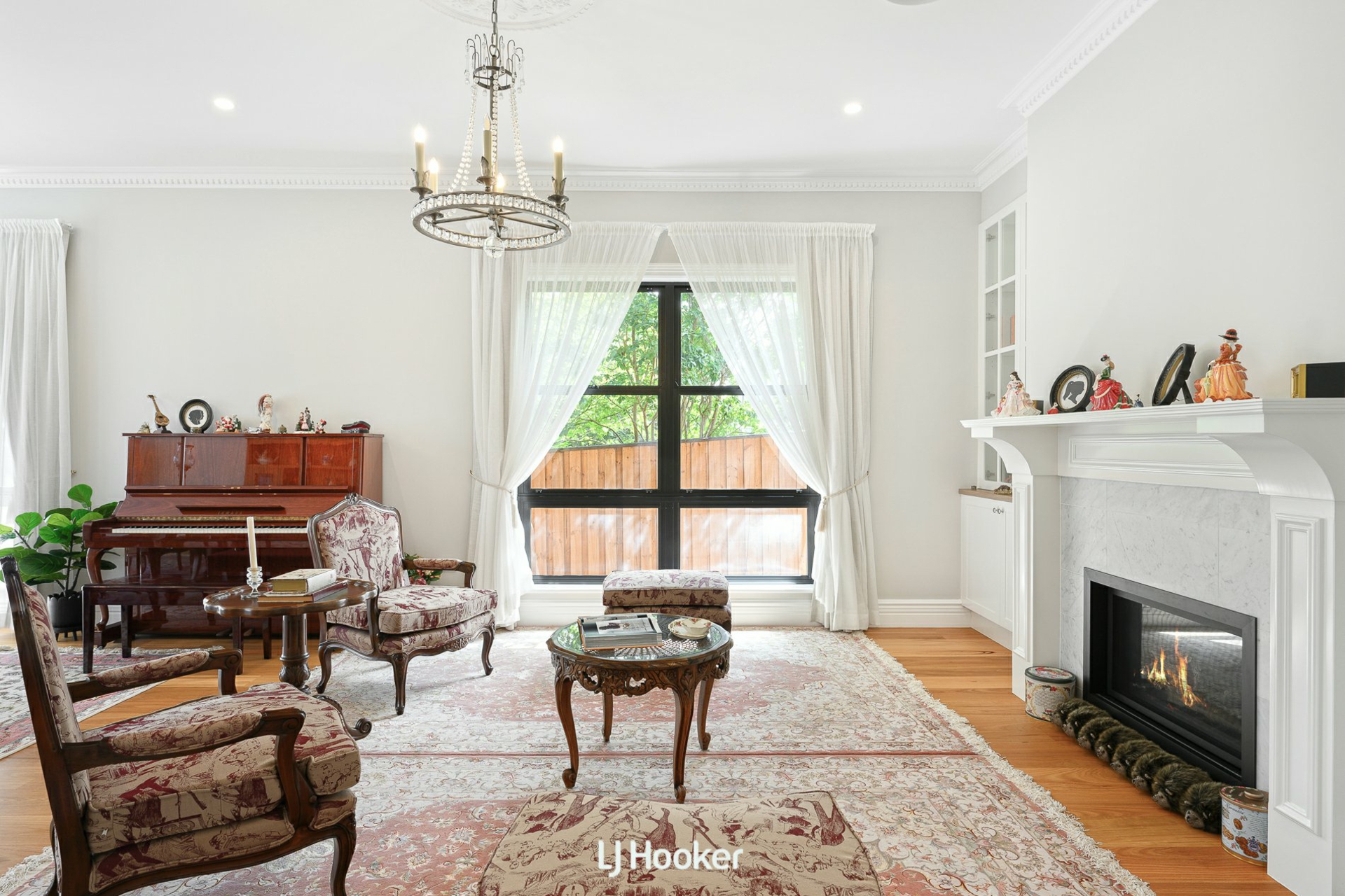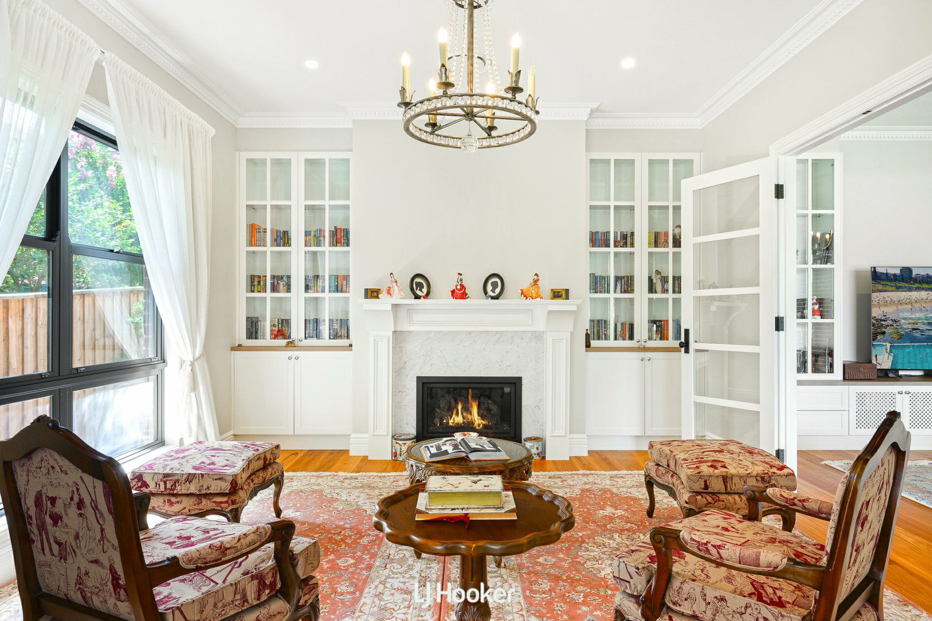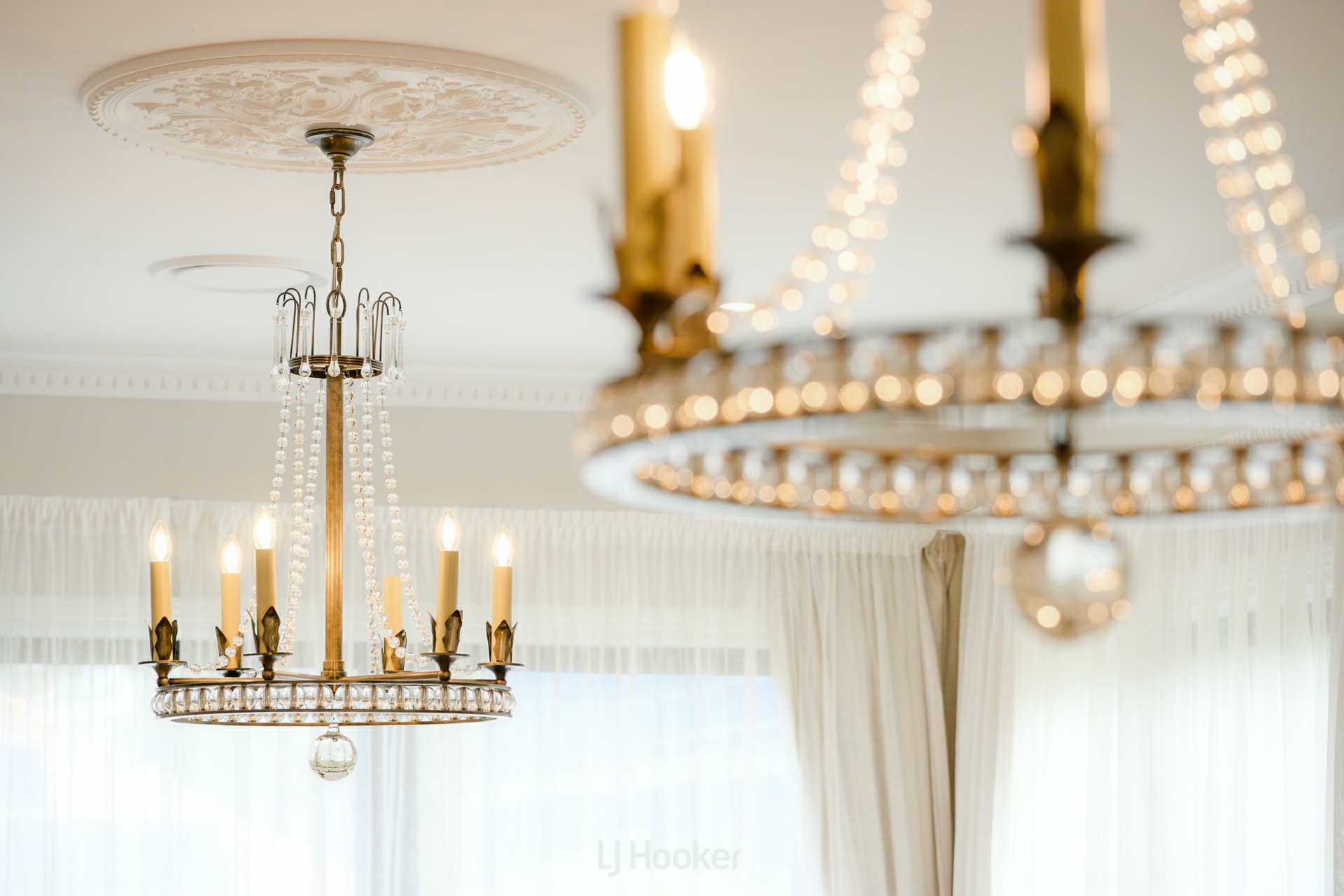 - Formal lounge and dining with chandeliers and bespoke cabinetry