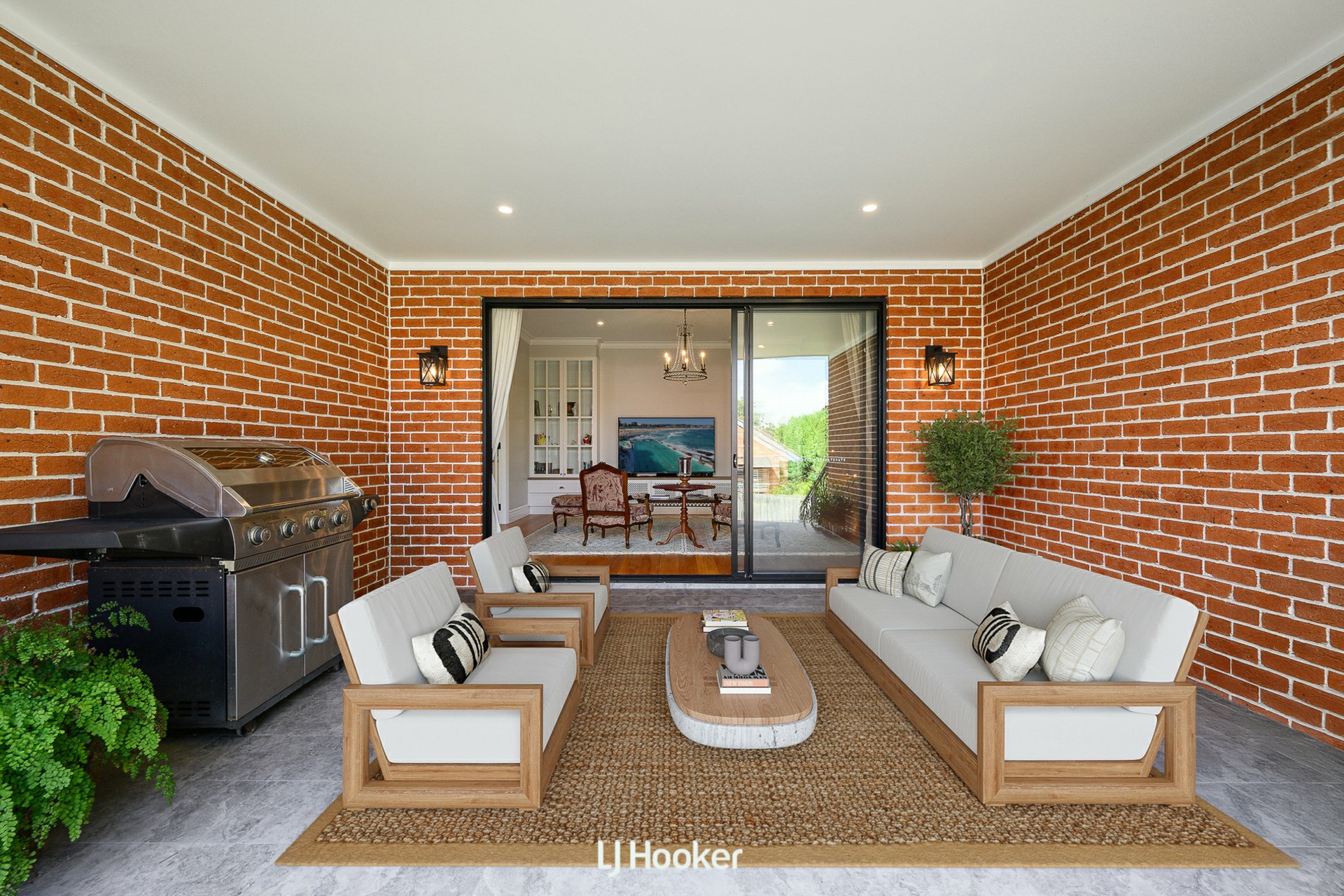 - Covered alfresco flowing to level, sunlit grassed backyard