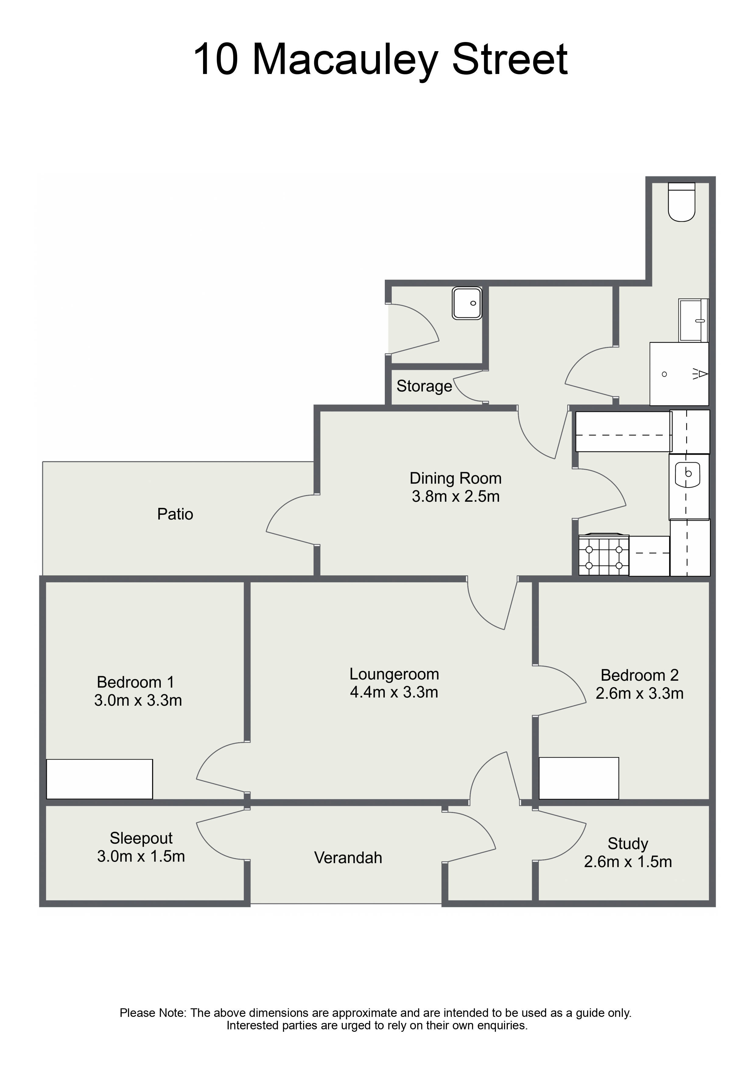 The internal layout consists of 2 bedrooms (both with built-in wardrobes), study and front sleepout, living room with split system A/C, separate dining room, modern kitchenette, tiled bathroom and external laundry.