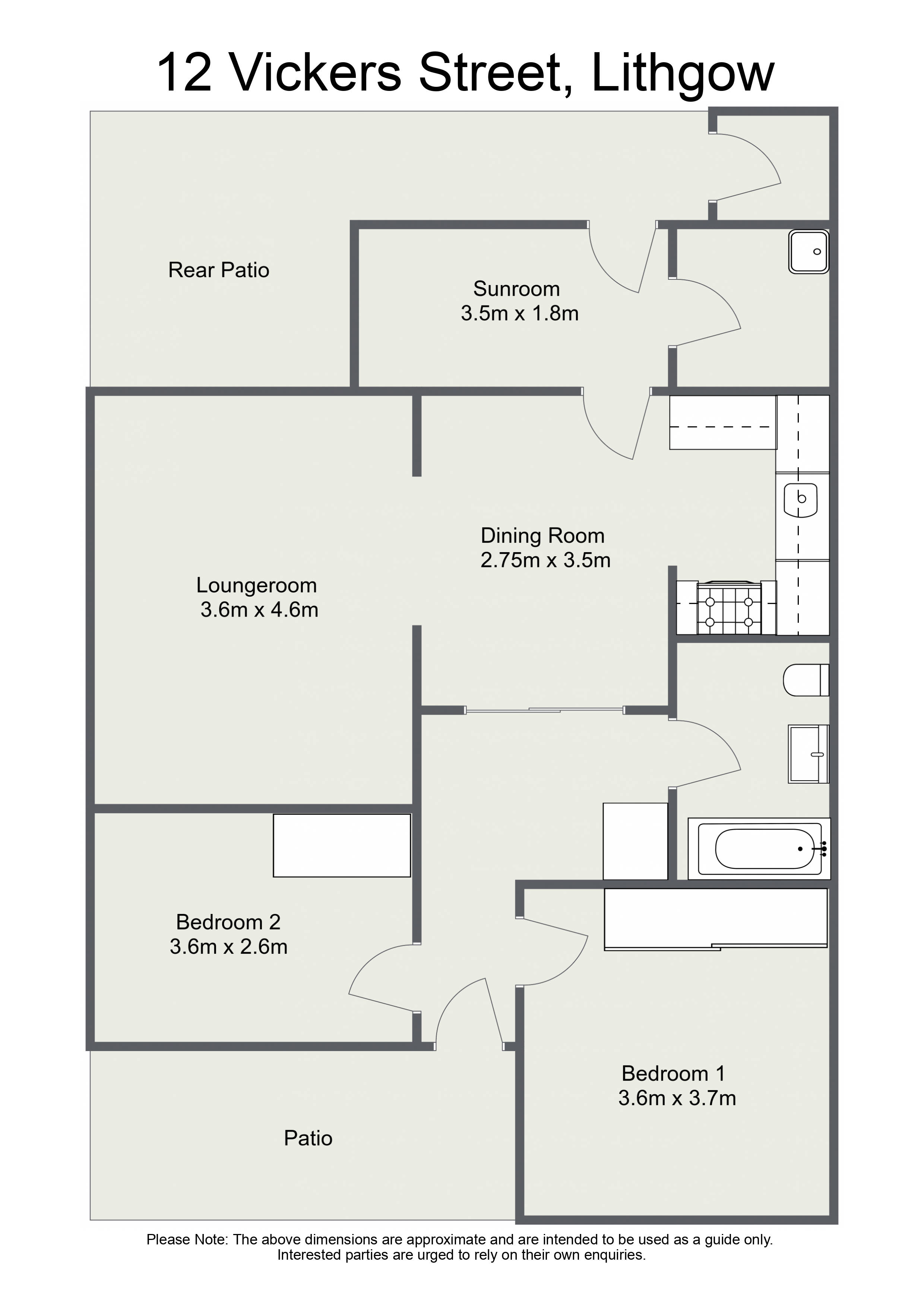 The home offers 2 large bedrooms with built-in wardrobes, a modern laminate kitchen with electric stove, a spacious lounge room with gas heater, a dining room, a neat bathroom, and a rear sunroom/study.