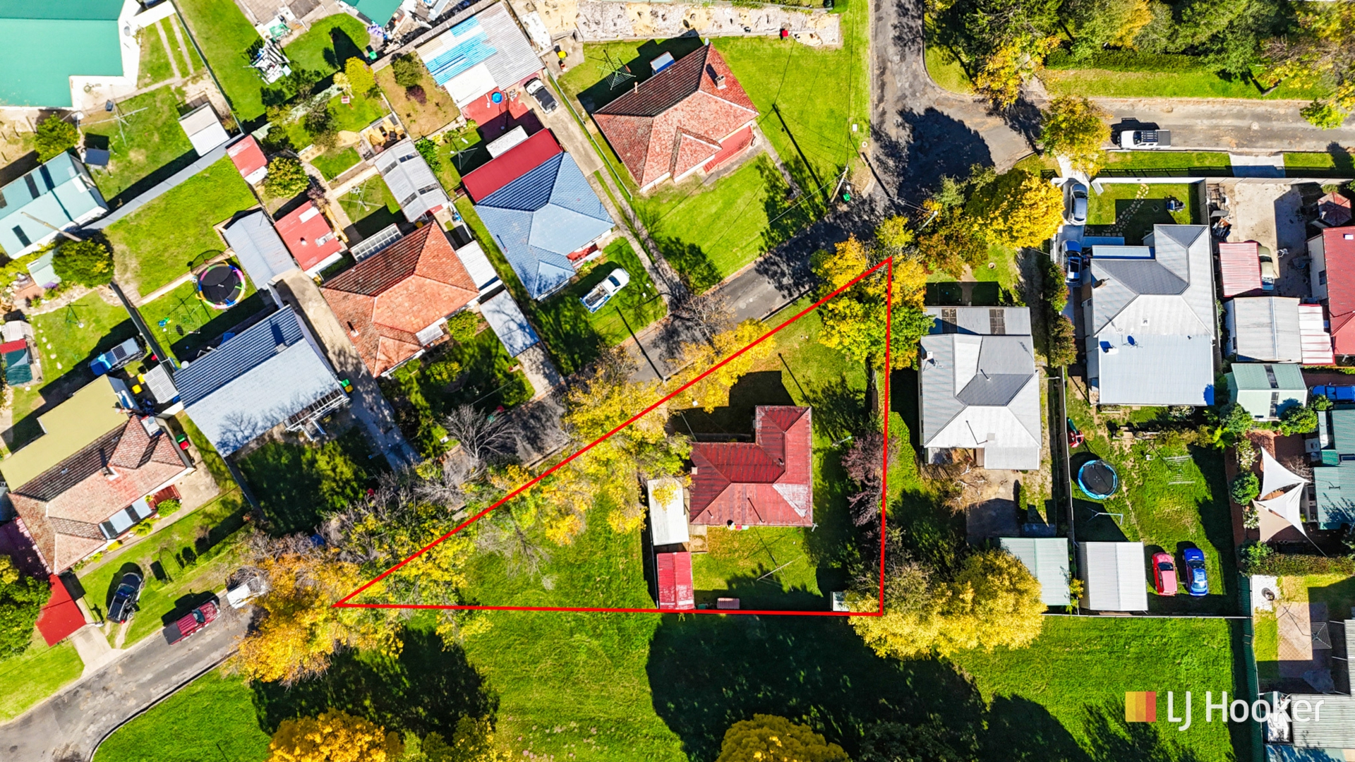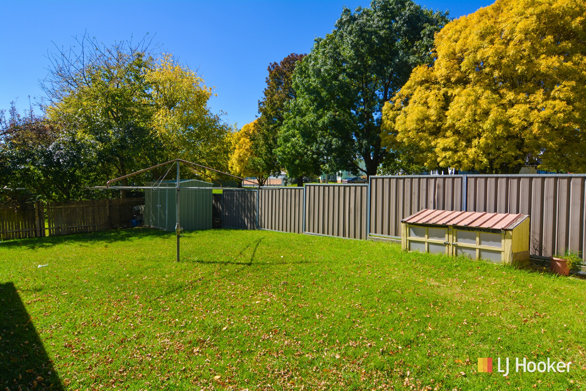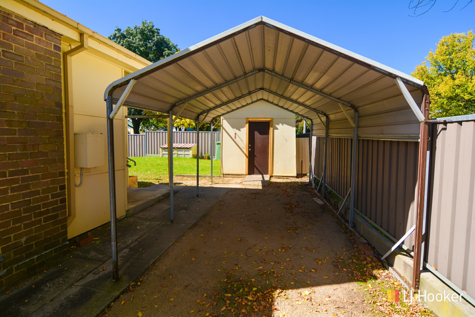 The yard is level with front access to a single carport, lock-up workshop, and a garden shed.