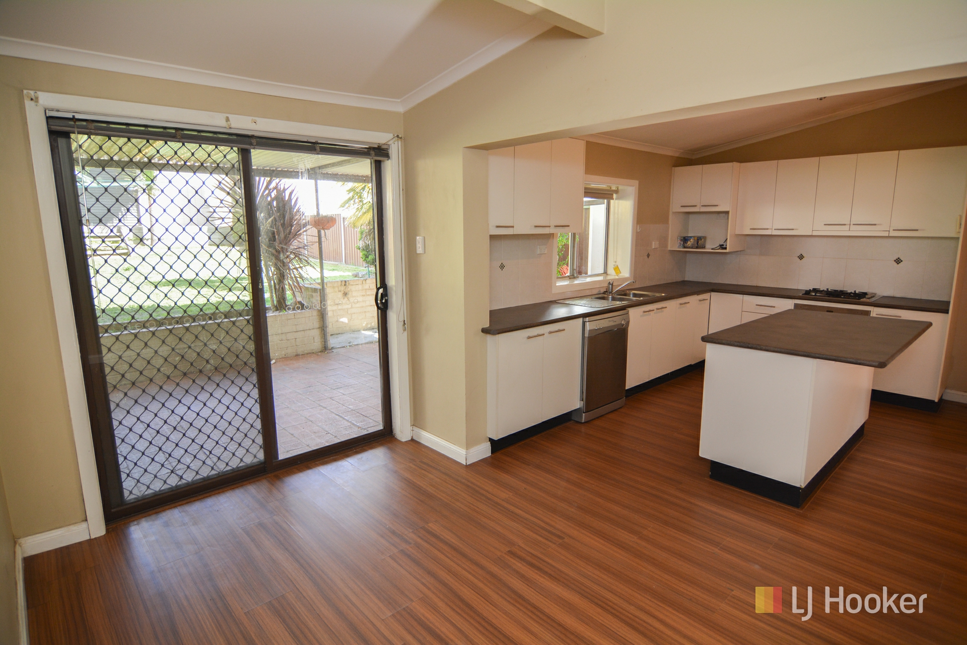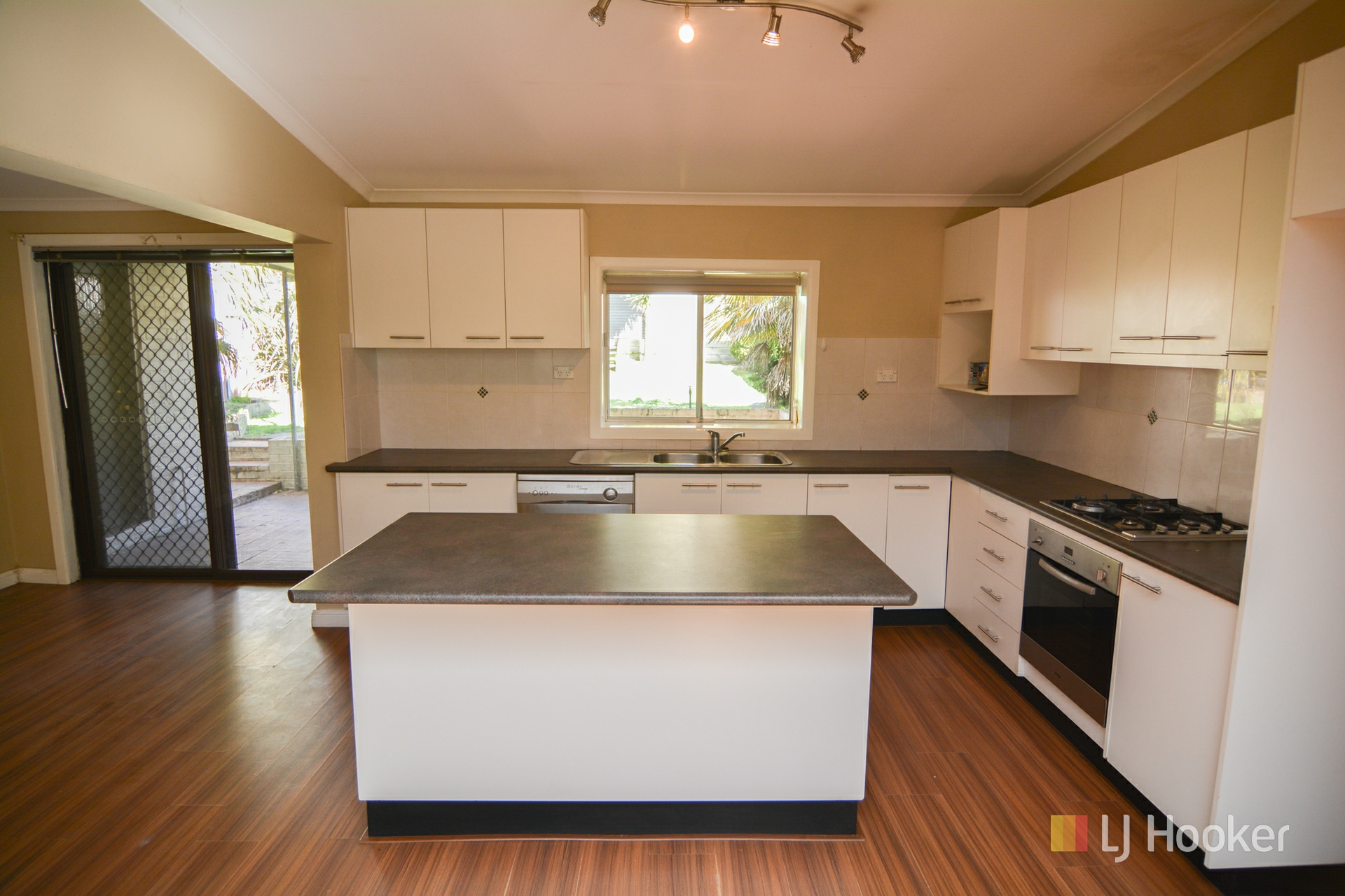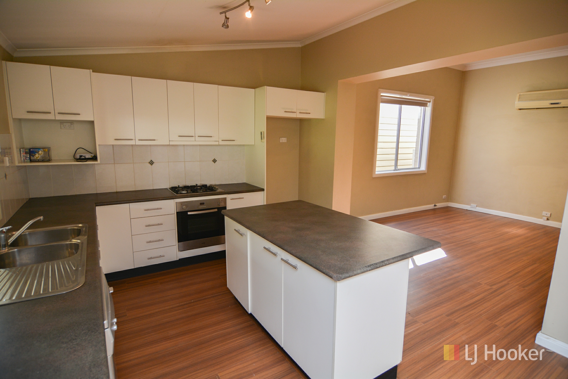 The floor plan features 4 bedrooms, modern kitchen with gas stove, dishwasher, and island bench, an open plan living room with split system A/C, and a large modern bathroom.