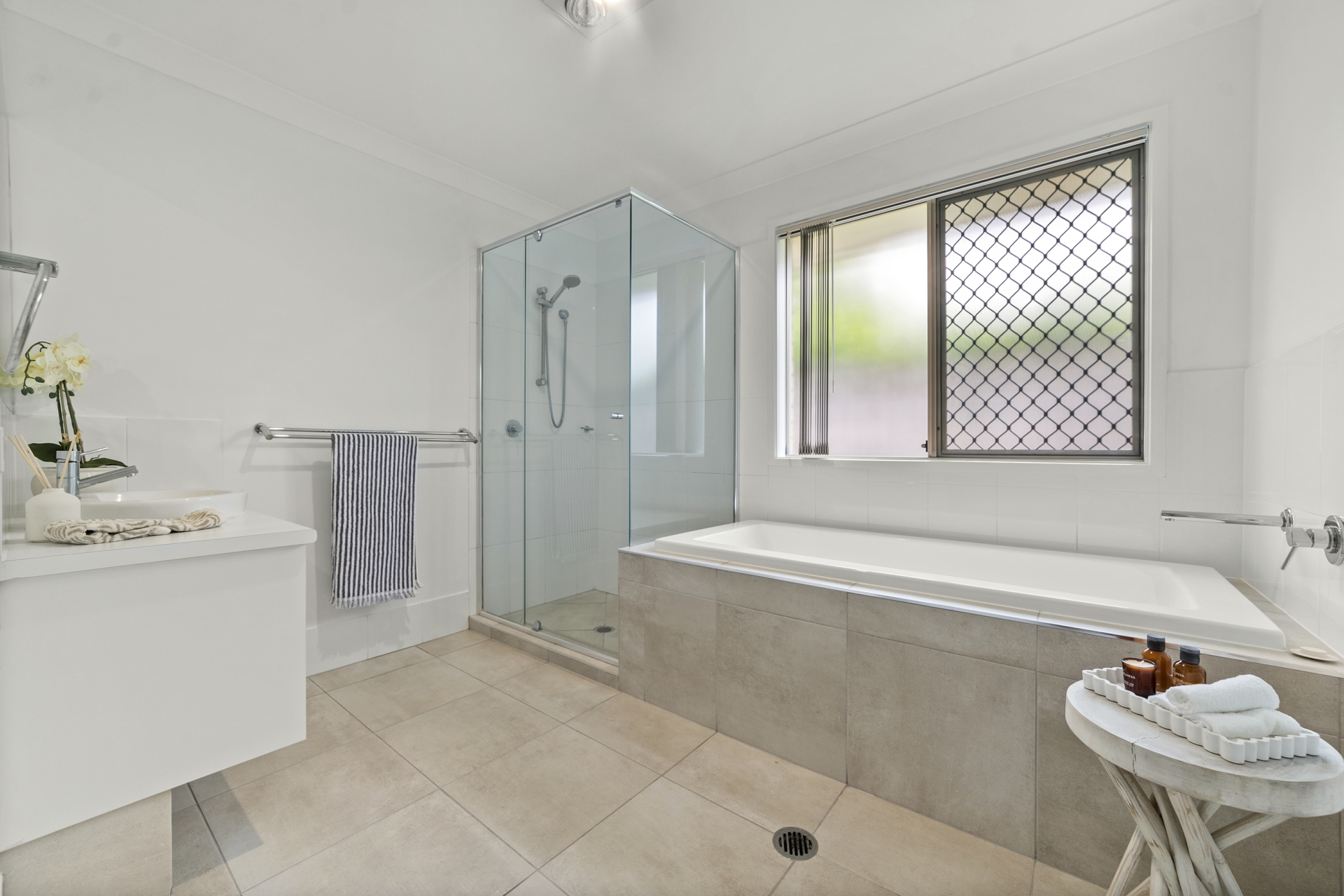 • Contemporary Bathrooms: Bathrooms showcase floor-to-ceiling tiles, modern vanities, and the main includes a full-size bathtub.