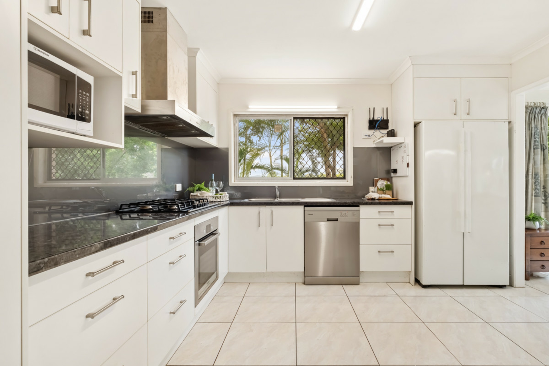 The renovated kitchen features a new dishwasher, gas cooktop, a pyrolytic oven, ample cupboards, double fridge space, and plenty of space to add an island bench.