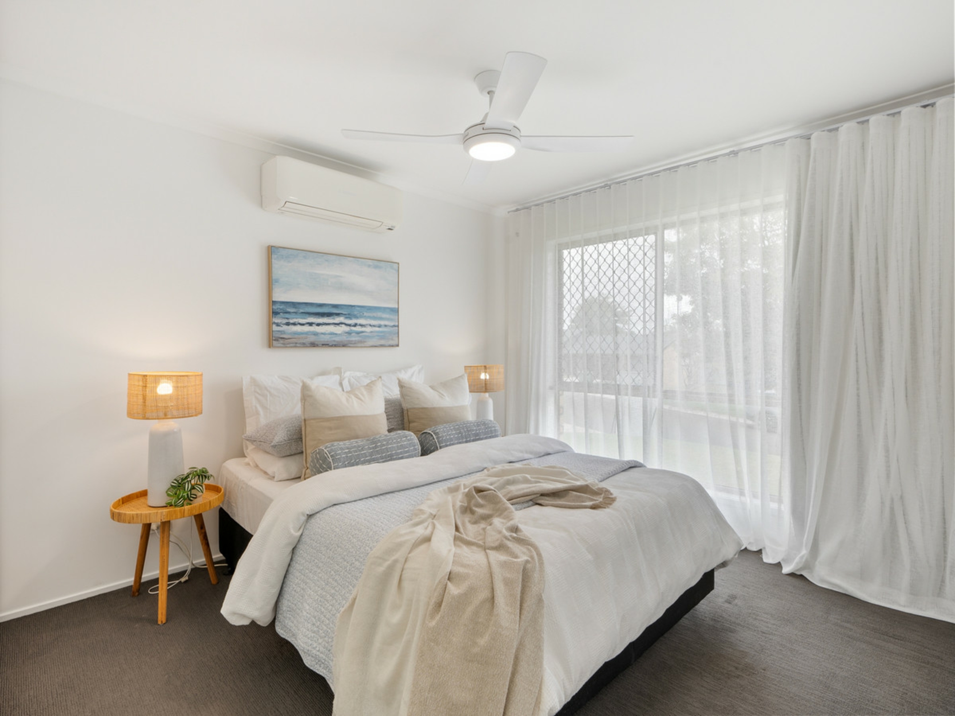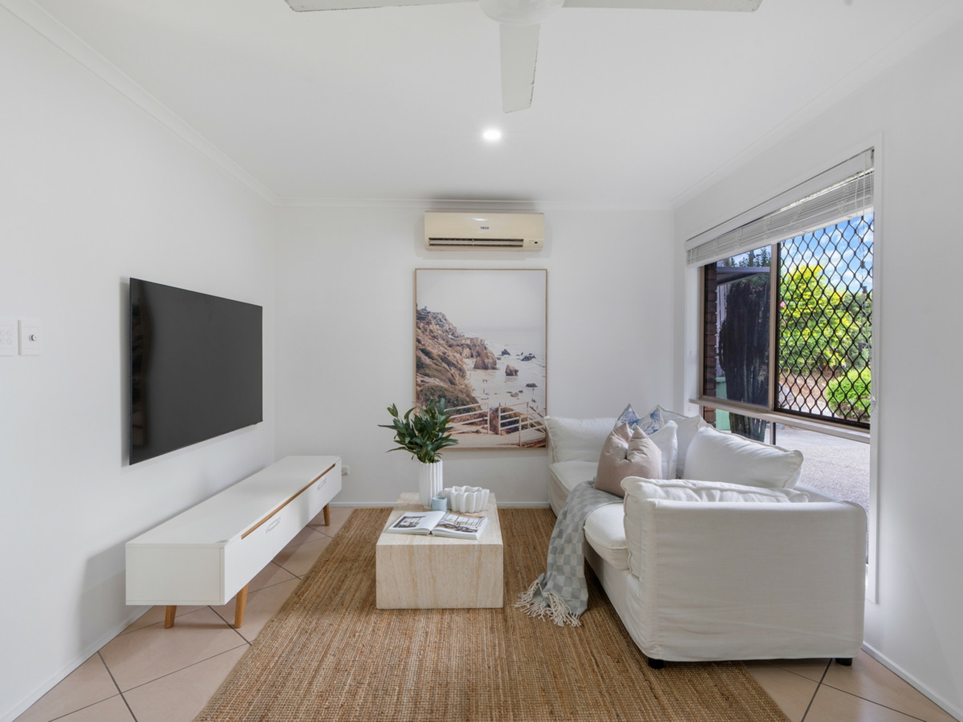 Inside, you'll find a light-filled interior featuring a modern kitchen, freshly painted walls, and a stylishly renovated bathroom. Comfort is assured year-round with air conditioning and ceiling fans throughout the home.