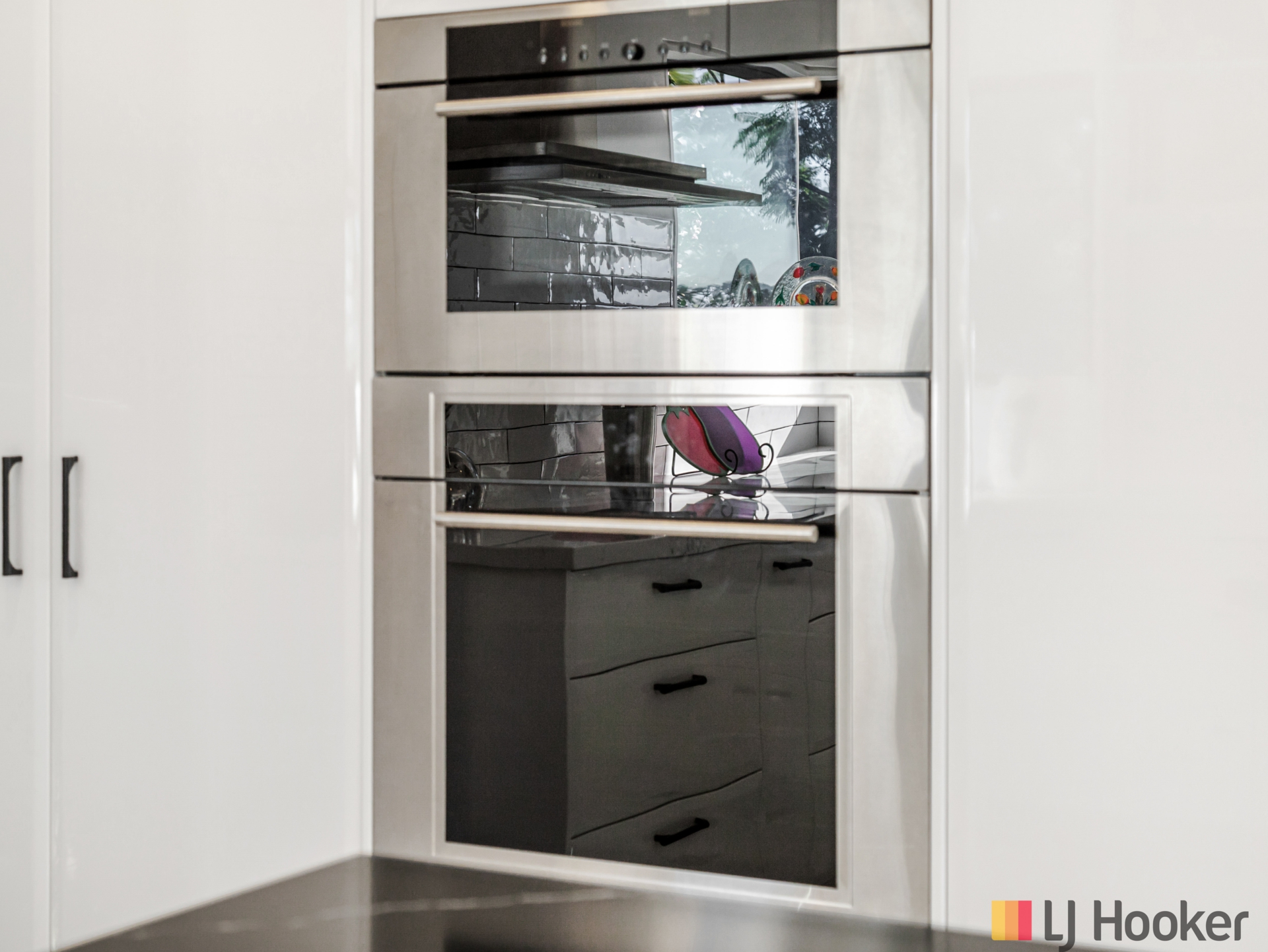 The oversized kitchen is where it really starts to impress, it envelopes you with features. A central island bench with waterfall stone tops, soft-close drawers and under-bench power points, while the main body of the kitchen, finished in Caesarstone, flows across three sides. You've got a 900mm Wolf pyrolytic oven, a matching steam oven, Siemens induction cooktop and an AEG dishwasher with lift-up function - all complemented by a large fridge space with water supply. It's a serious kitchen in every sense.