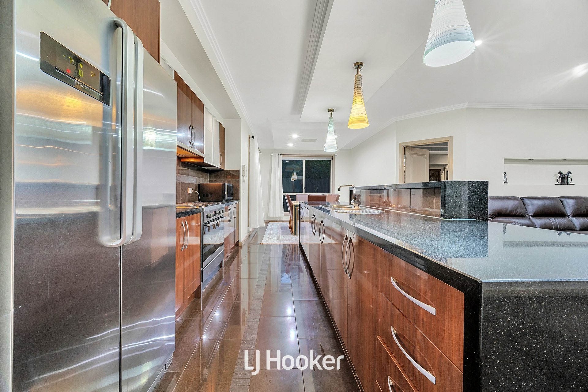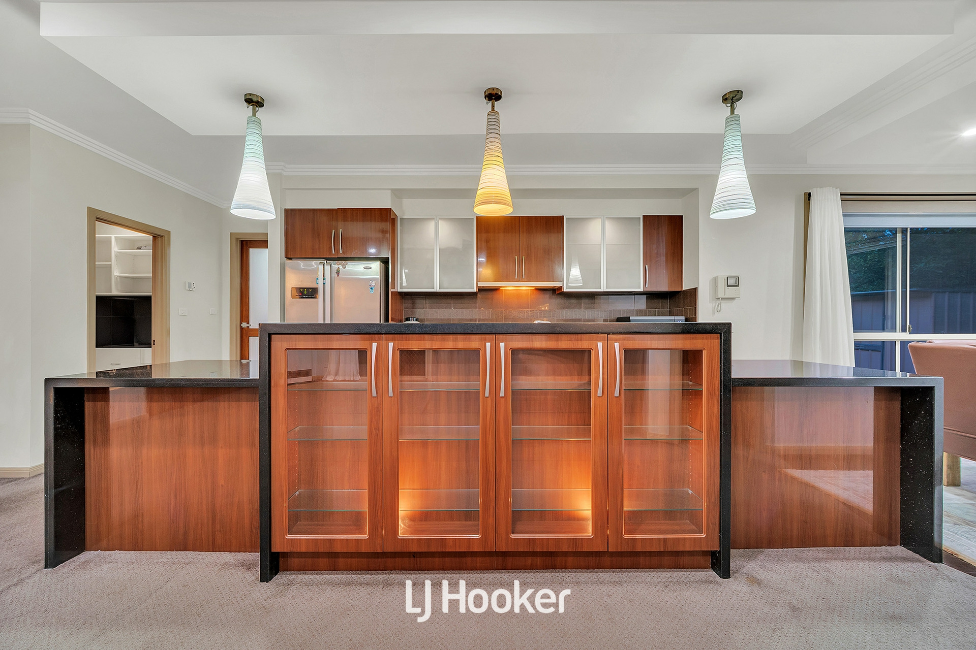 -Central open-plan kitchen with island bench and butler's pantry