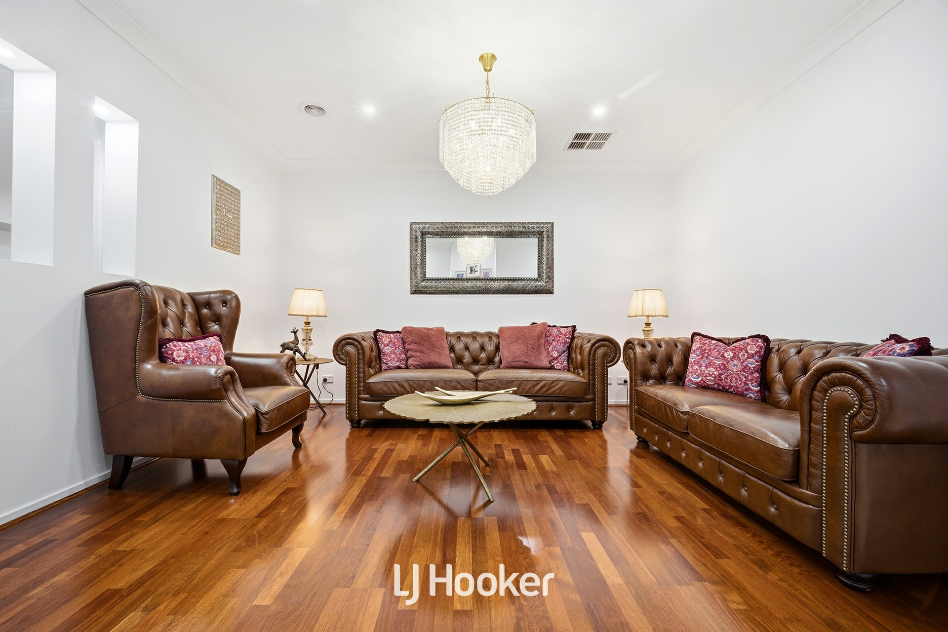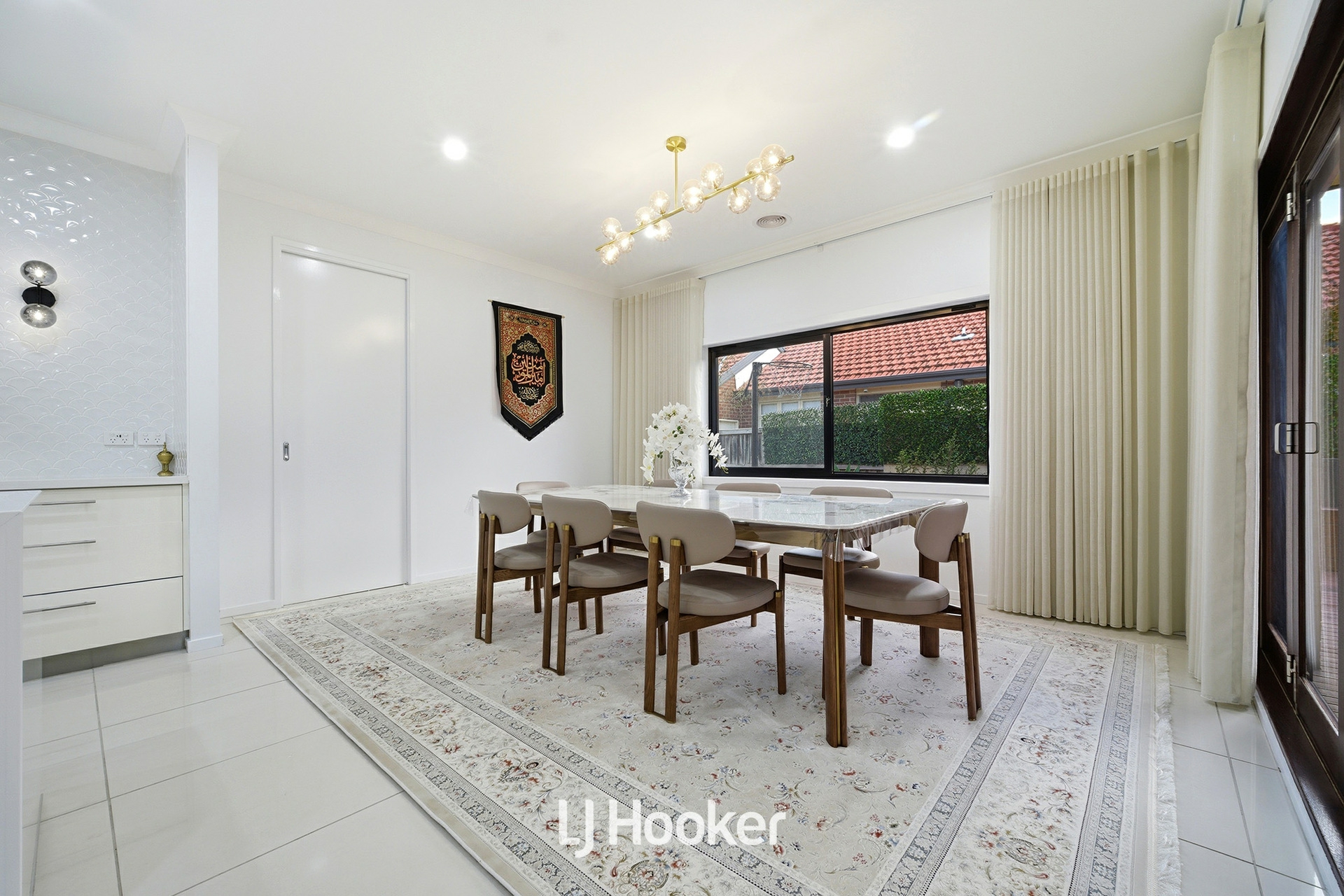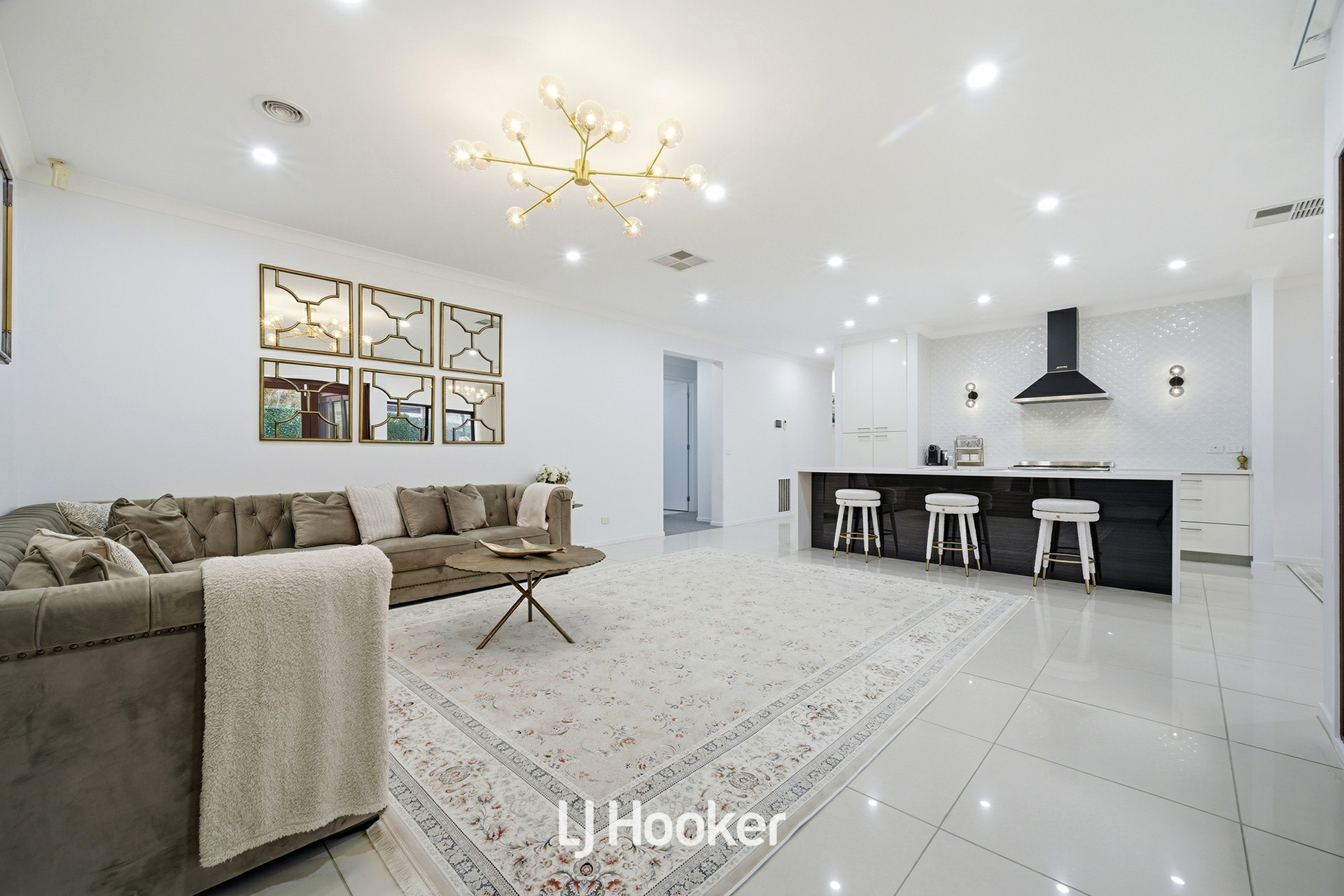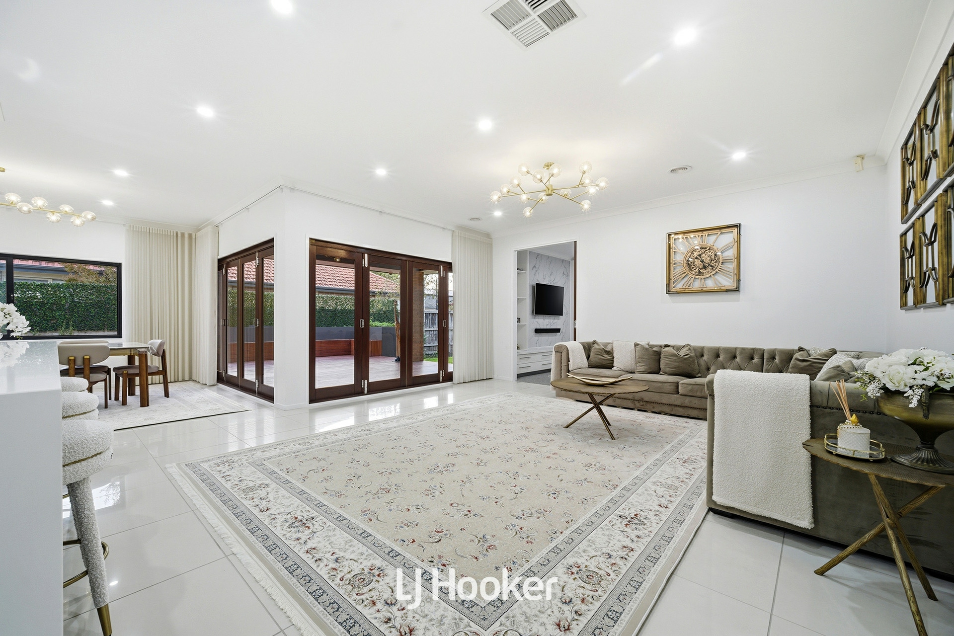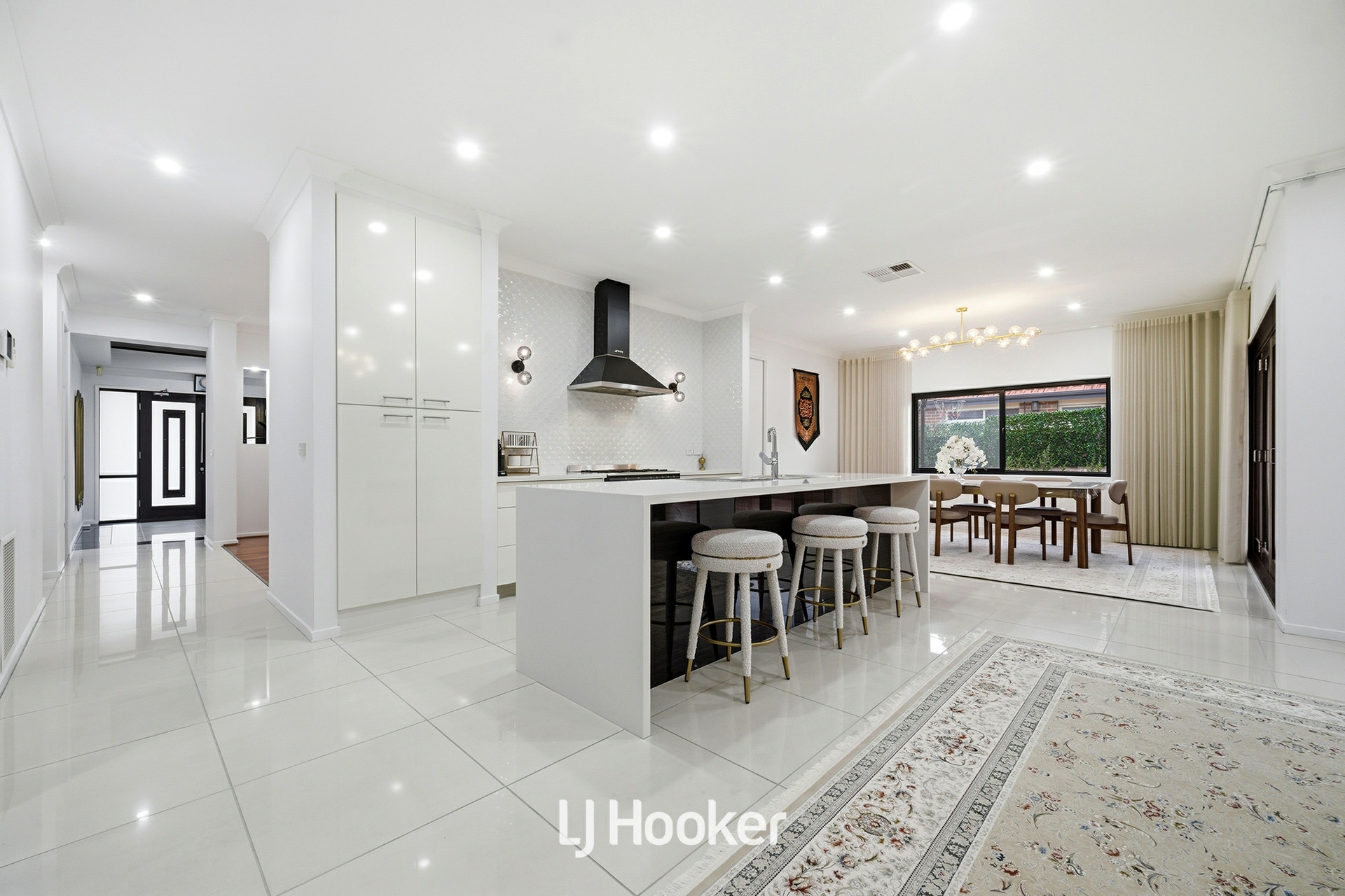 Upon entry, you are immediately welcomed by a sense of scale and elegance, enhanced by impressive 2.7m high ceilings and stylish downlights throughout. The formal lounge, beautifully appointed with exquisite chandeliers, offers a refined space for relaxation, while the expansive open-plan family and dining area forms the heart of the home, designed for both everyday living and impressive entertaining.