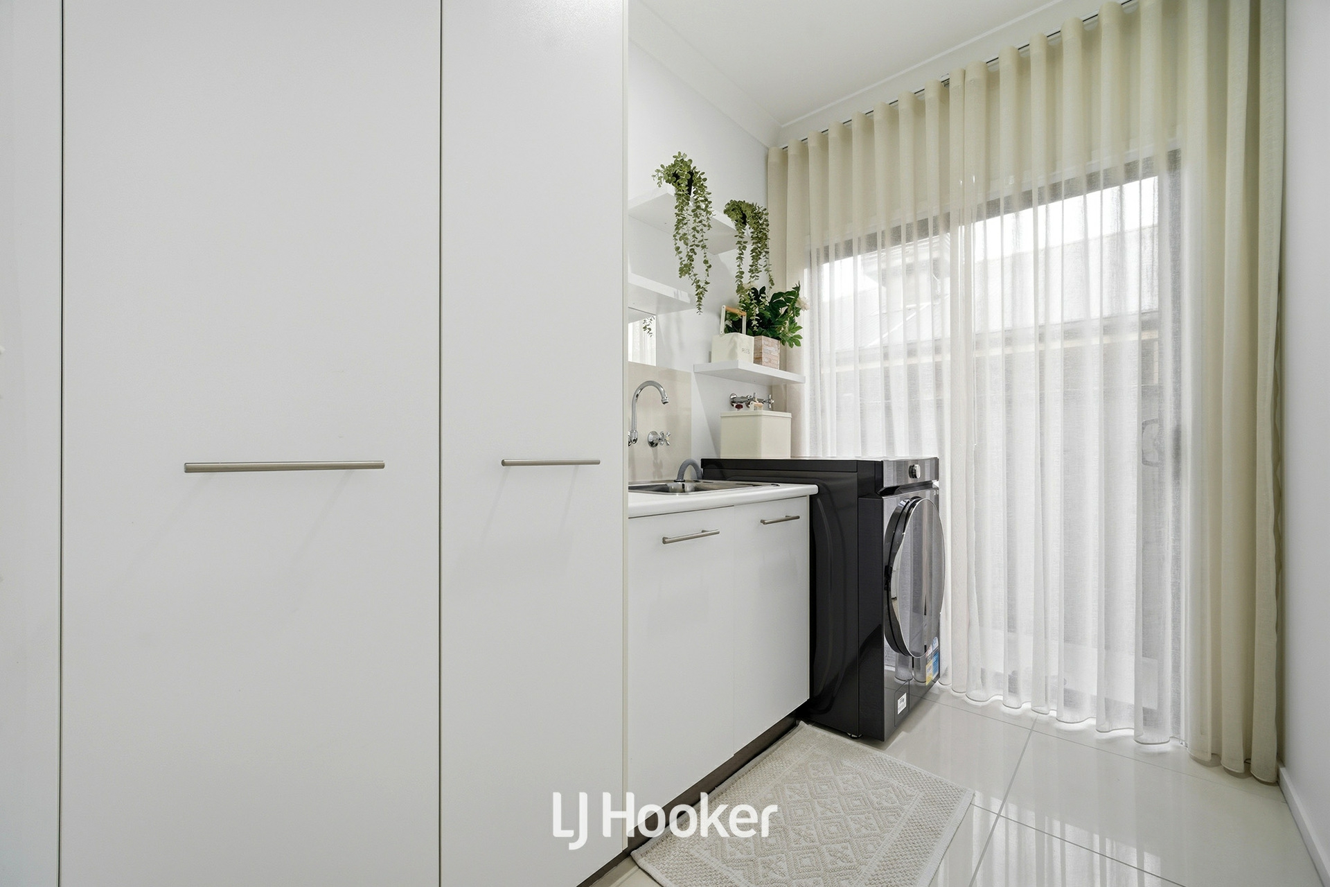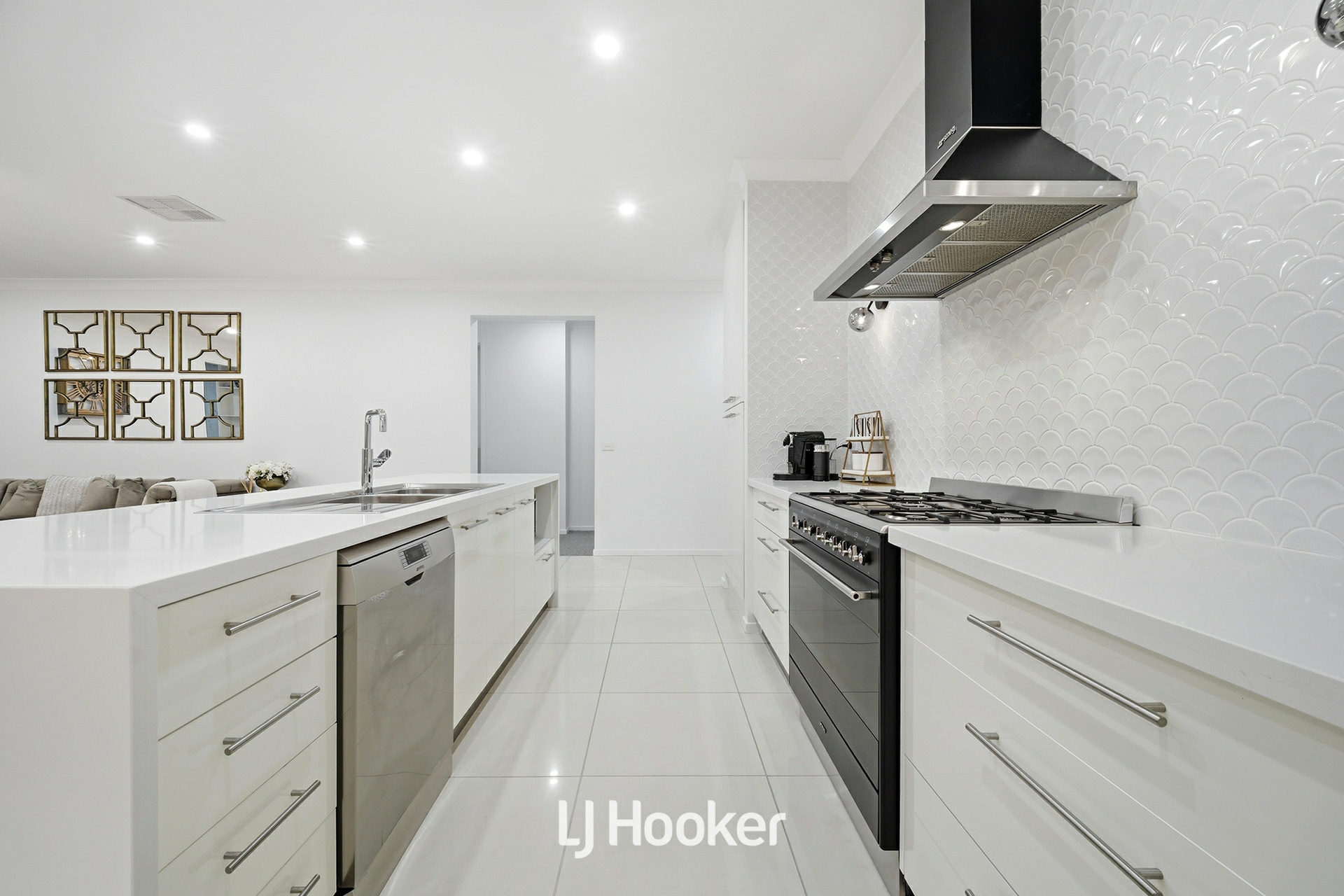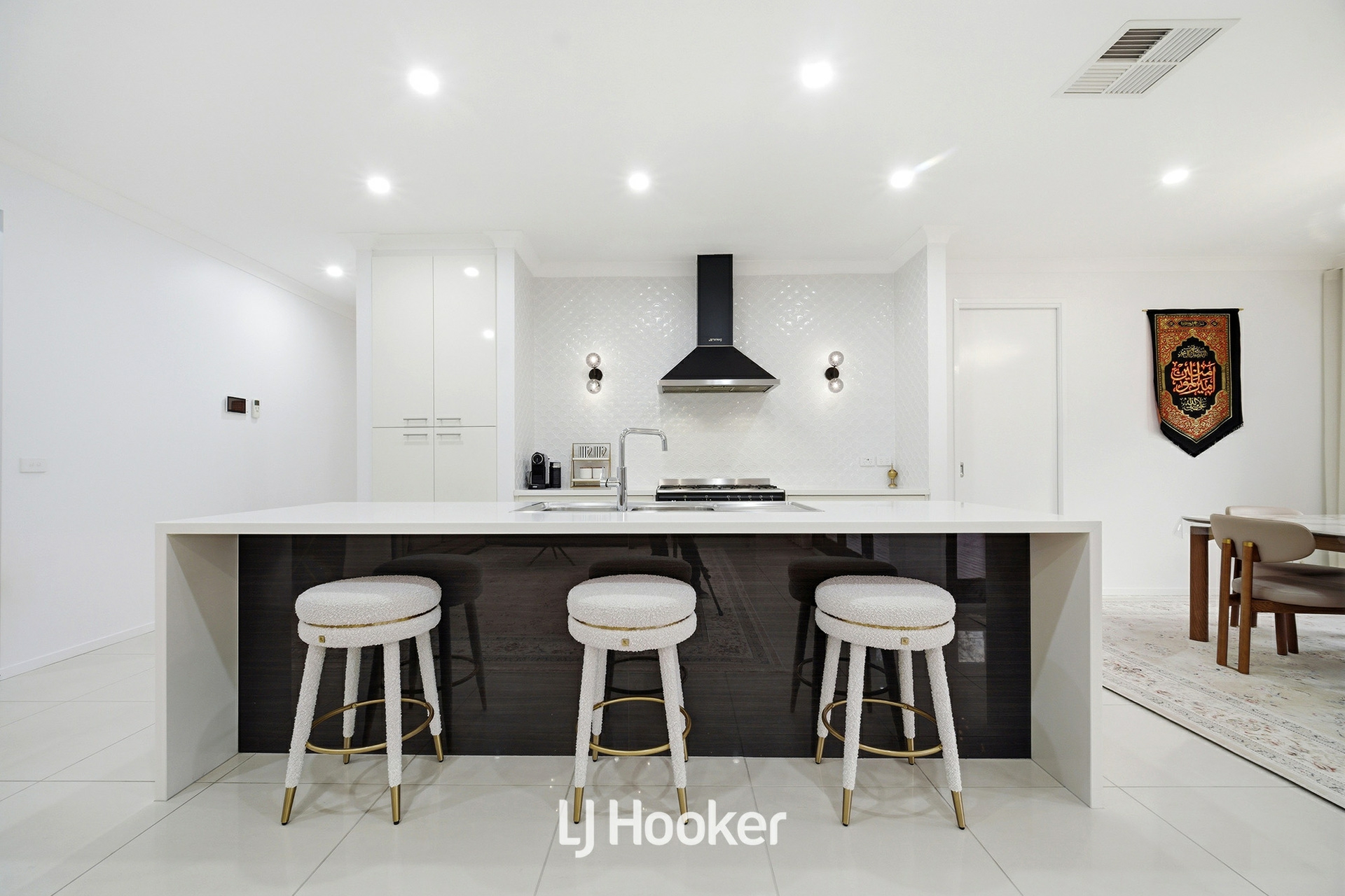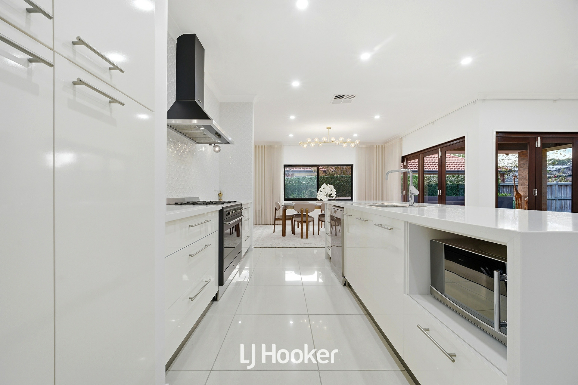 The gourmet kitchen is beautifully appointed with premium Caesarstone benchtops, quality appliances, soft-close cabinetry, and a generous walk-in pantry, seamlessly connecting to the main living zones and creating a central hub for family life.