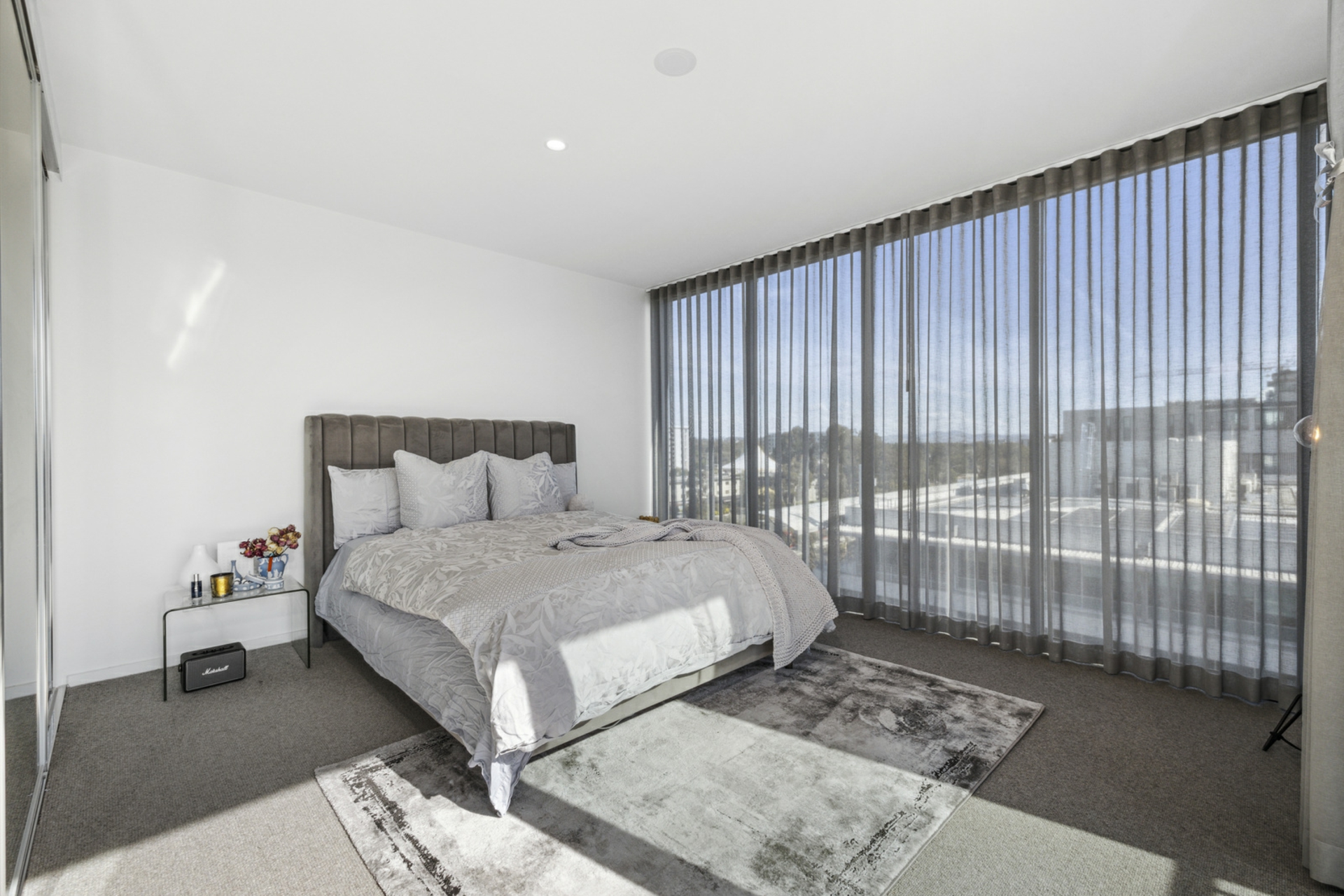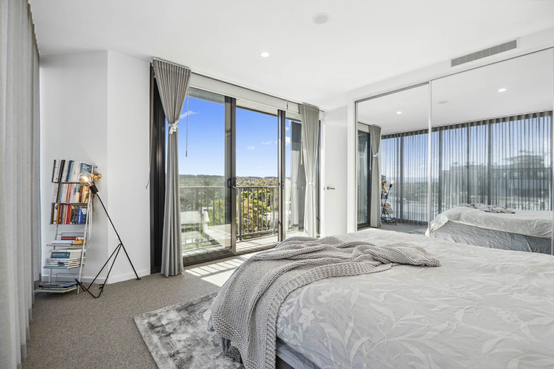 The oversized bedroom boasts generous mirrored built-in robes and large windows embracing the same views, as well as access to the balcony.