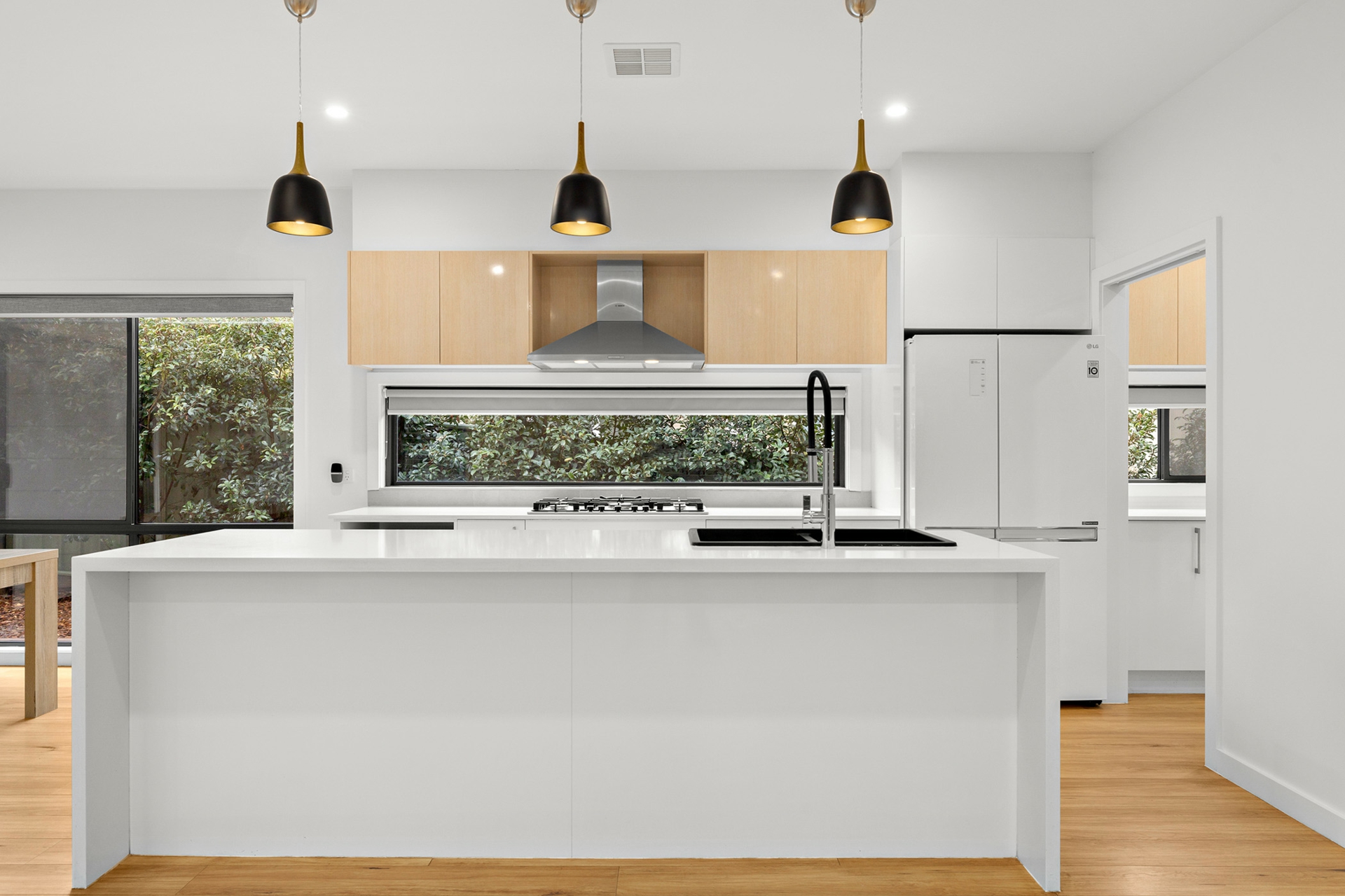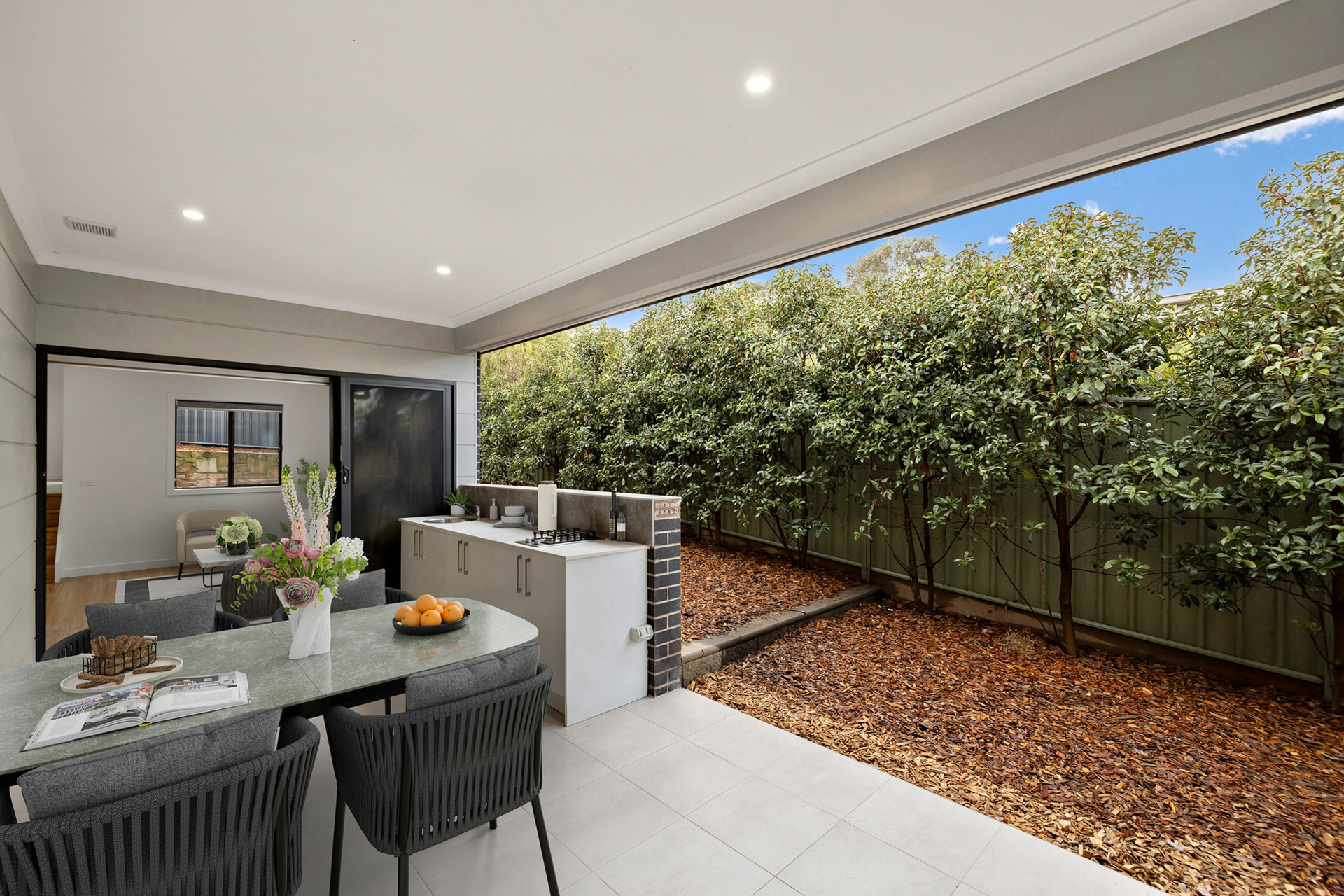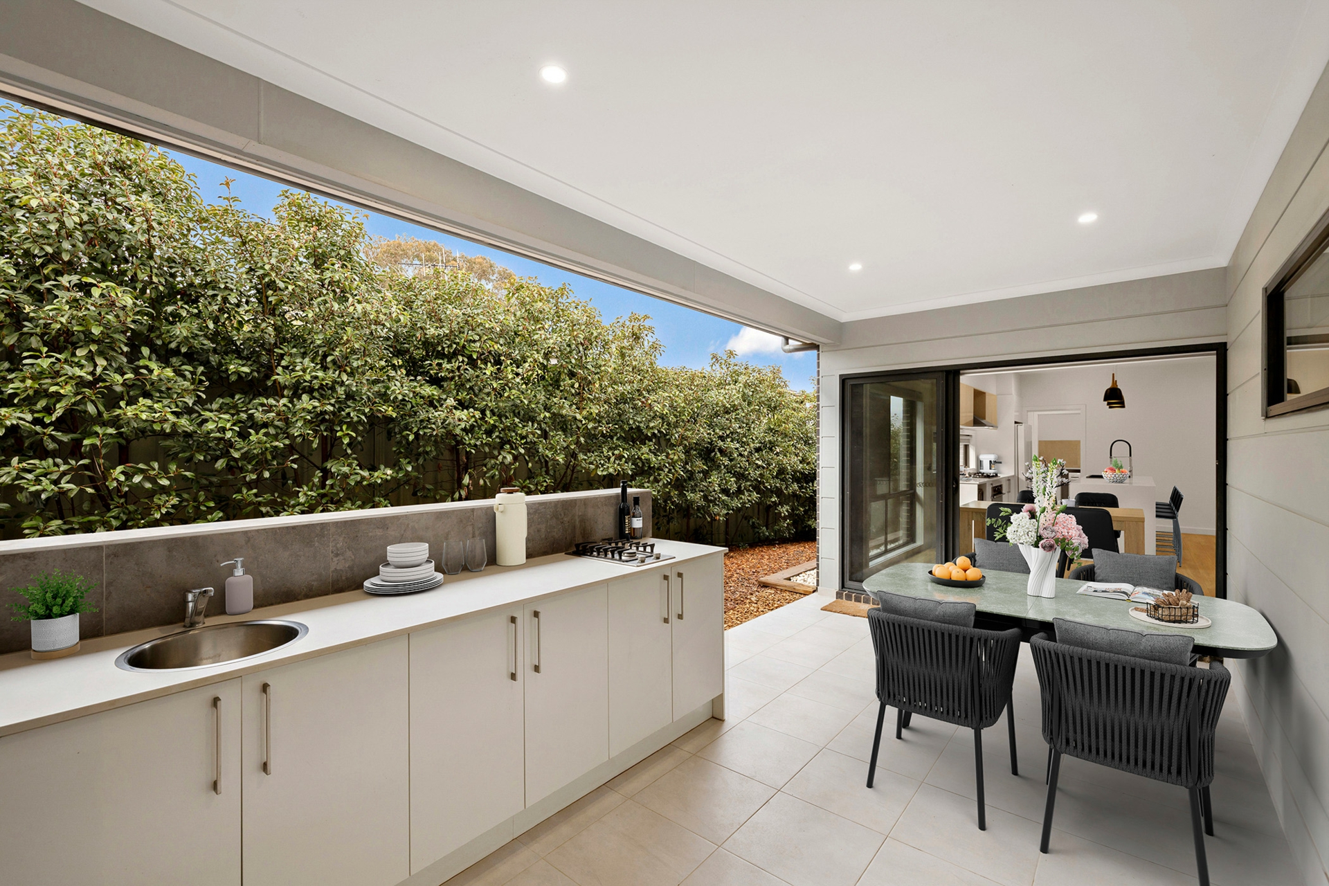 Designed to be the centre of private entertaining bliss, the large alfresco seamlessly integrates with the interior, offering a sun bathed aspect and built in outdoor kitchen with gas cooking, framed by greenery.