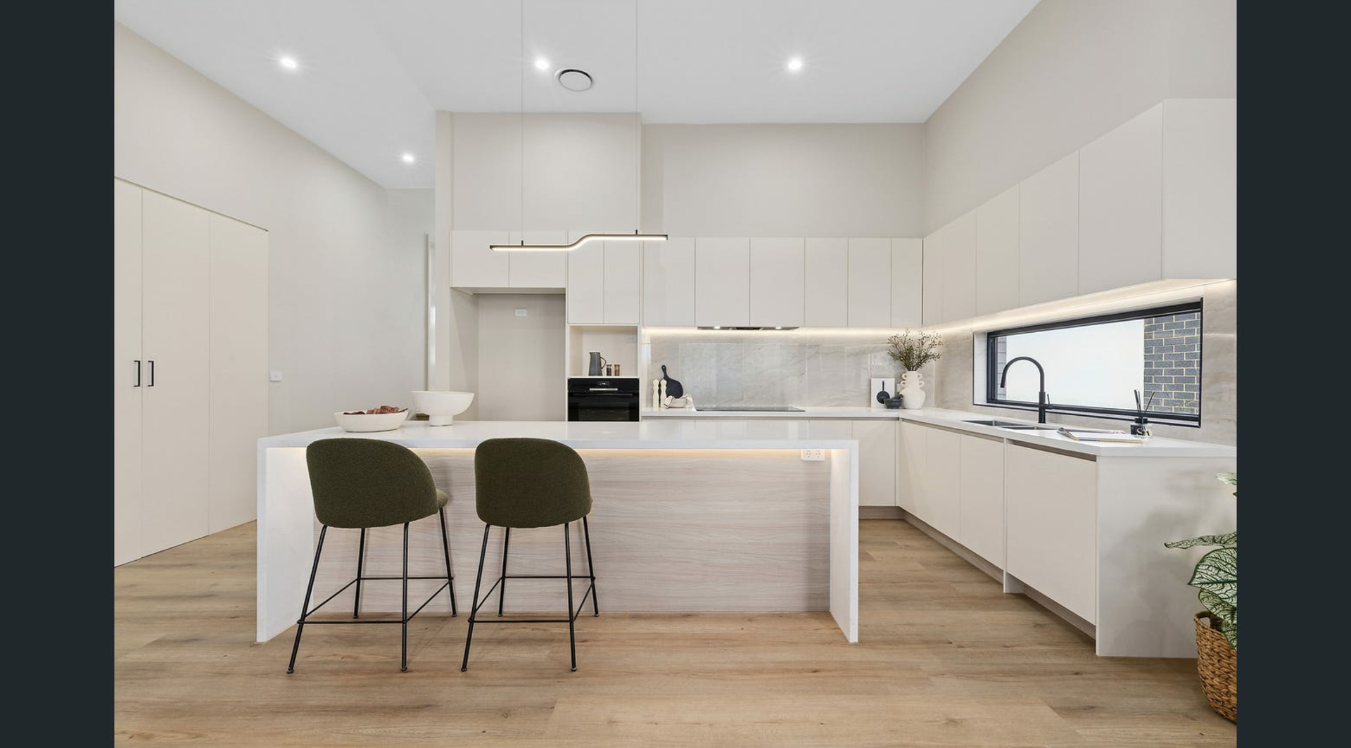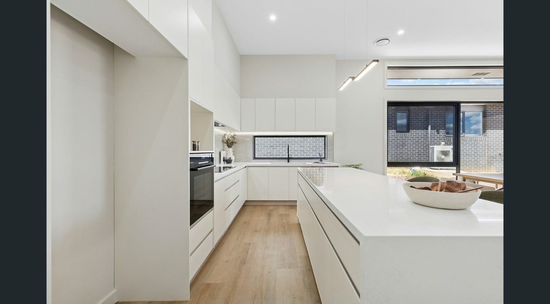 - Designer kitchen with island bench, Bosch appliances, soft-close cabinetry, and walk-in pantry
