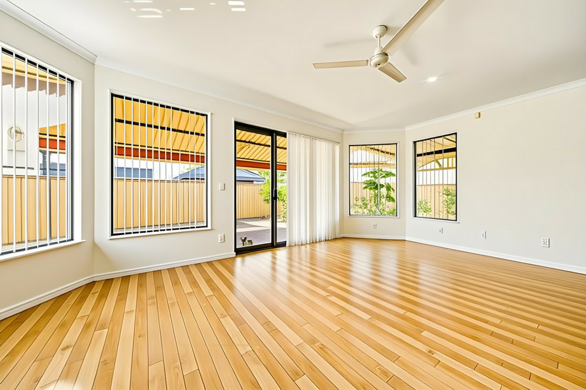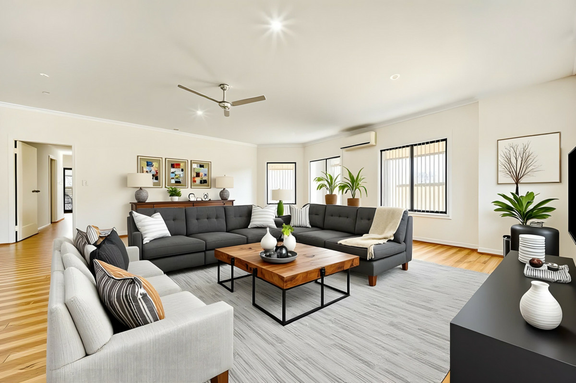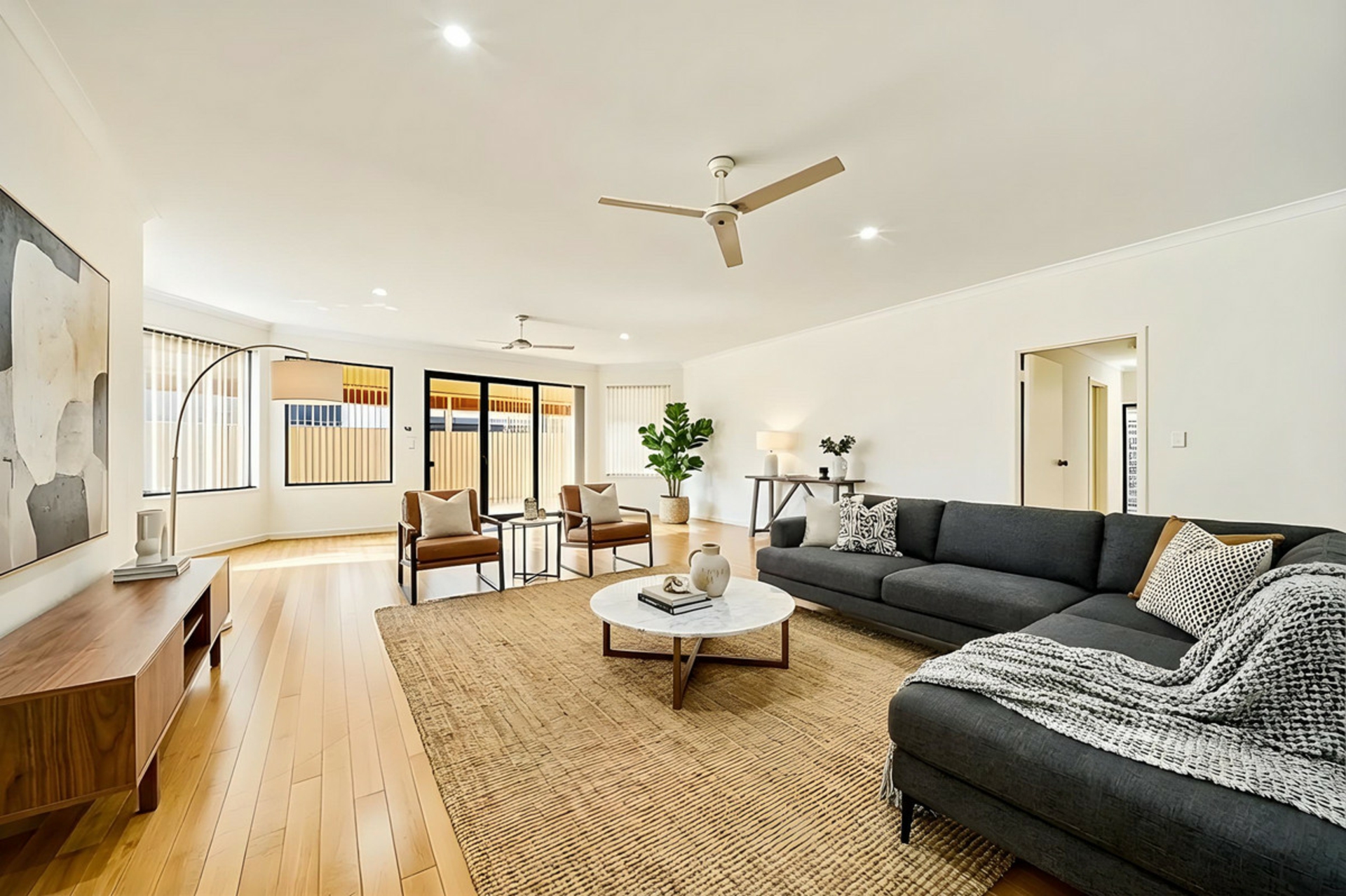 At the heart of the home, a vast open-plan living zone stretches across the full width of the residence - an entertainer's dream and a true family hub. Wood-look flooring adds warmth and durability, while surrounding windows flood the space with natural light and coastal ambience.