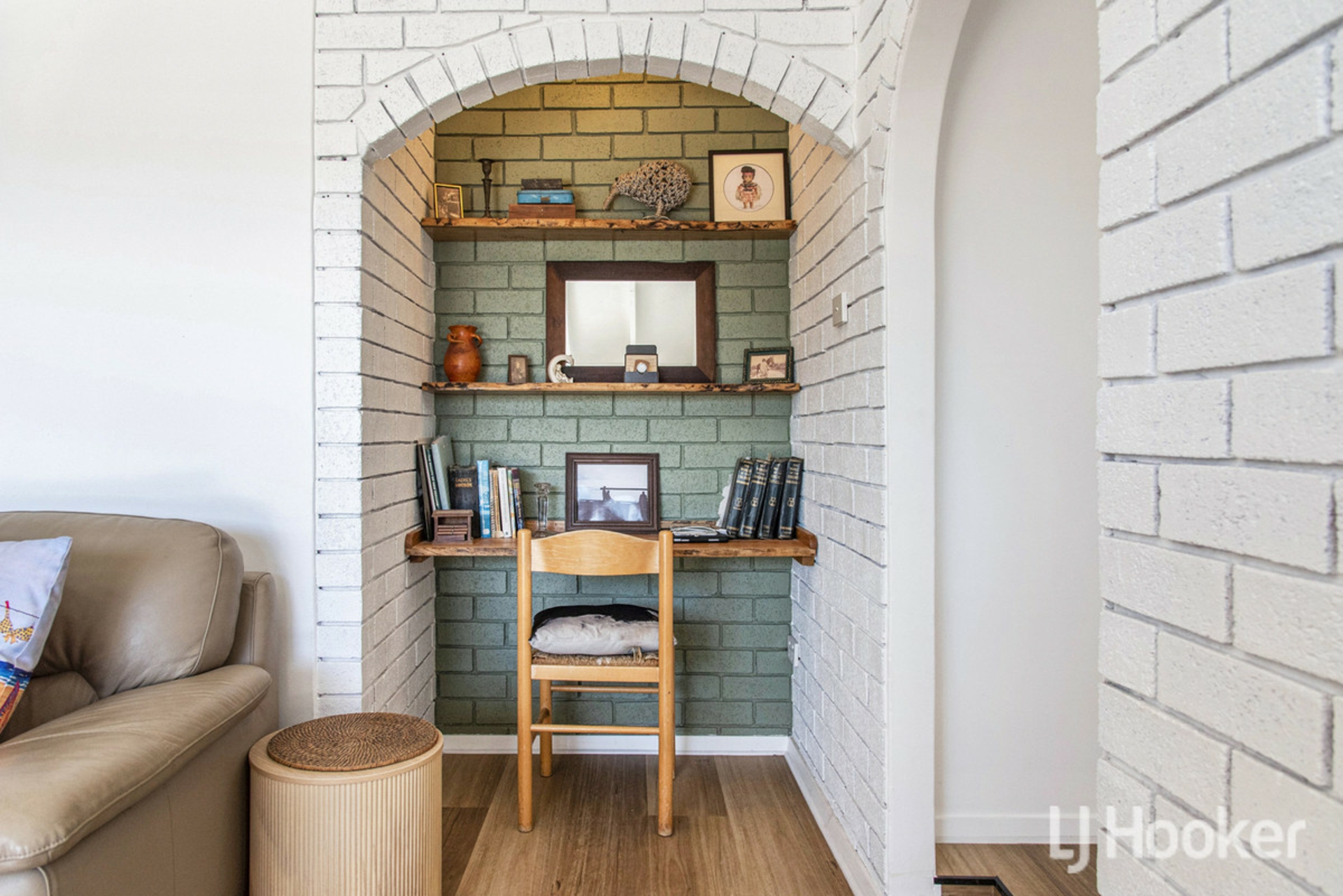 Step inside and you're welcomed by a light-filled lounge enhanced by soaring vaulted ceilings and exposed beams, creating warmth and architectural interest. Classic brick archways add timeless charm, while a dedicated study nook with custom timber shelving provides the perfect work-from-home or homework zone.