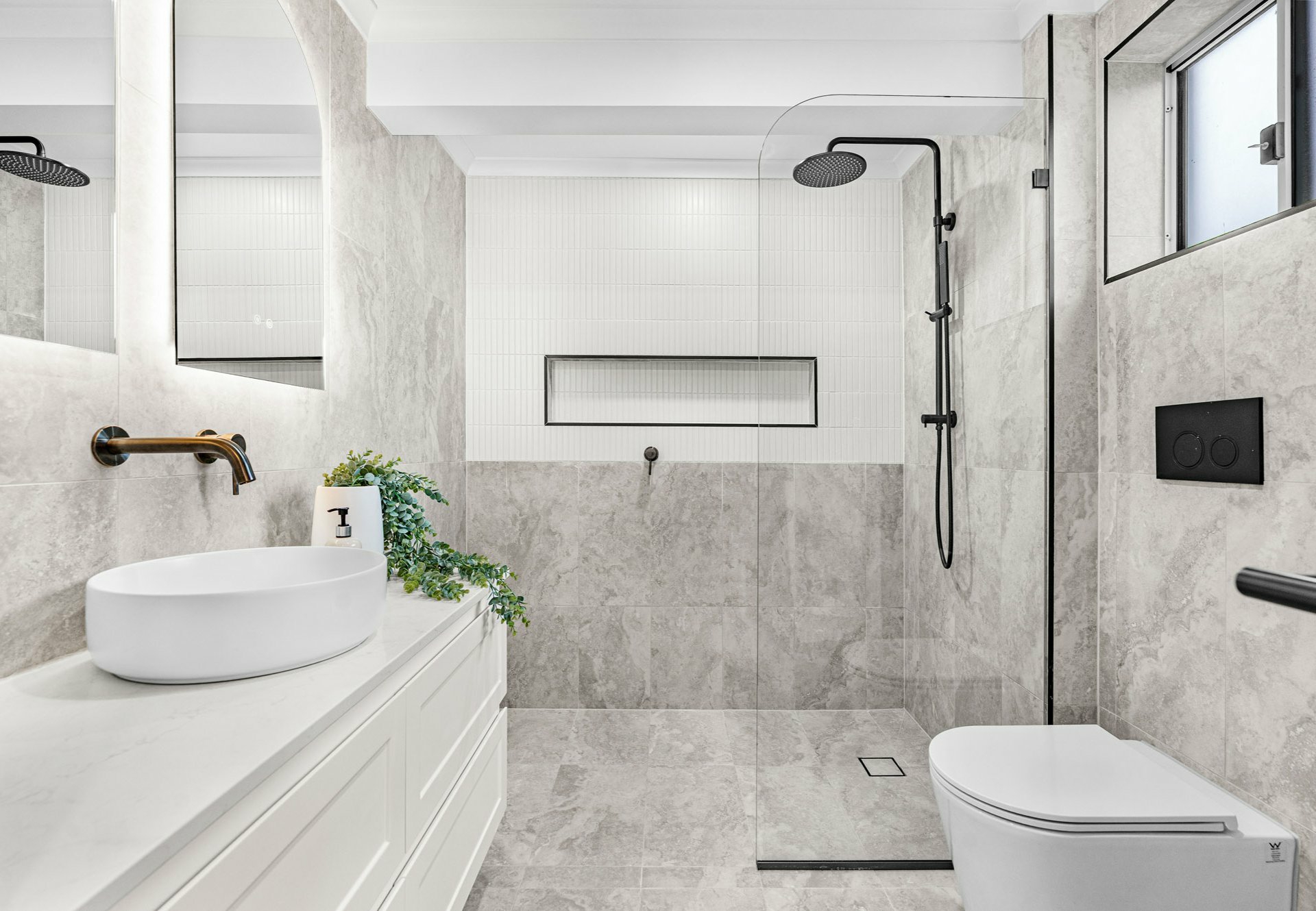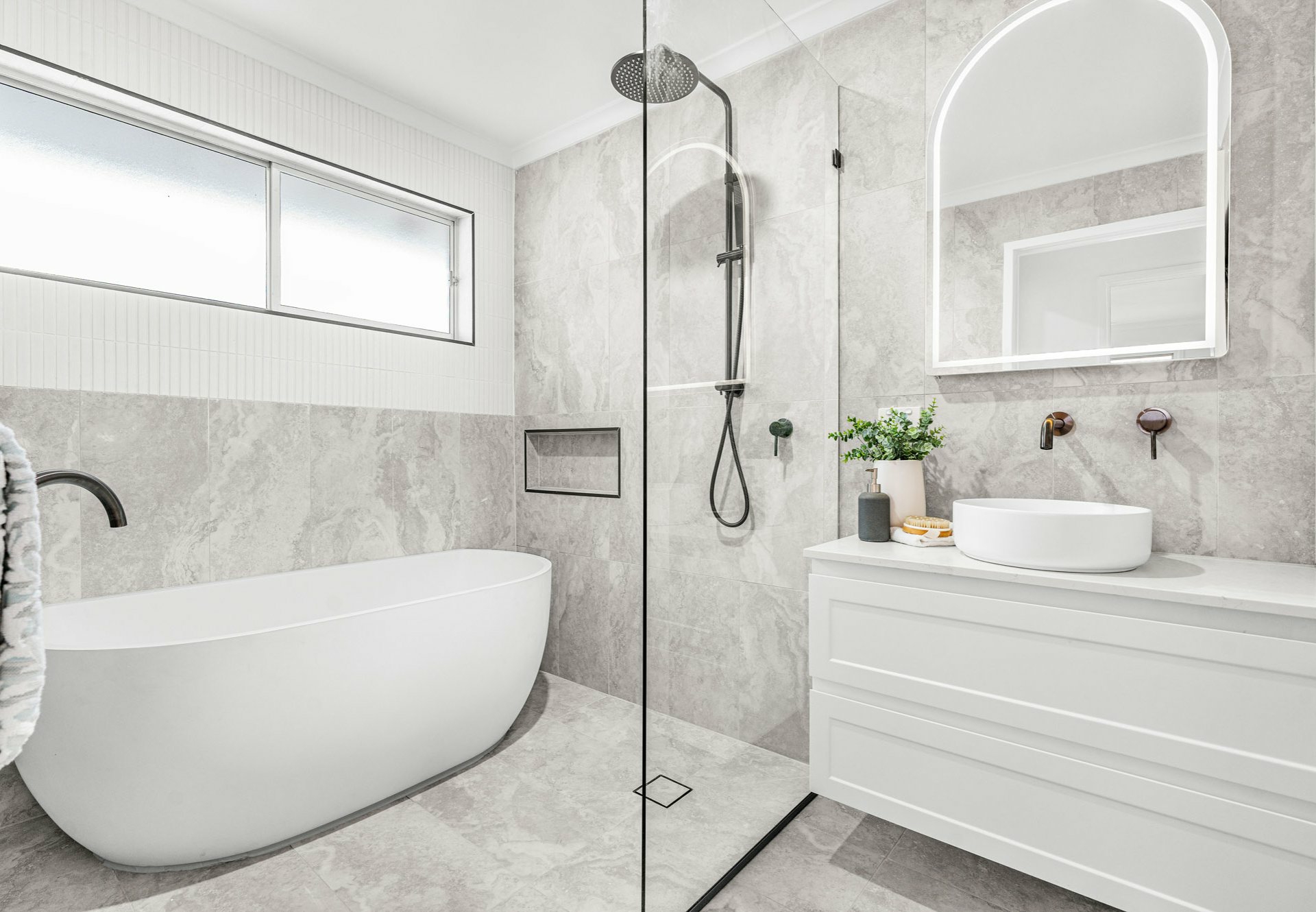• Main bathroom with Milano oval 1500mm freestanding bath, shower wet area, LED mirror, floor-to-ceiling tiles, ABI fittings, and separate toilet with in-wall system