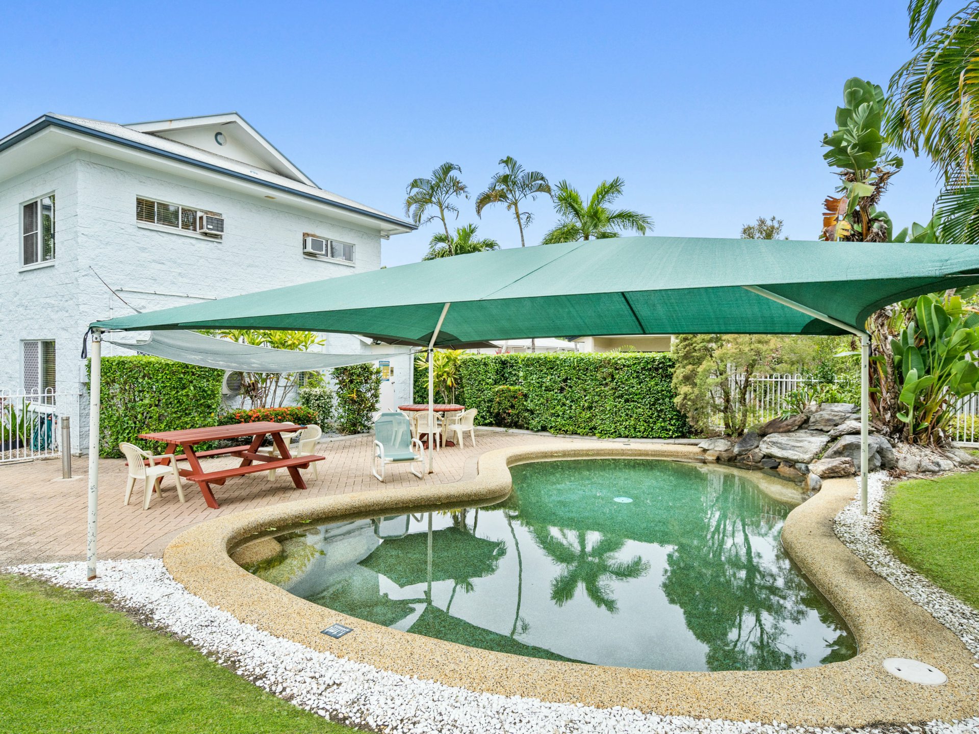 - In ground swimming pool surrounded by tropical gardens
