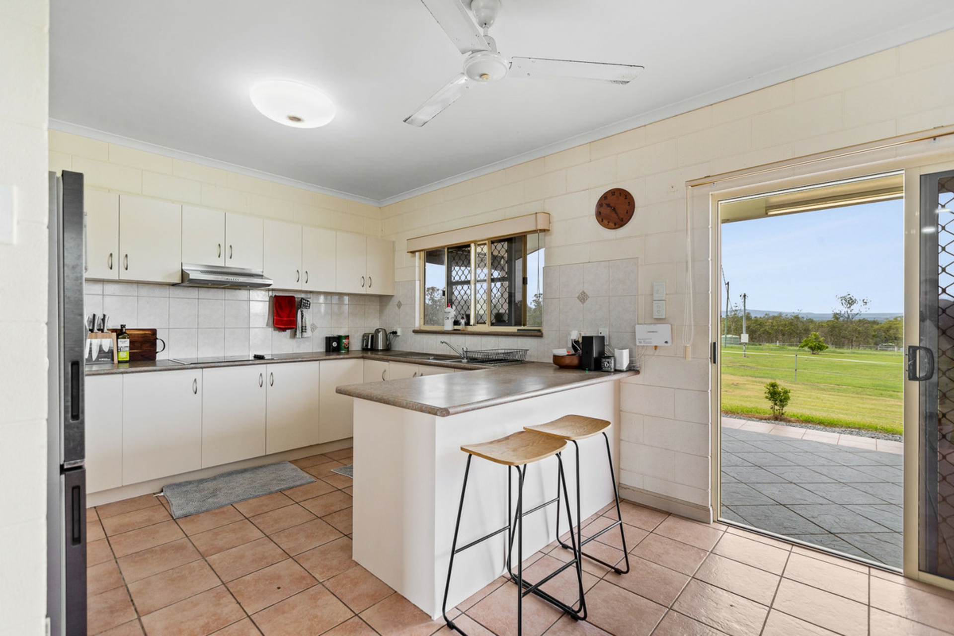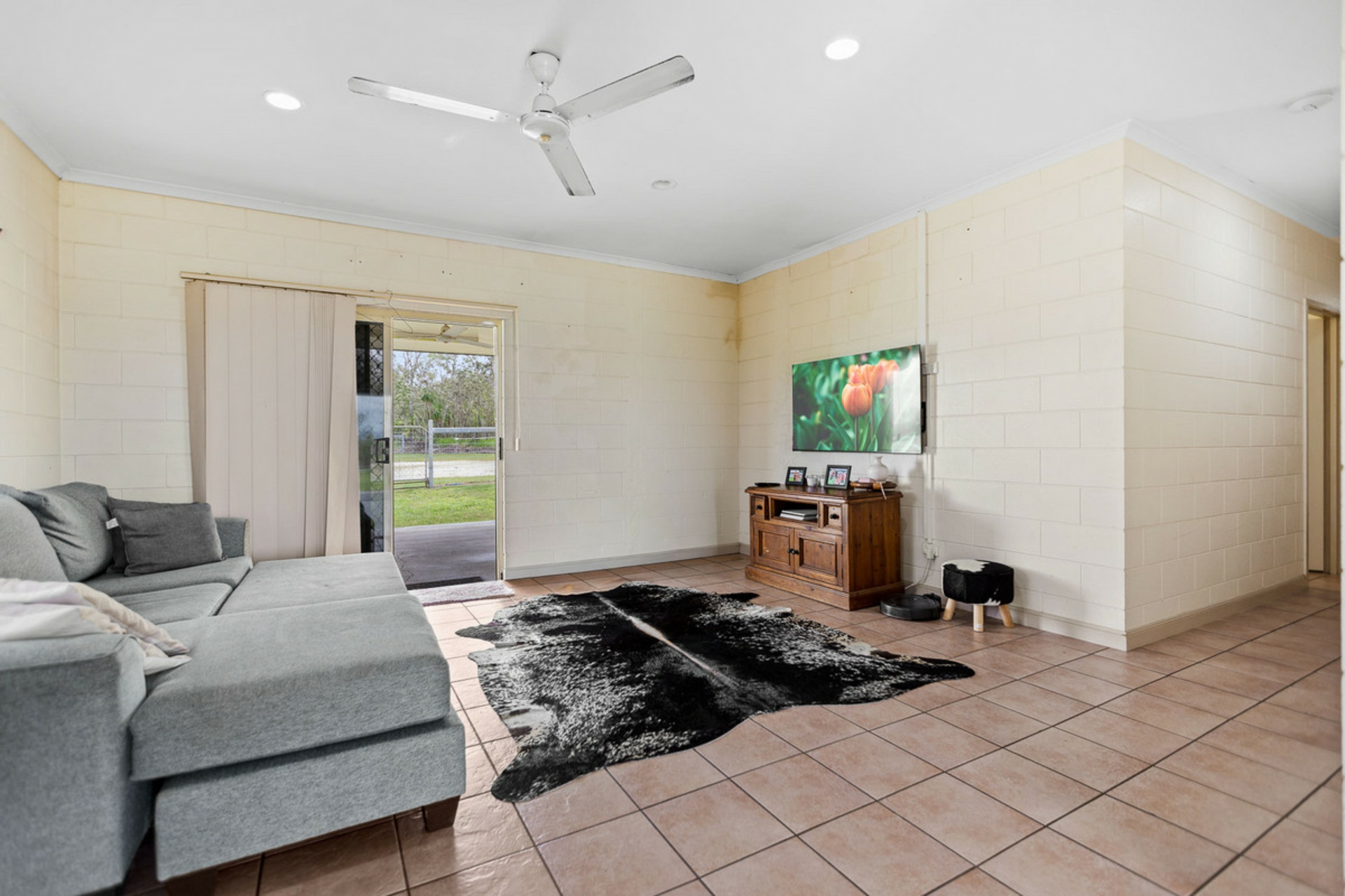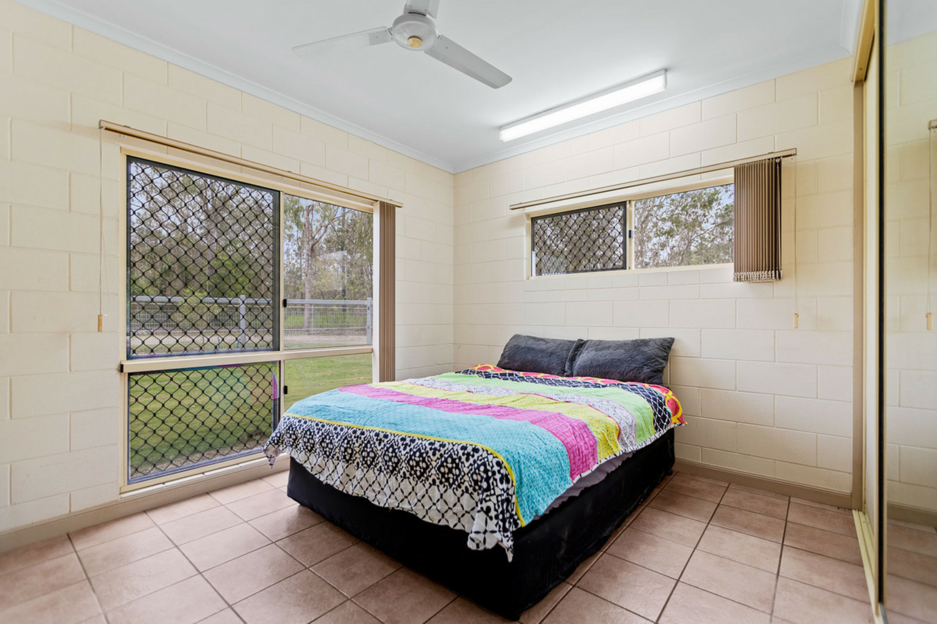 Designed to stay cool year-round, the home features concrete block internal walls, tiled floors throughout and a light-filled open-plan living, dining and kitchen area with easy access to both the front and rear patios-perfect for relaxed entertaining.