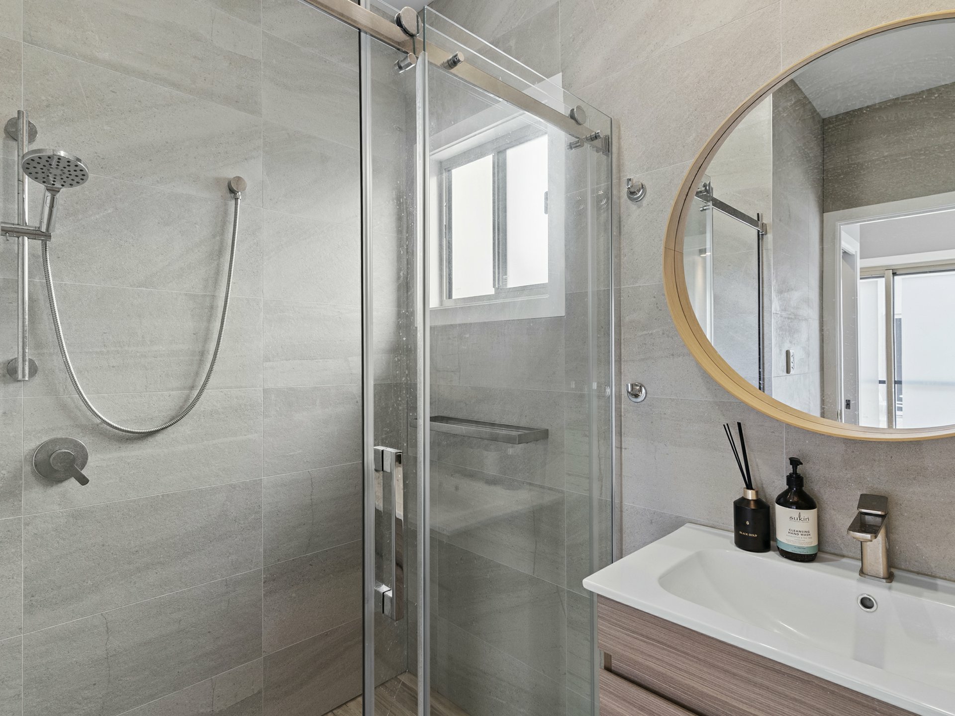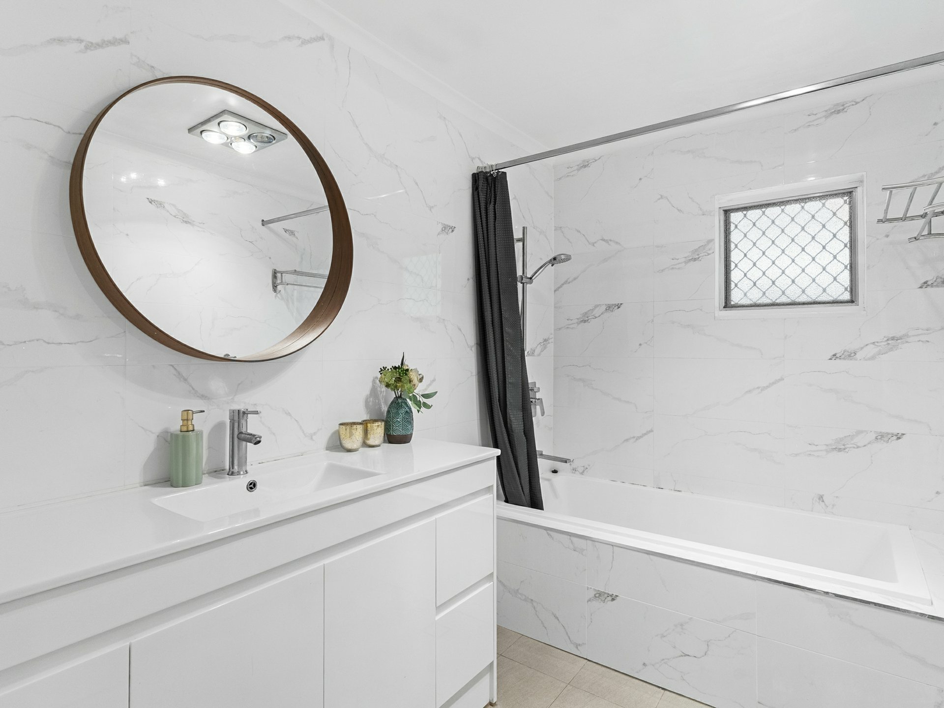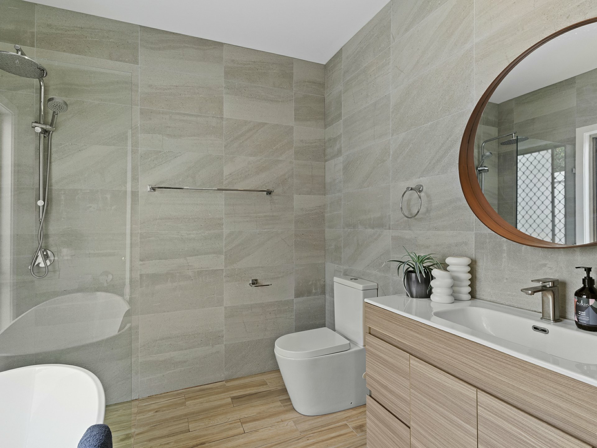 Of the 3 fan-cooled beds in the new dwelling, the master is the star with a custom fit WIR and an ensuite with contrasting full-height tiling, a frameless glass rain shower, and freestanding tub for bubbly, end of day soaks. The second bathroom is on par in looks, also floor-to-ceiling tiled, with another swish vanity and a roomy shower, with a shared laundry and separate water closet found outside.