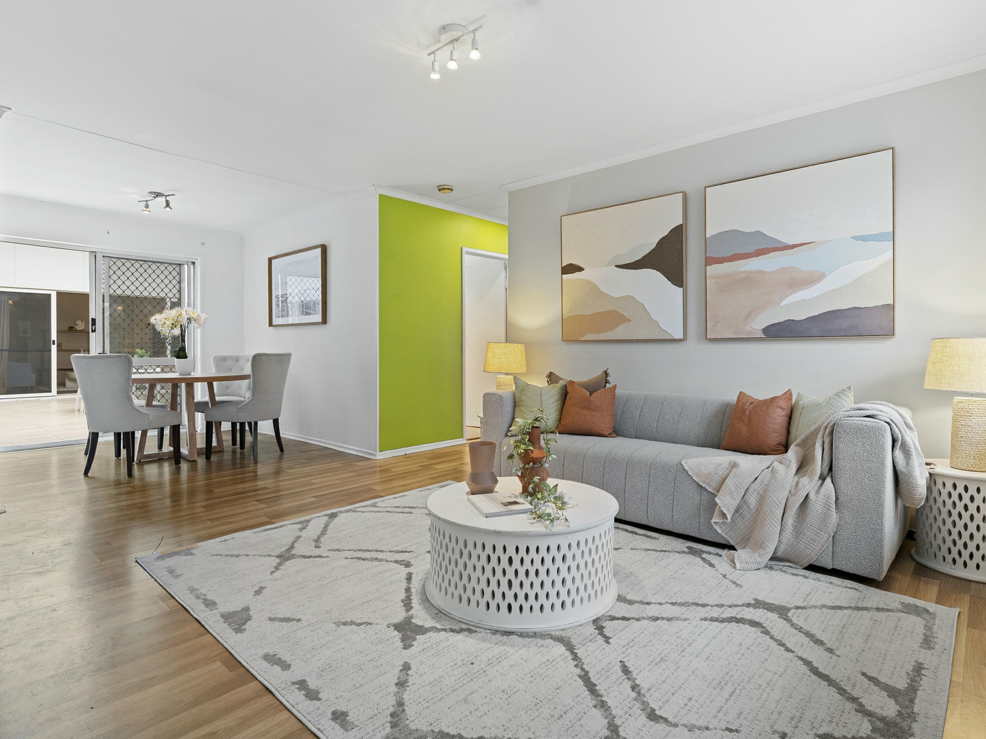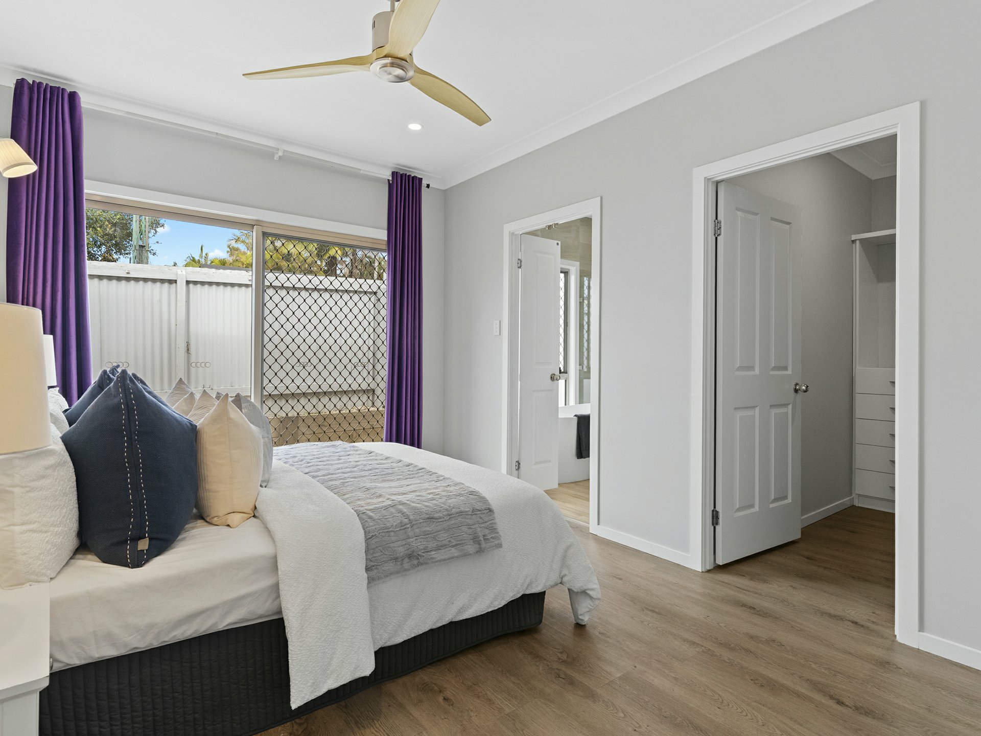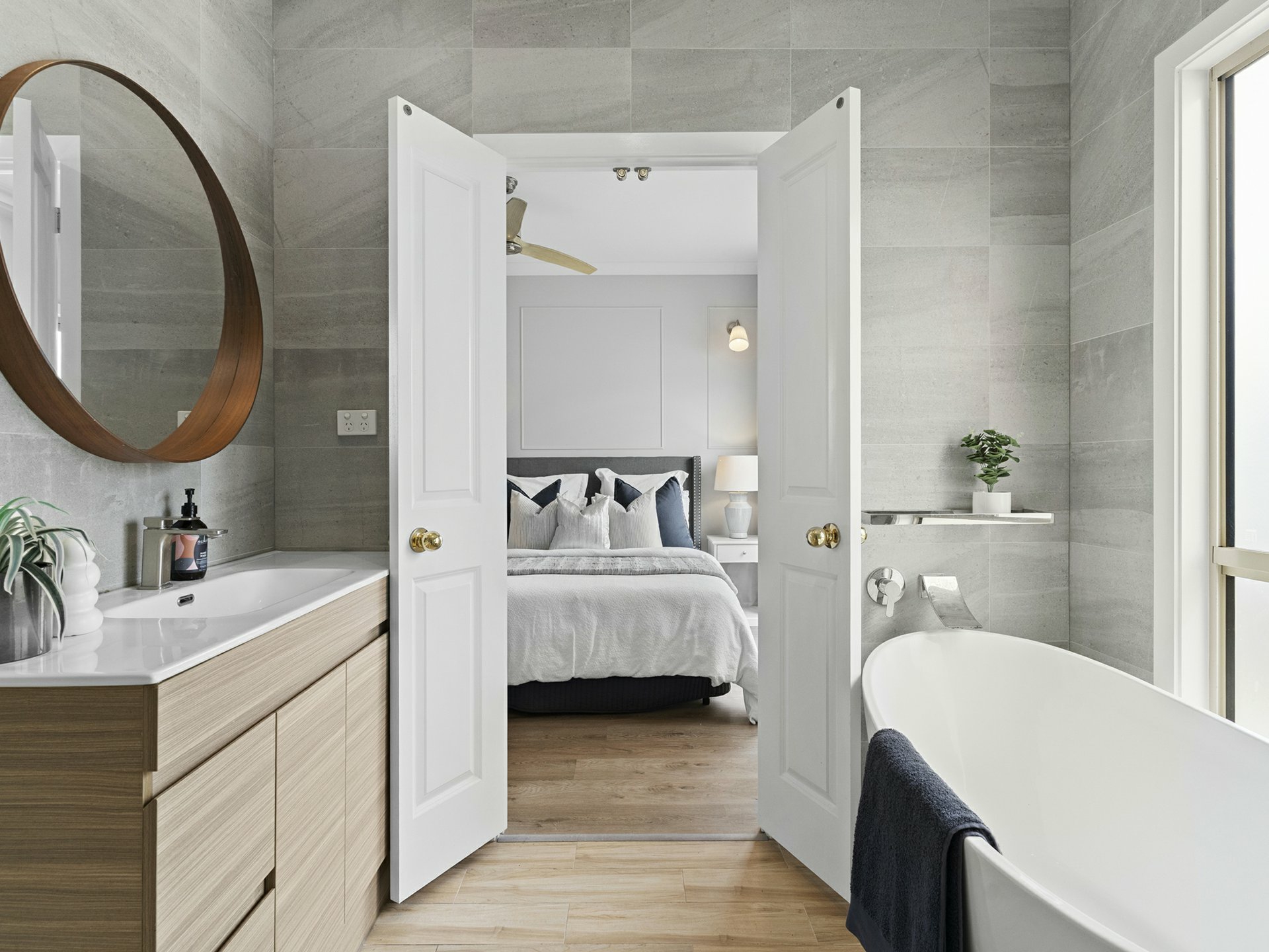 Of the 3 fan-cooled beds in the new dwelling, the master is the star with a custom fit WIR and an ensuite with contrasting full-height tiling, a frameless glass rain shower, and freestanding tub for bubbly, end of day soaks. The second bathroom is on par in looks, also floor-to-ceiling tiled, with another swish vanity and a roomy shower, with a shared laundry and separate water closet found outside.