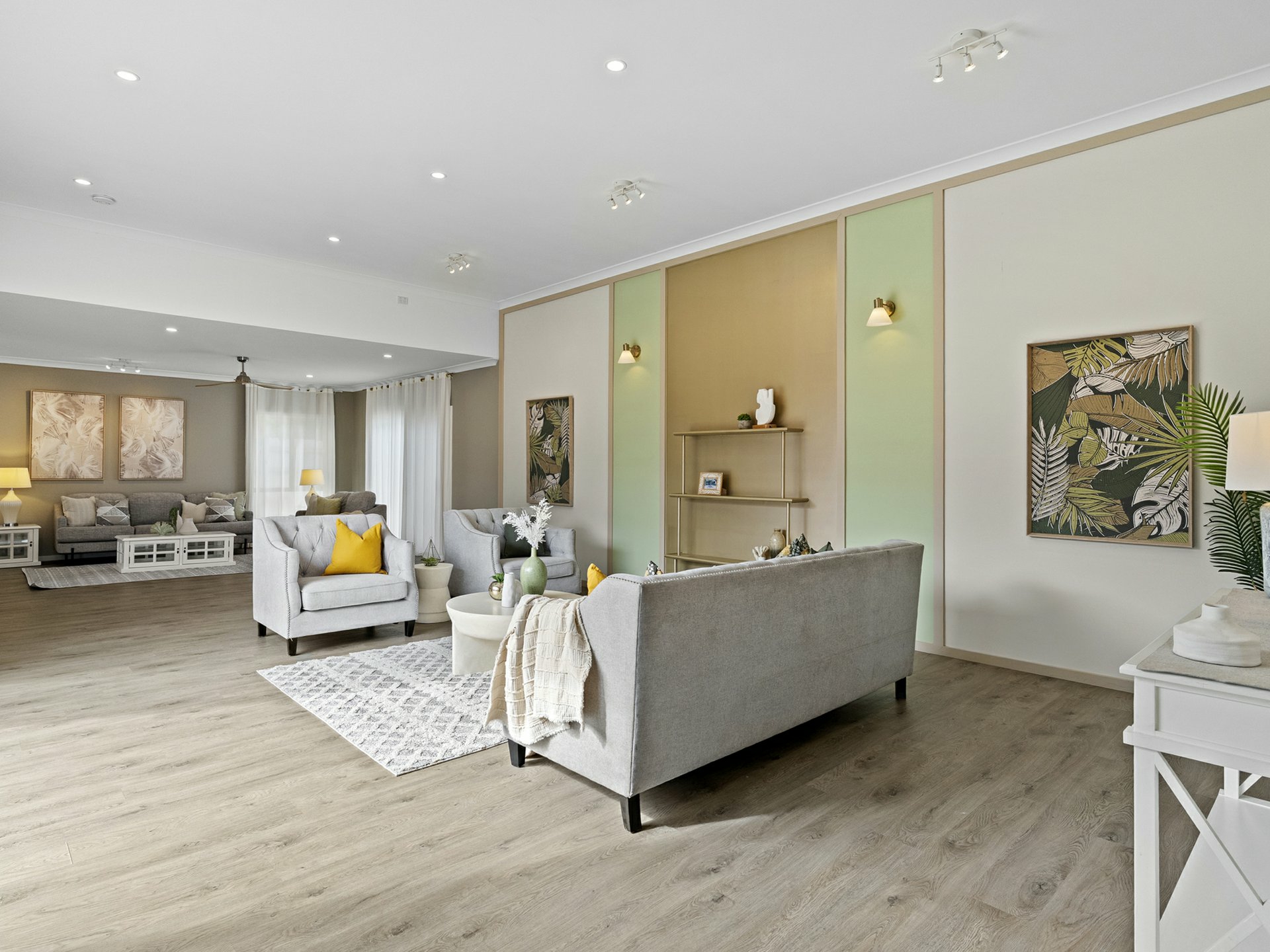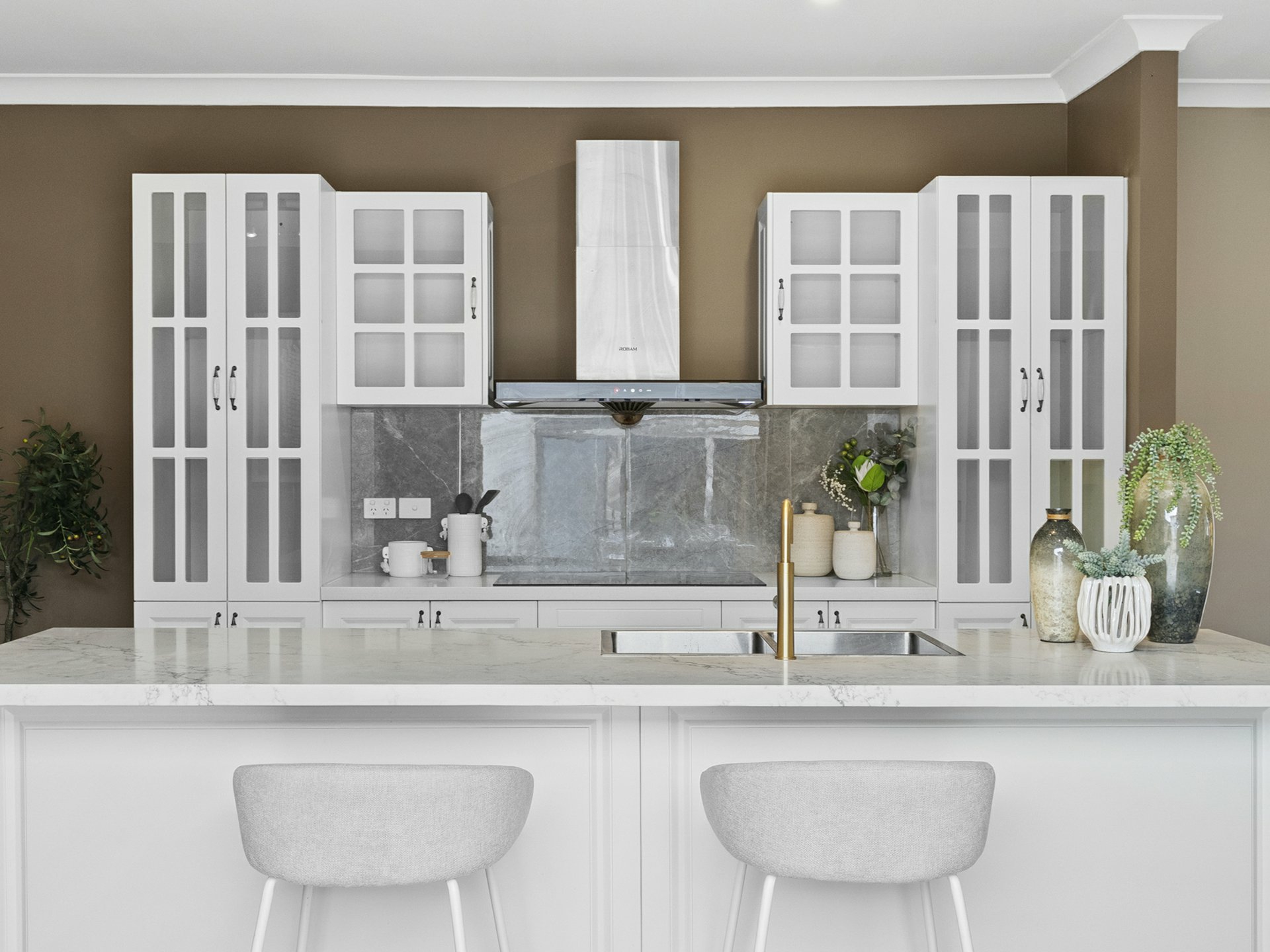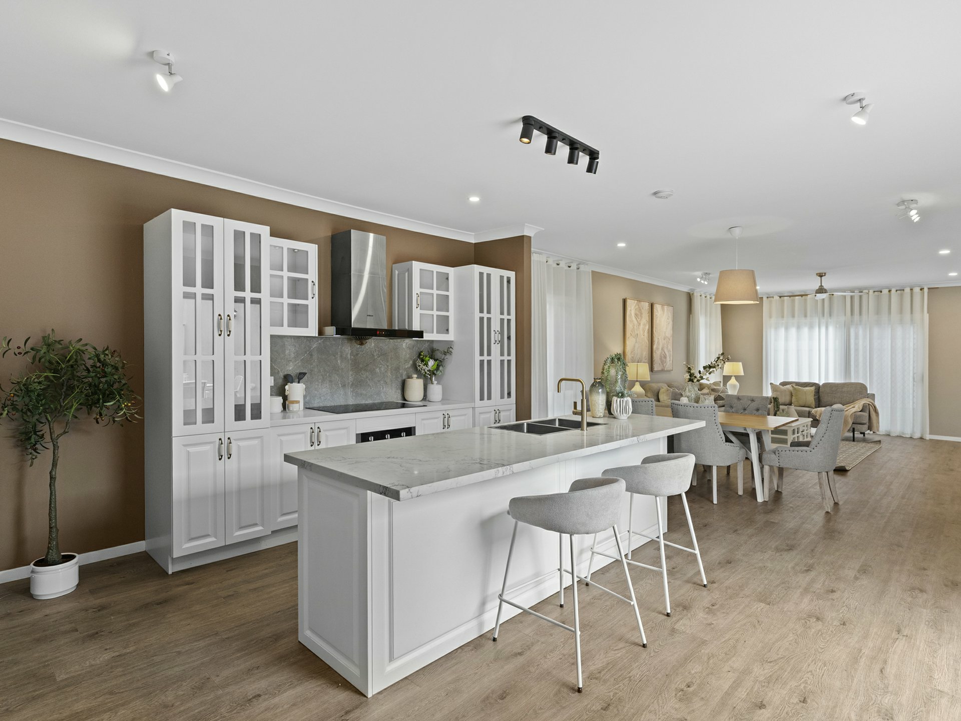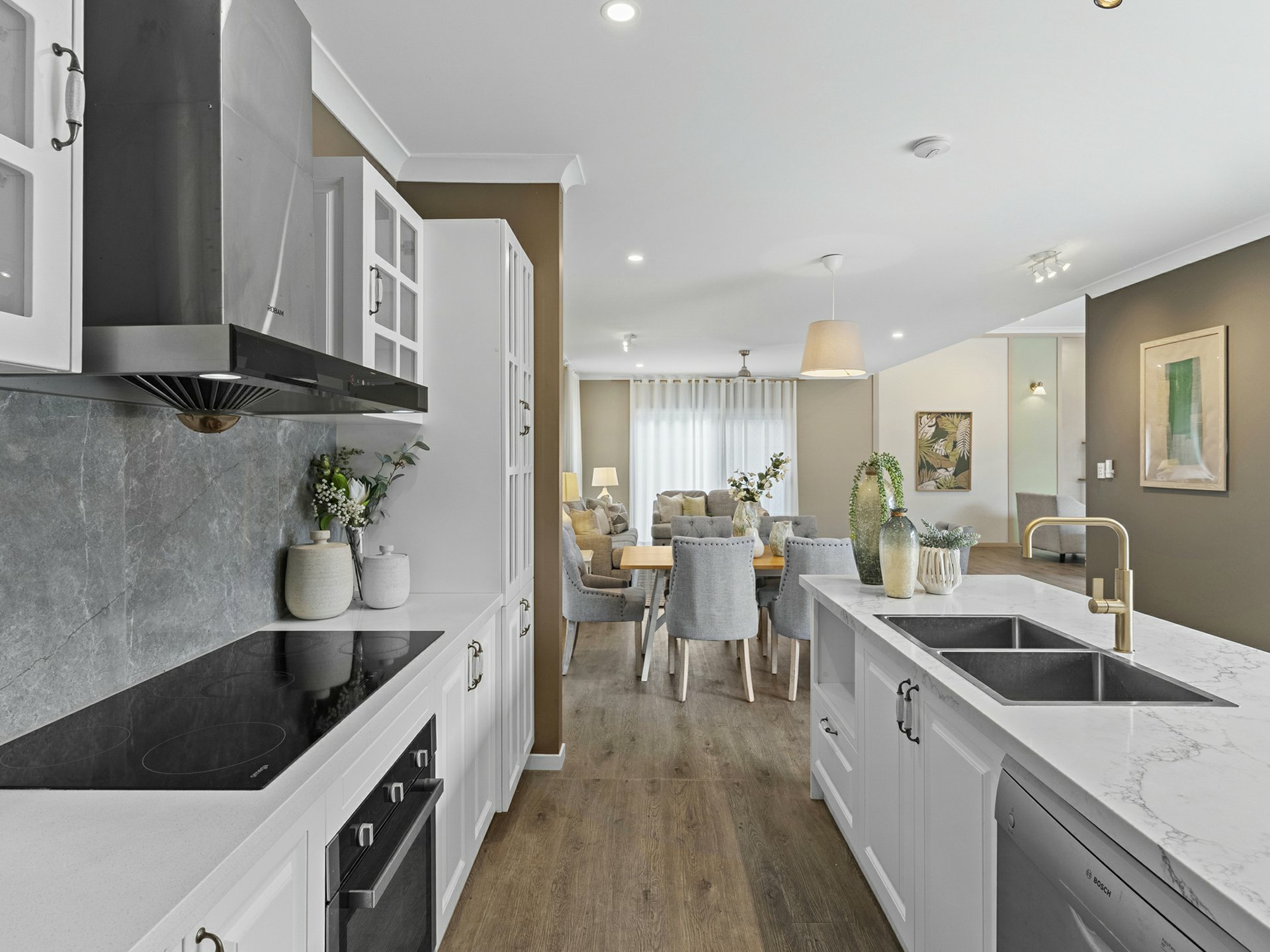 Taking style levels to new heights, the rear lowset has an airy u-shaped floorplan, where the key rooms extend through sliders into a stunningly tiled open-air entertaining courtyard. The kitchen is central to the action, with a marble-look stone top over an island dining bar with rose-gold tapware, and a flash induction cooker/stainless rangehood framed by crisp white cabinetry. Hybrid timber floors are complemented by a calming choice for wall paint, and these run through the kitchen, the adjacent combined dining area/formal lounge, and through to a bonus family room.