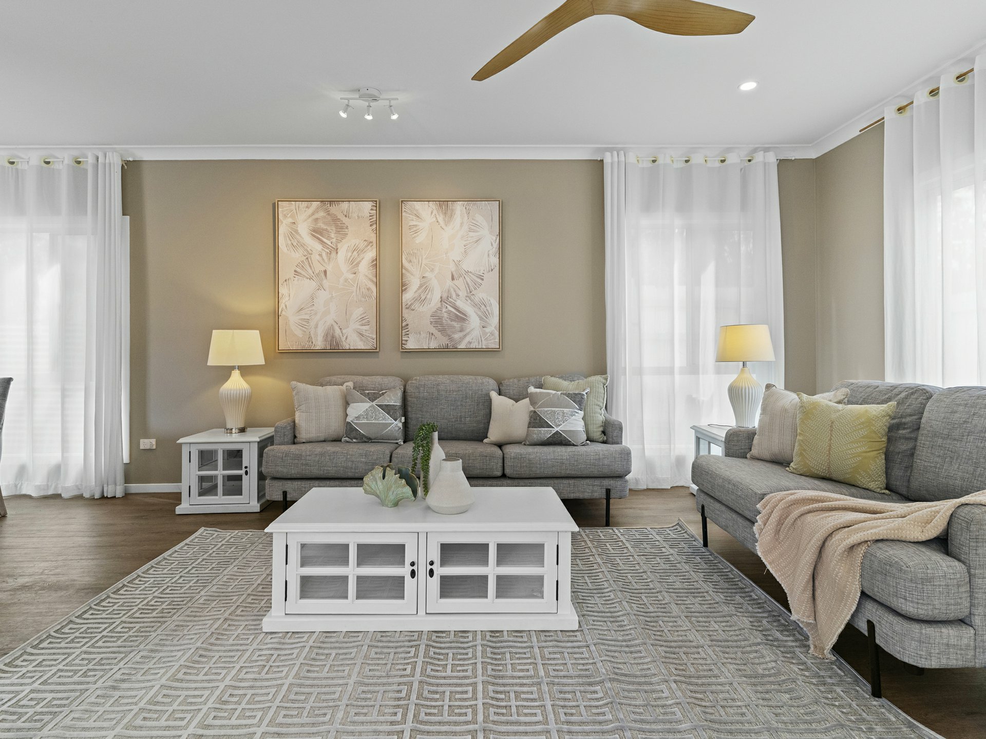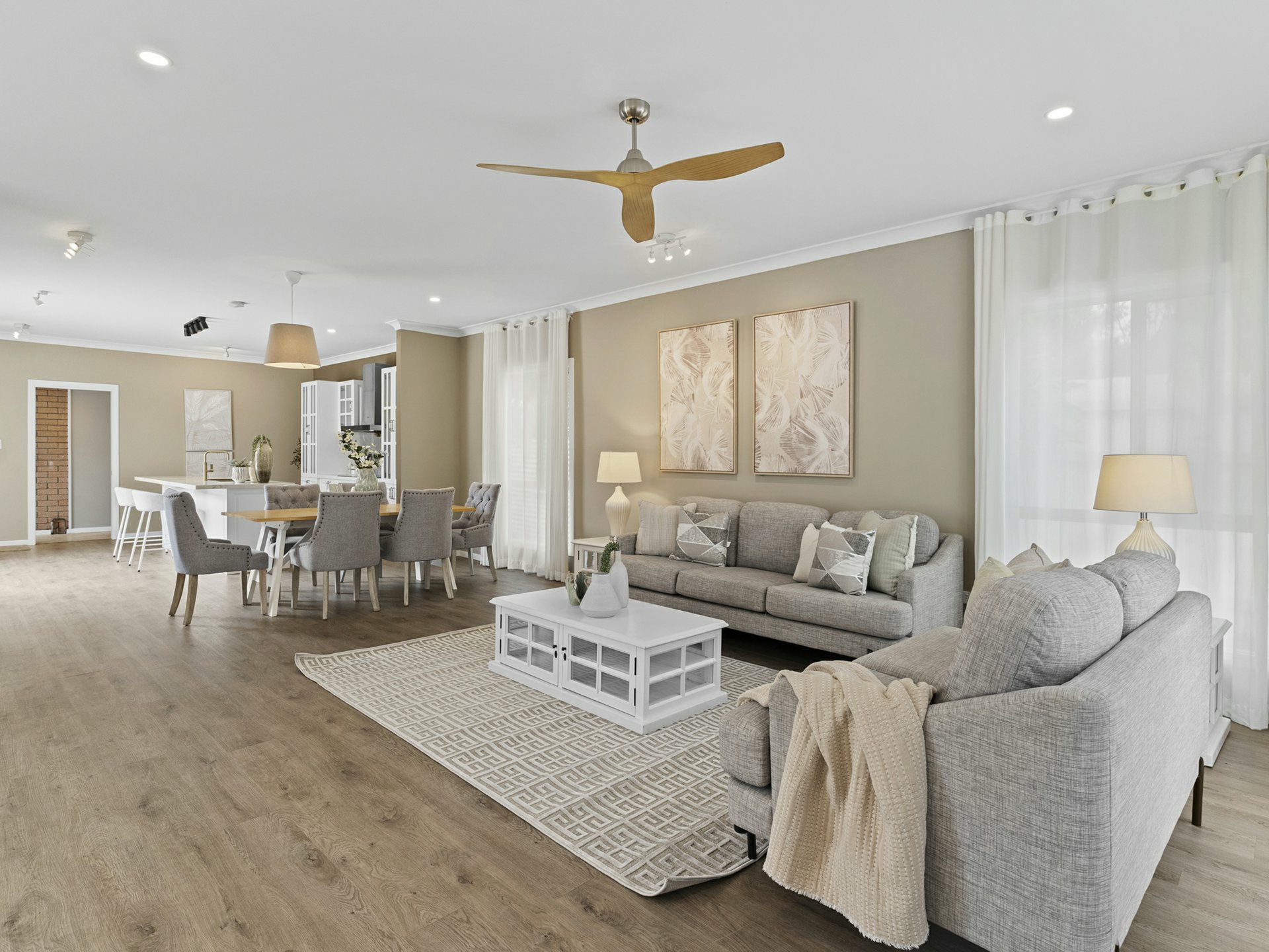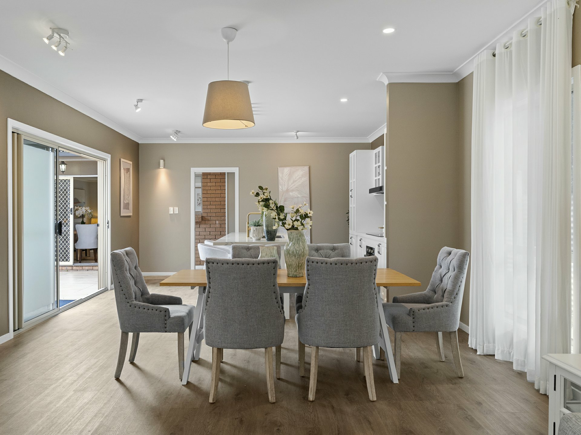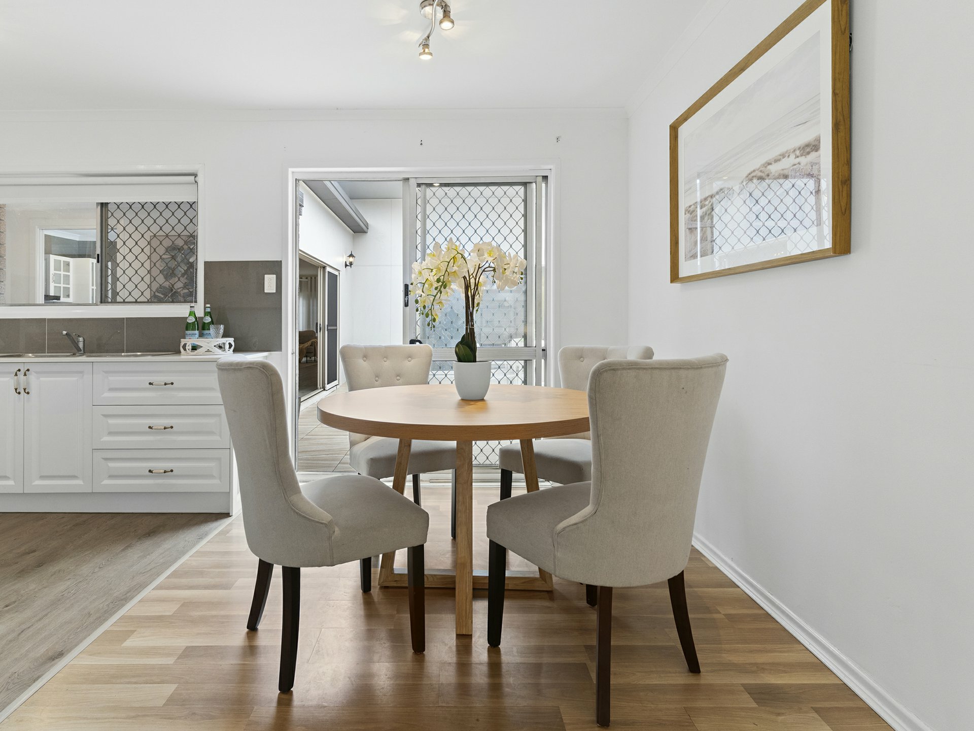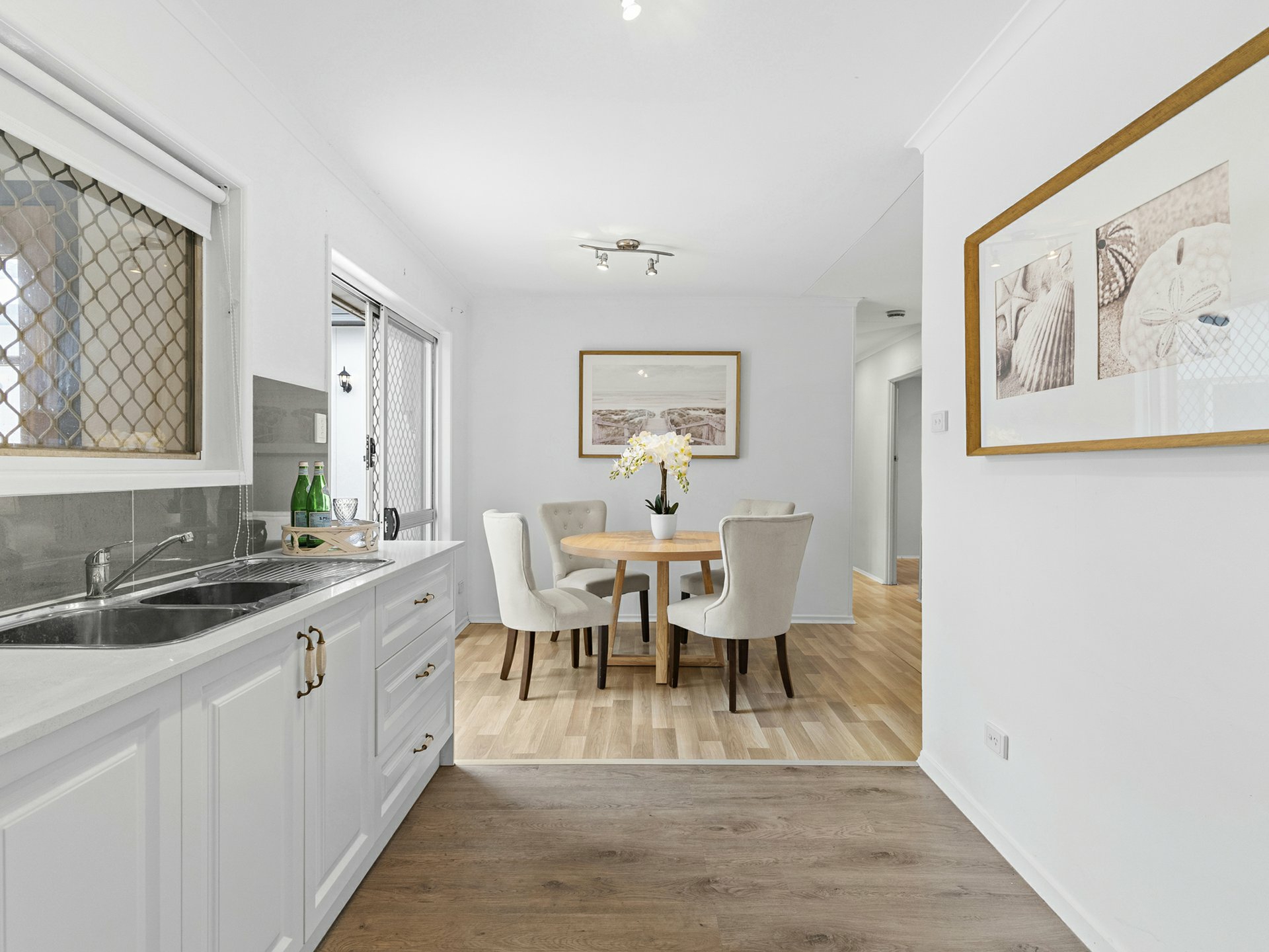 Taking style levels to new heights, the rear lowset has an airy u-shaped floorplan, where the key rooms extend through sliders into a stunningly tiled open-air entertaining courtyard. The kitchen is central to the action, with a marble-look stone top over an island dining bar with rose-gold tapware, and a flash induction cooker/stainless rangehood framed by crisp white cabinetry. Hybrid timber floors are complemented by a calming choice for wall paint, and these run through the kitchen, the adjacent combined dining area/formal lounge, and through to a bonus family room.