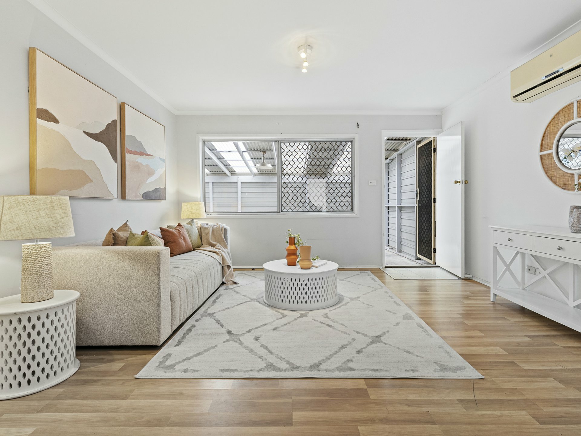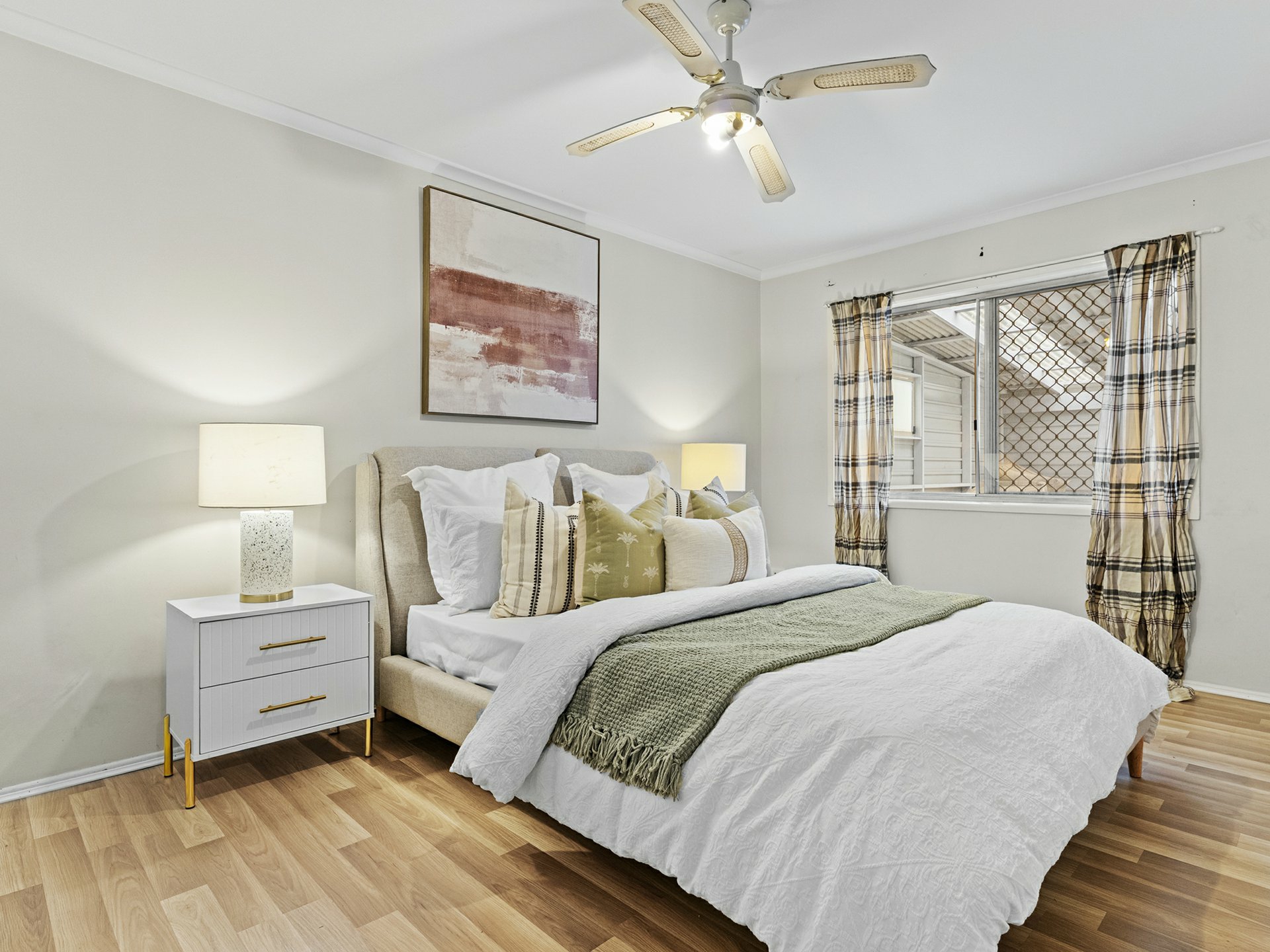 While the home closest to the street is the original dwelling, it sports a renovated interior that equals the good looks and contemporary vibes of the lowset behind. Along with chic timber-look flooring throughout the sleeping and social spaces, it has a luxe full-height tiled bathroom with shower-over-tub combo, white and bright kitchen, split system AC in living and cool track lighting.