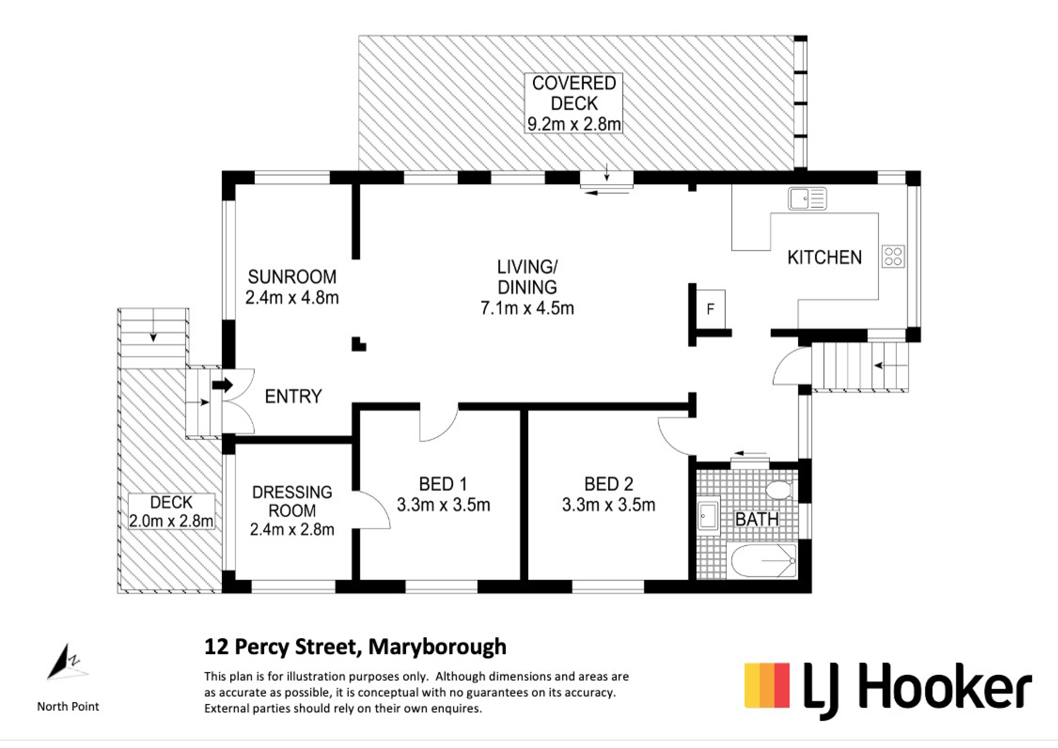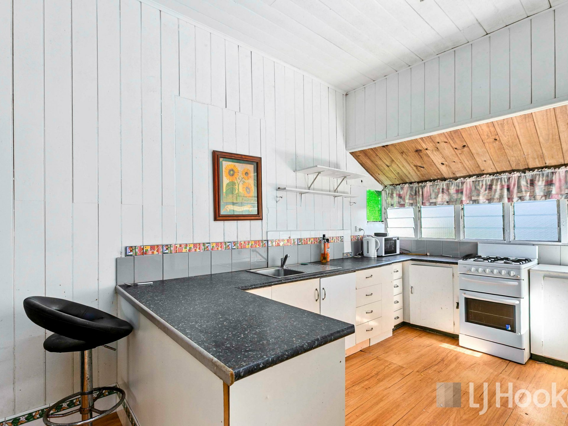 Inside, the home features two bedrooms, including a spacious main bedroom with adjoining dressing room or home office. The open plan living and dining area flows through to a functional kitchen, while ceiling fans throughout provide added comfort.