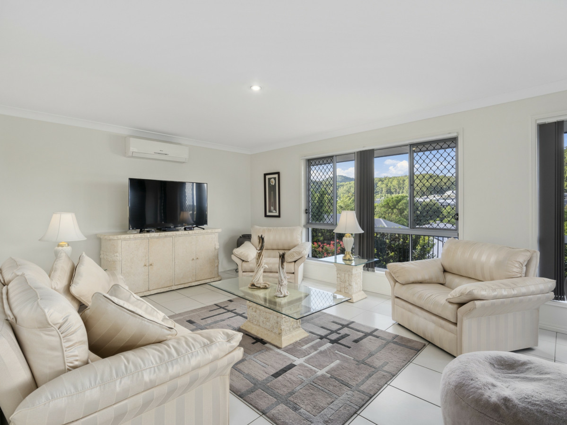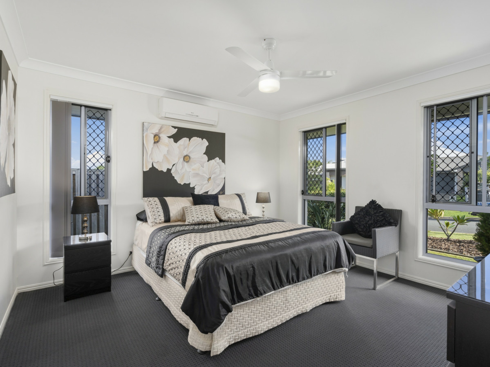 4 large airy bedrooms with built in robes and ceiling fans, the master with a large walk in robe and lovely ensuite bathroom. It is also air conditioned.