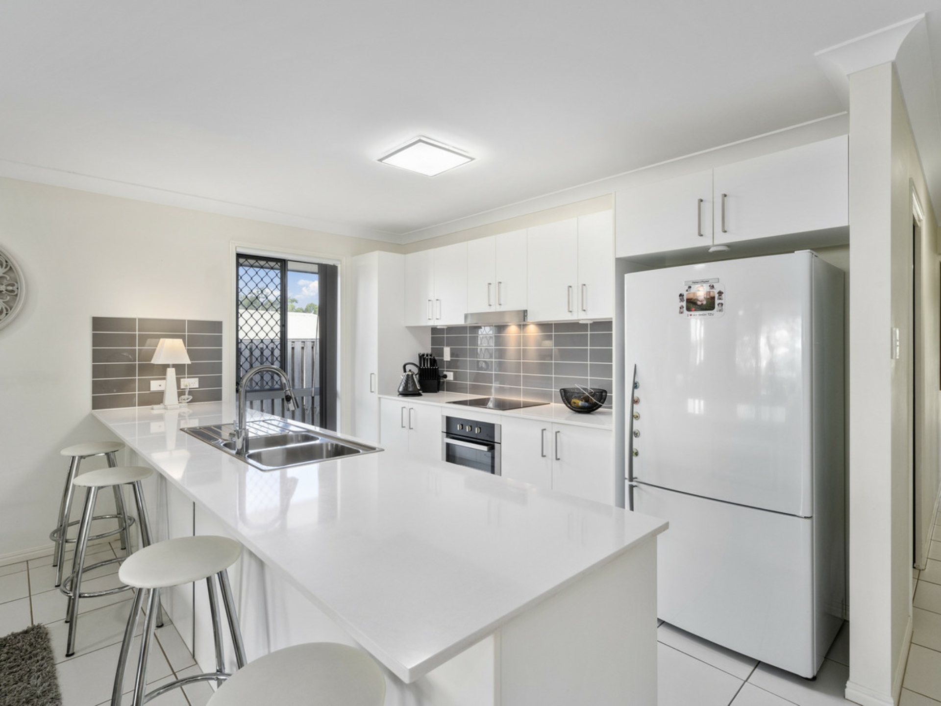 A modern galley style kitchen with stone bench tops, electric oven, ceramic cook top, range hood, and dishwasher. A long breakfast bar, plenty of storage and bench space, and large frig opening.