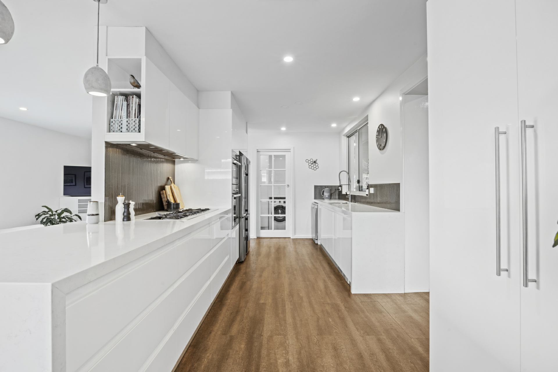 - Renovated kitchen with stone benchtops and breakfast bar, gas cooktop, integrated microwave and oven, dishwasher, soft close drawers alongside custom built cabinetry with dual pantries and bar/coffee nook