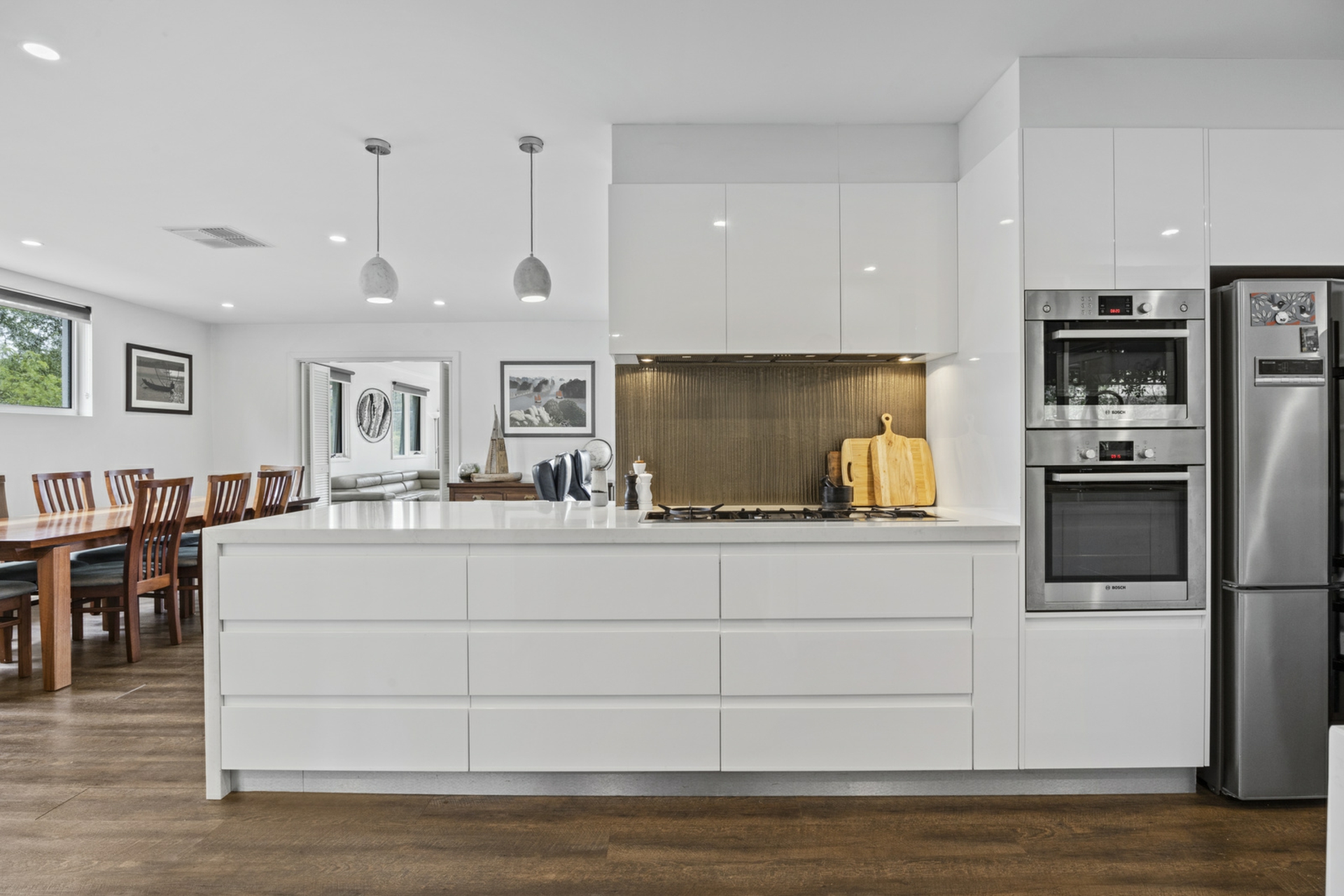 From the moment you drive in to the quiet cul-de-sac and enter the home through private front courtyard, the home's presence and charm are undeniable. Stepping inside, spacious family and dining areas surround the kitchen, catering to intimate family dinners or large gatherings with ease. Carefully designed and flawlessly finished, the kitchen offers an expansive stone benchtops with breakfast bar, gas cooktop, integrated microwave and oven, dishwasher, soft close drawers alongside custom built cabinetry with dual pantries and bar/coffee nook. A spacious formal living room is positioned at the front of the home, embracing green vistas provided by the elevated position.