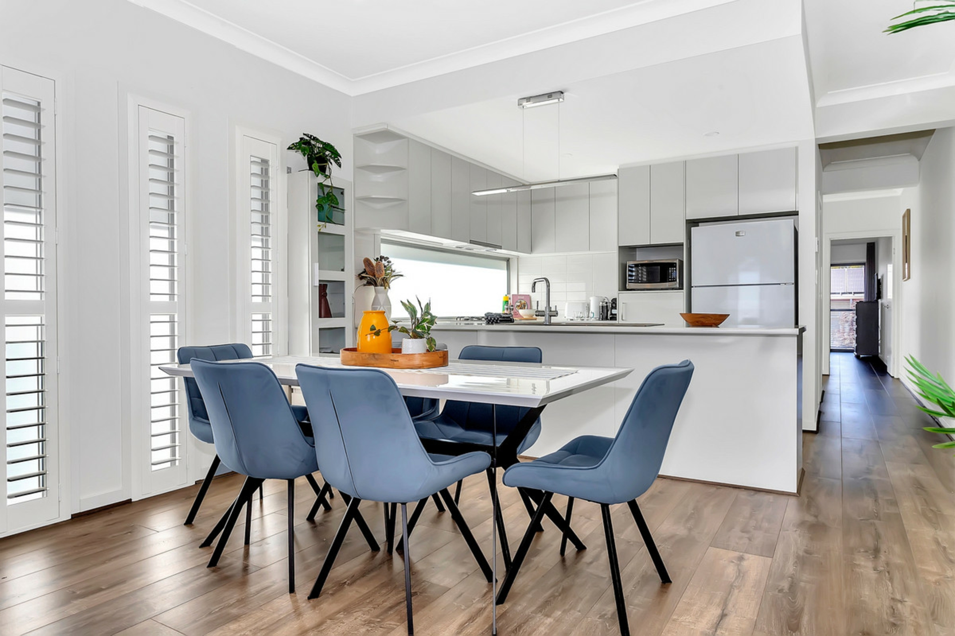 • Modern kitchen with cupboard pantry, gas cooktop, oven and dishwasher, pendant light