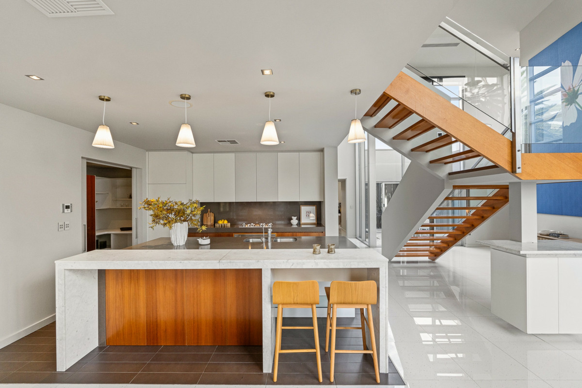 • Island kitchen with both marble breakfast bar and Caesarstone benchtops, walk in pantry and Smeg 900mm oven and cooktop
