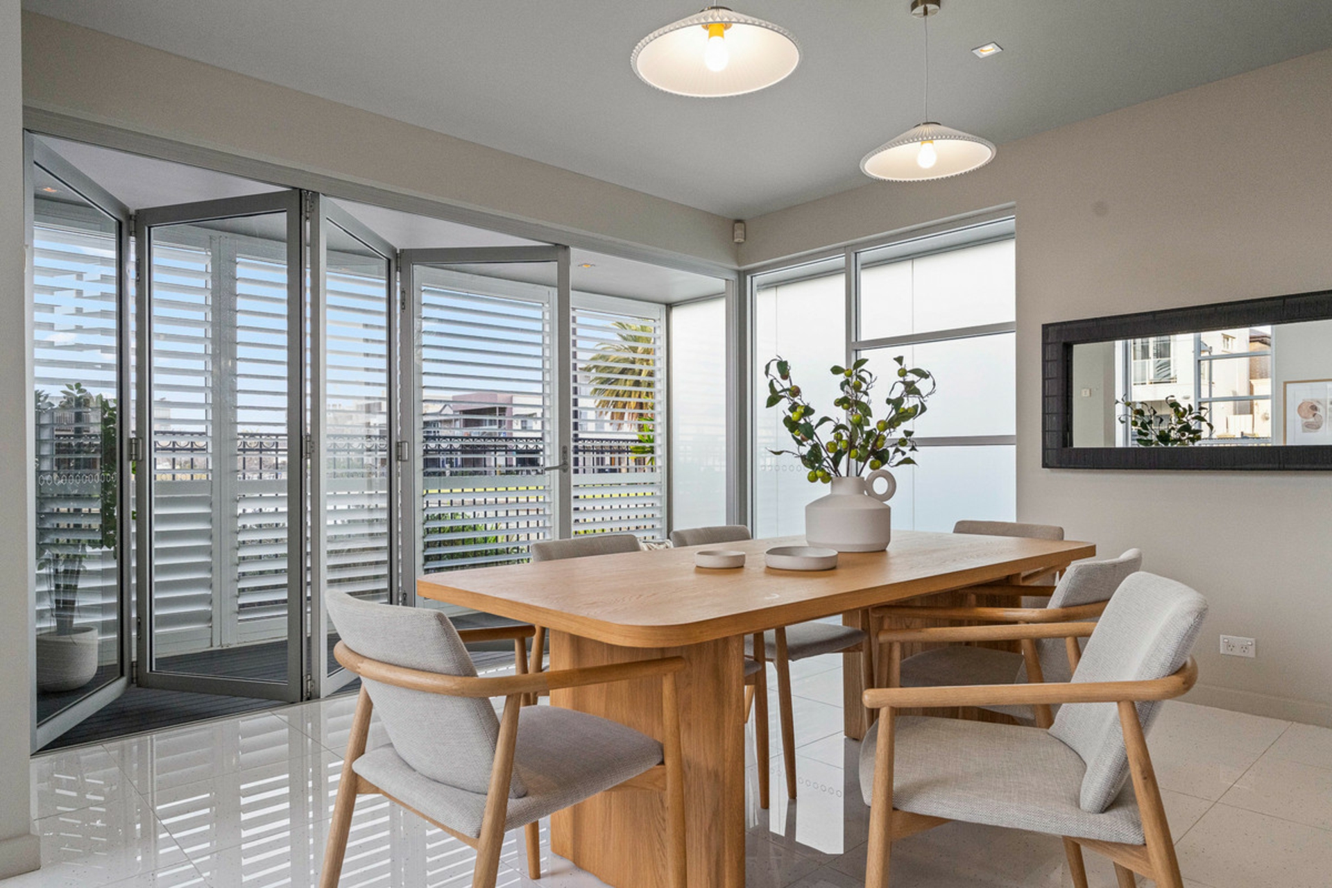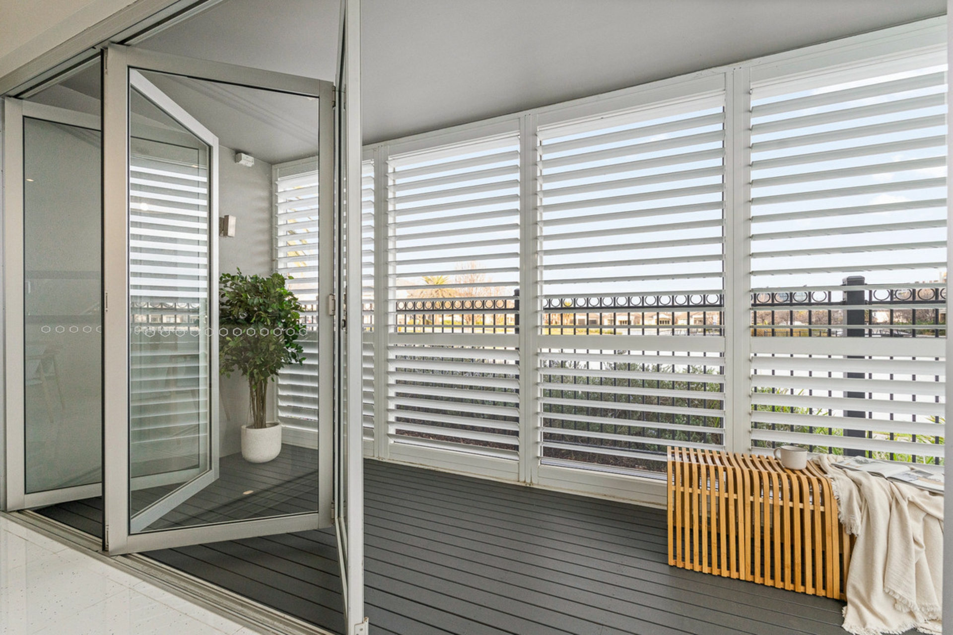 • Bi-fold cafe doors lead out to the enclosed deck with aluminum louvres
