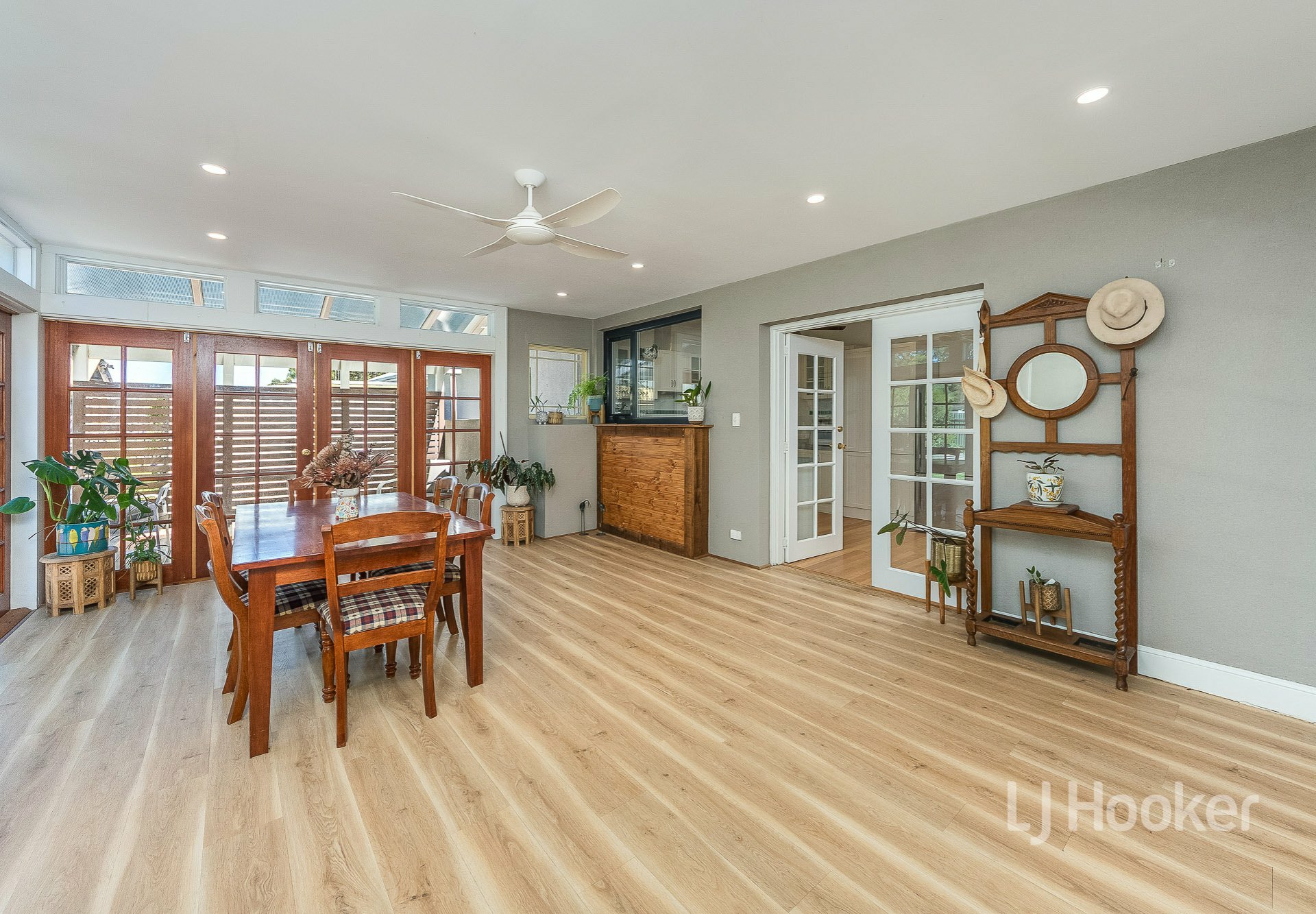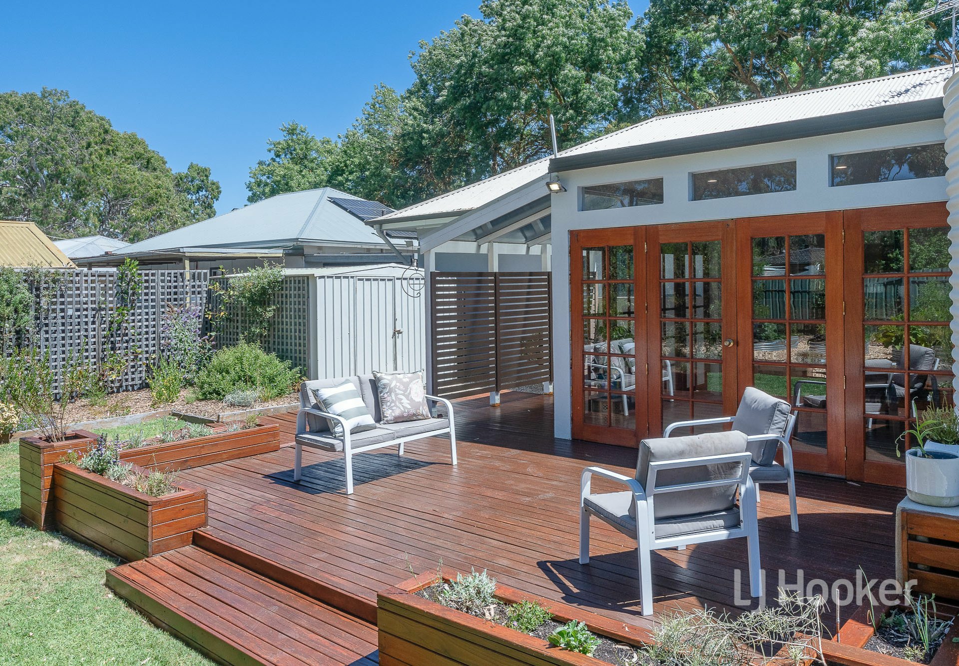 The renovated kitchen has reverse cycle air-conditioning, room to work and offers an informal dining area. An ideal spot for the family to gather and share their news. Strolling through the adjacent double French doors one comes one of the true highlights of the home. The living/sunroom, featuring an abundance of light through the multiple French doors out to a decking area and fenced garden. It's an entertainer's delight, yet the perfect place for enjoying peaceful evenings.