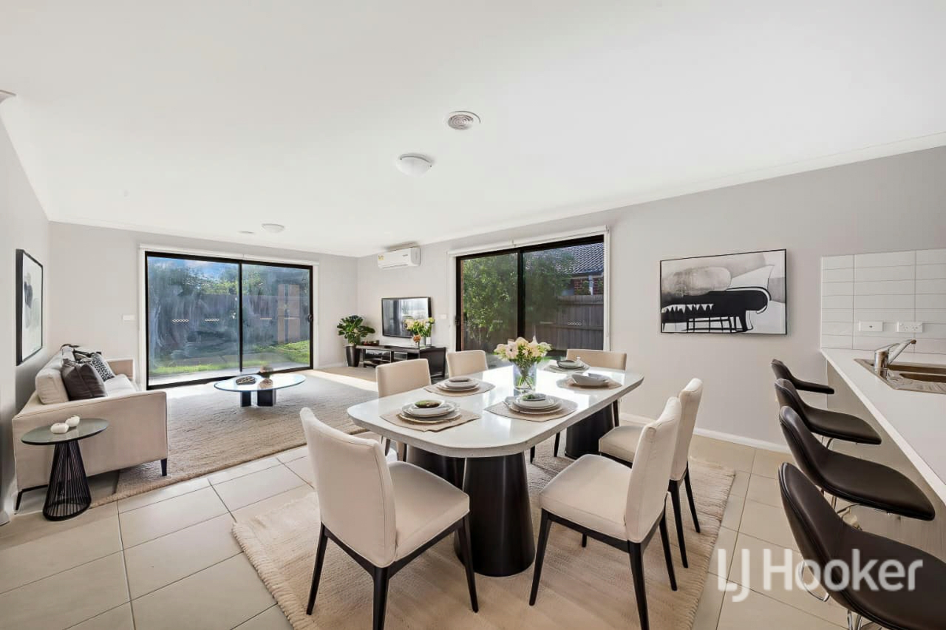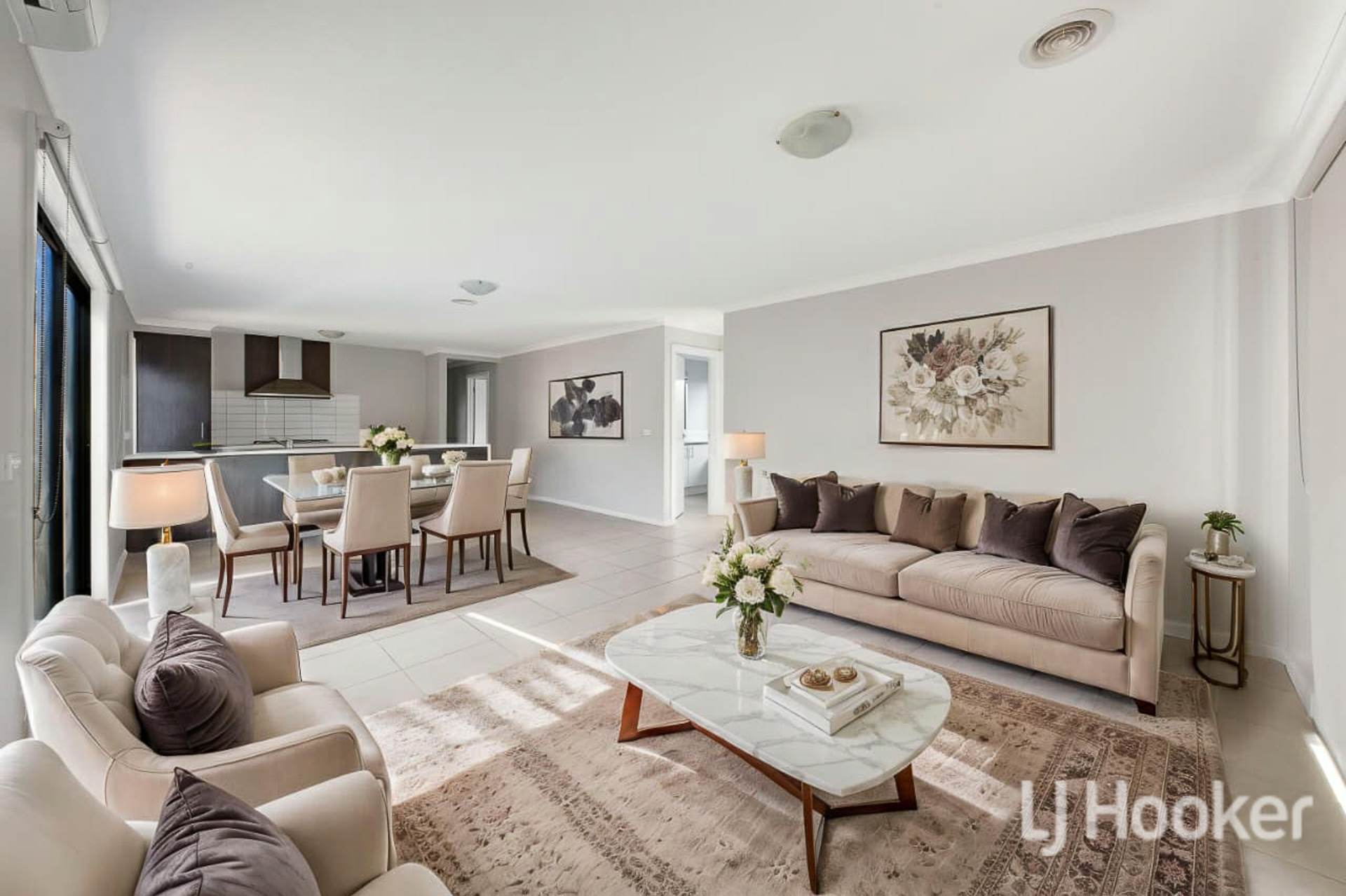 At the heart of the home is a spacious kitchen featuring expansive benchtop space, perfect for meal preparation and entertaining. This seamlessly flows into the open-plan living and dining area, creating a warm and inviting space for everyday living.