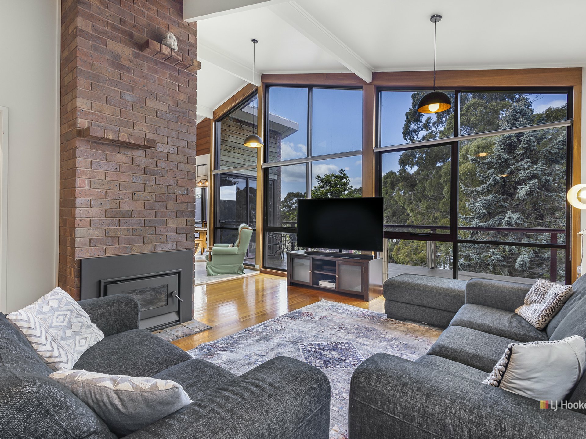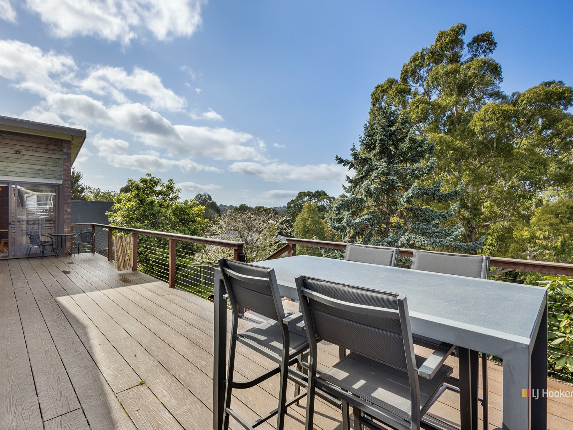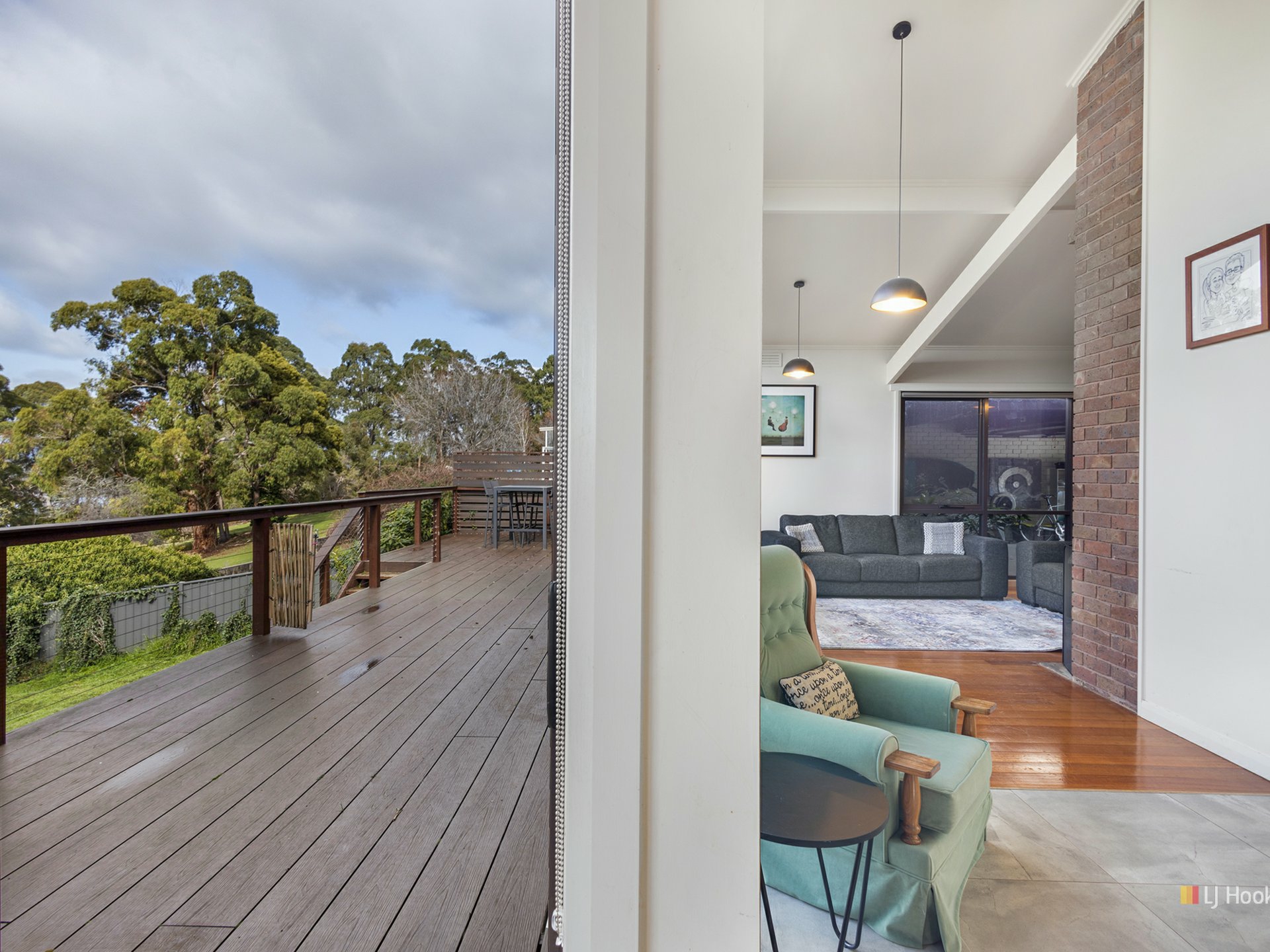 Step outside to the expansive eco wood deck that spans the rear of the property. This outdoor oasis offers lovely views of the lush parkland and glimpses of the Mersey River through the trees. It’s a perfect spot for relaxing or hosting gatherings.