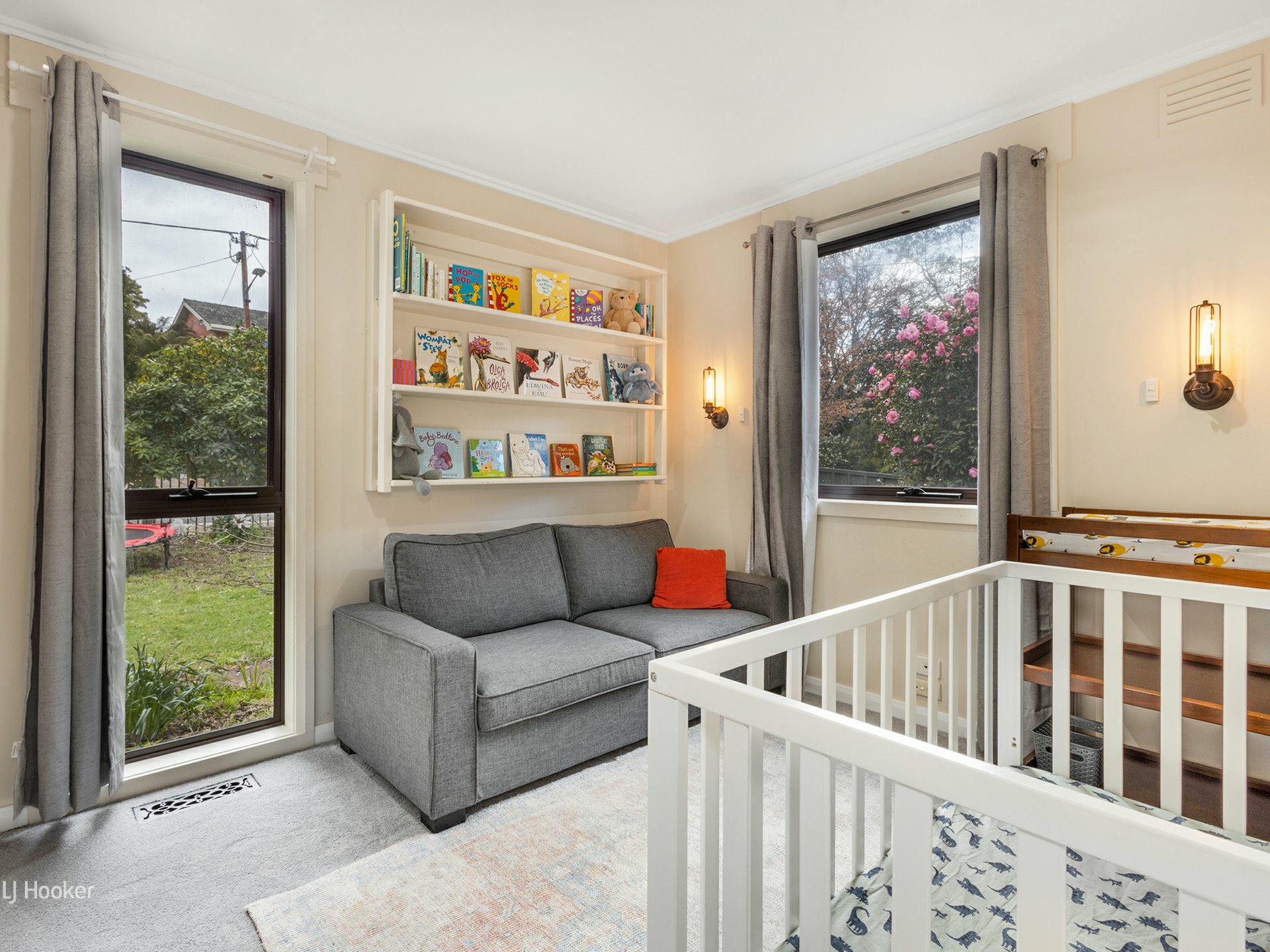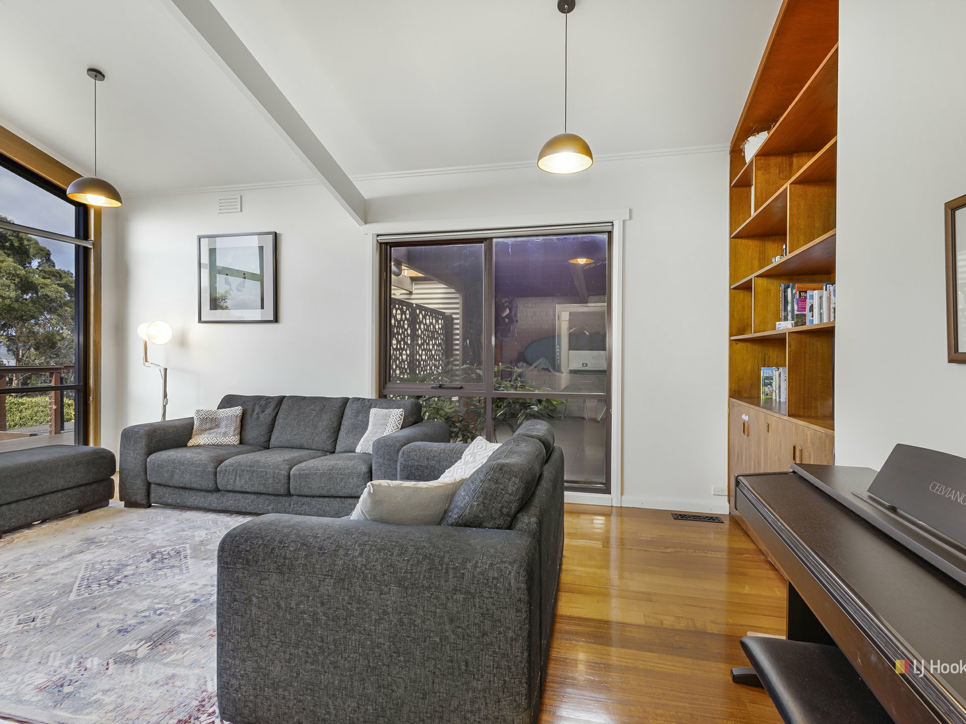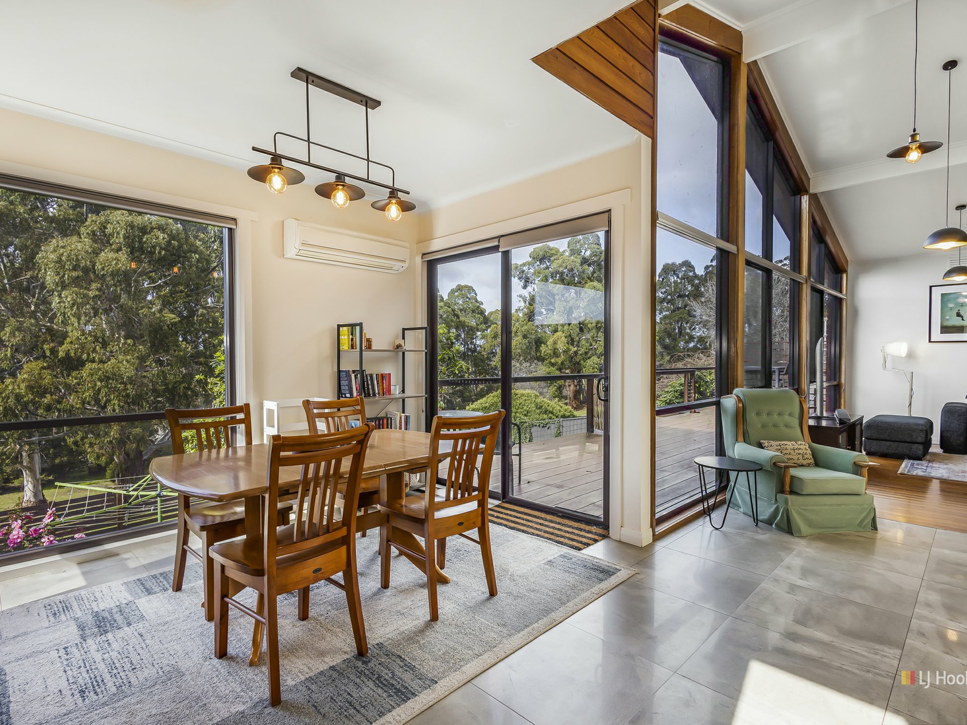 Step outside to the expansive eco wood deck that spans the rear of the property. This outdoor oasis offers lovely views of the lush parkland and glimpses of the Mersey River through the trees. It’s a perfect spot for relaxing or hosting gatherings.