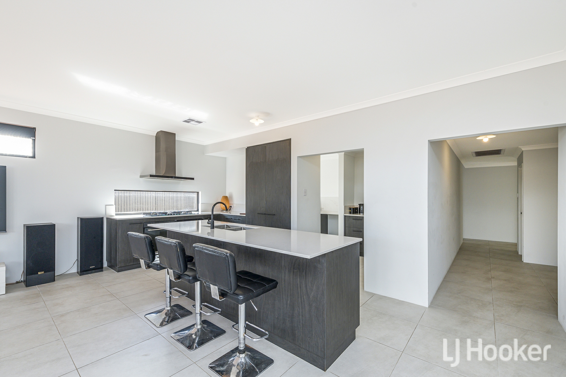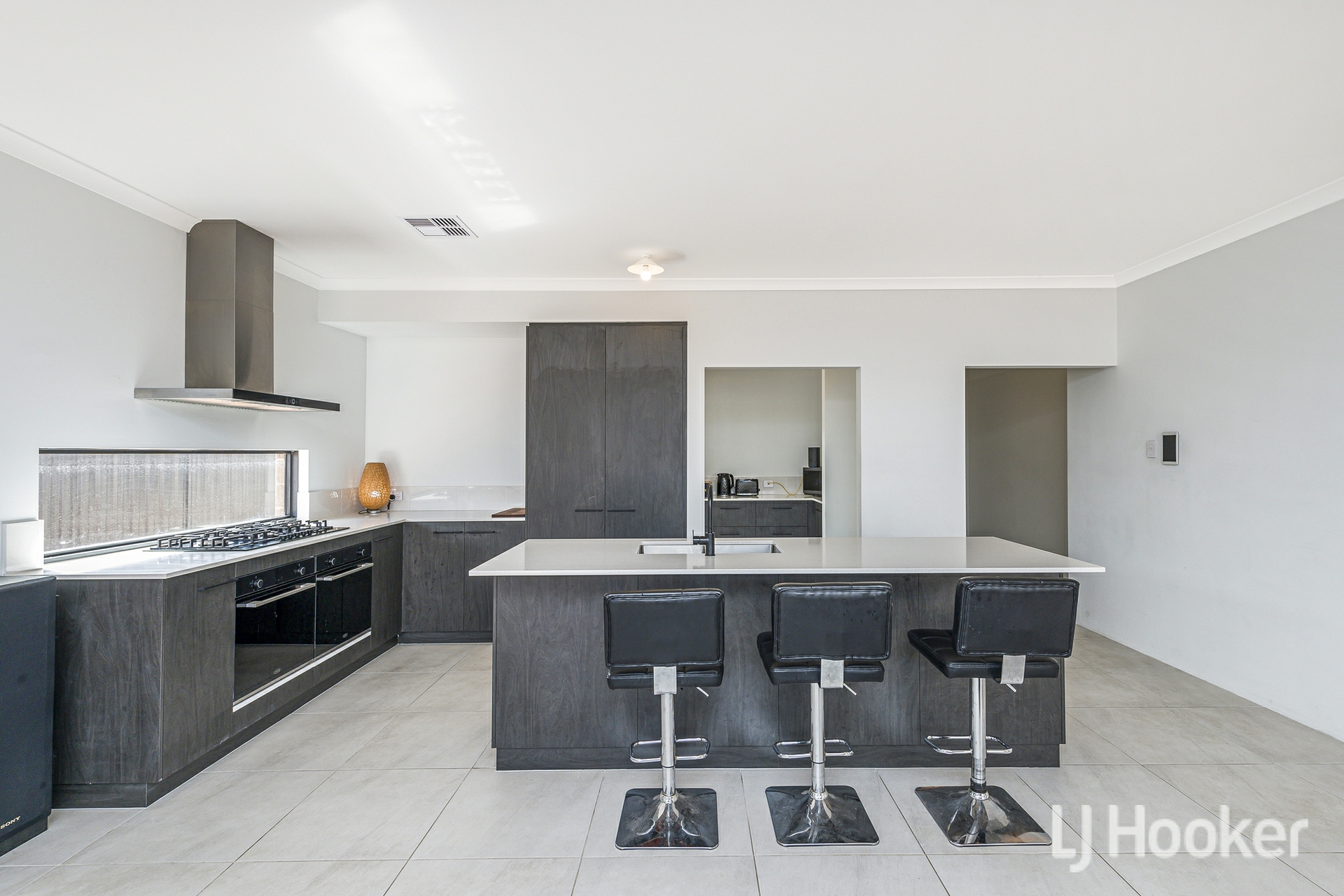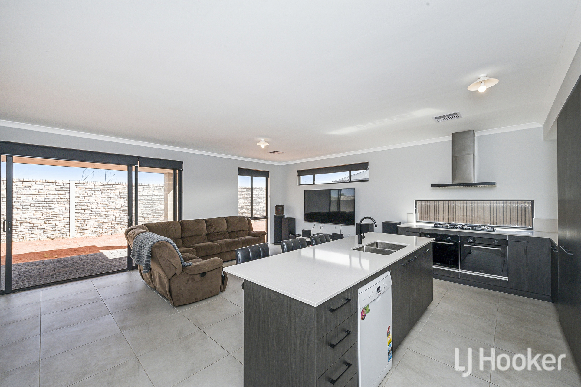 The rear of the home opens into a light filled living and dining area, overseen by a superbly equipped kitchen. Twin 600mm ovens, a large gas cooktop, dishwasher, stone topped breakfast bar and wraparound benchtop make this a dream space for home cooks. A sizeable scullery keeps appliances tucked away, and the plumbed fridge recess and adjacent laundry add everyday practicality.