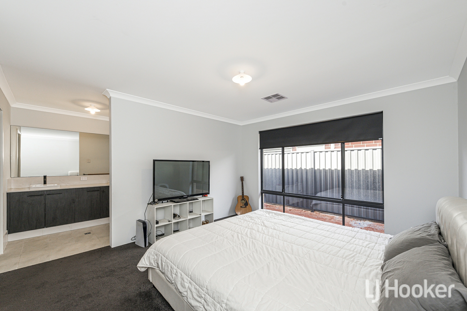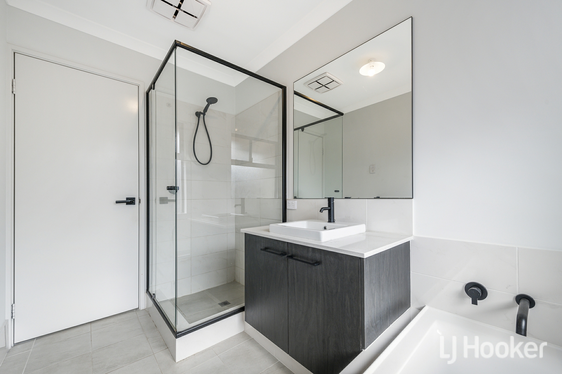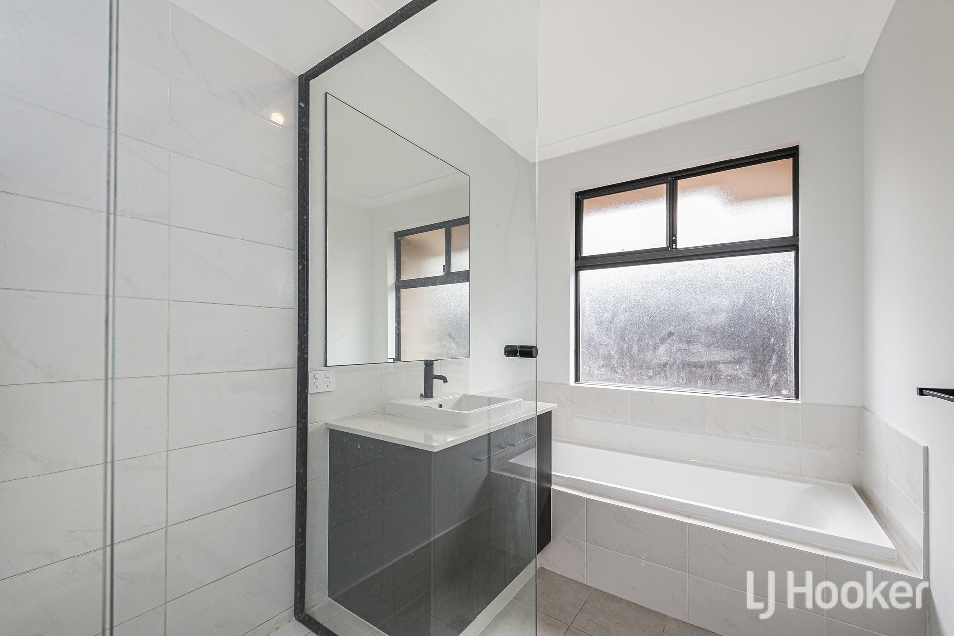The property has strong street appeal, framed by a neat, easy care front yard and a double garage with shoppers entry plus direct access to the rear. Inside, large grey tiles flow through the living areas and hallways, setting a stylish tone from the moment you step in. To the right, three spacious bedrooms feature plush carpets and ample storage two with floor to ceiling mirrored robes and one with a walk in robe. These rooms enjoy convenient access to a beautifully appointed bathroom with black tapware, a black framed shower, a separate bathtub and a stone topped vanity.