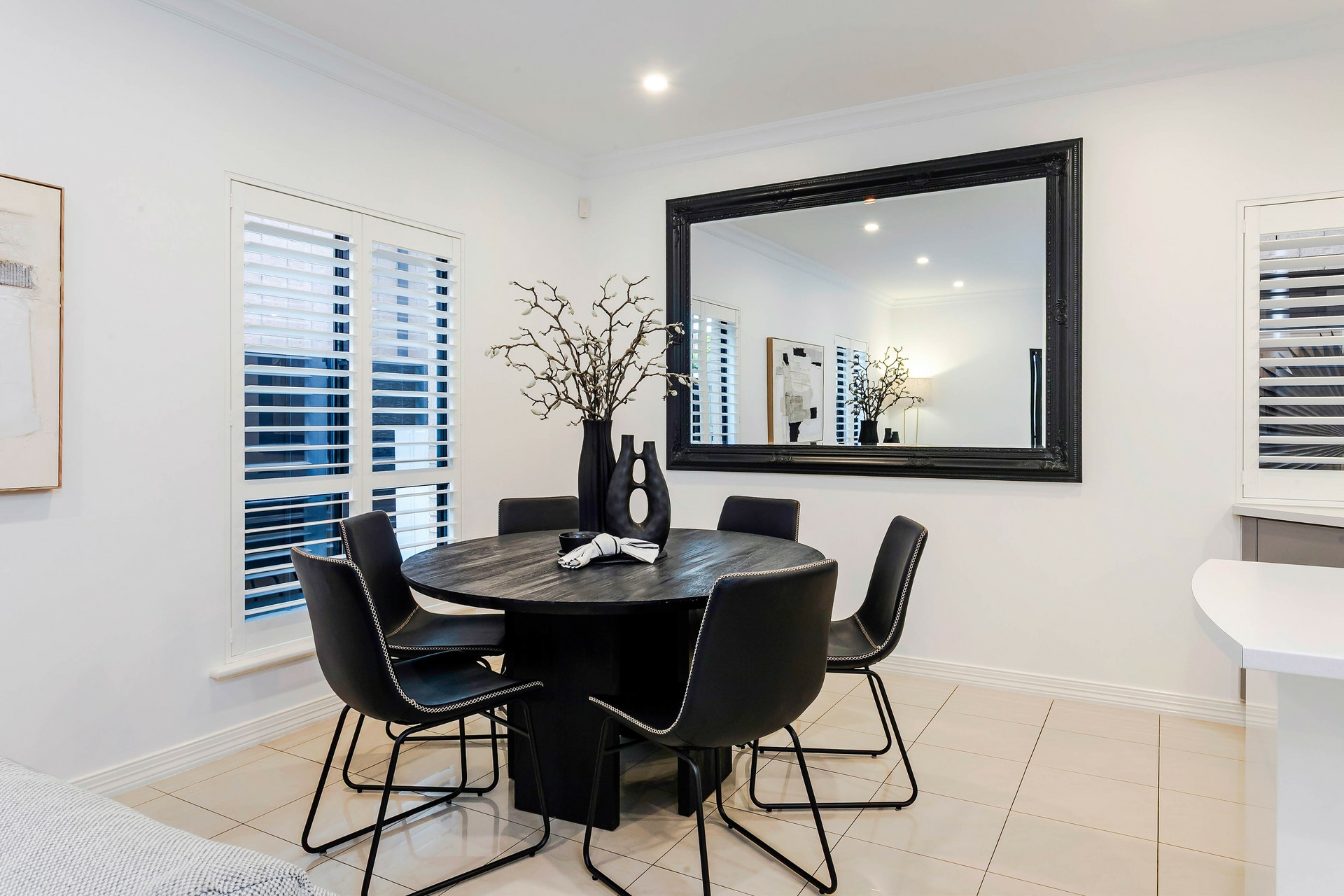 Plantation shutters throughout add timeless elegance, complemented by tiled flooring on the ground floor and plush carpeting upstairs. Ducted reverse-cycle air conditioning ensures year-round comfort, while ceiling fans in all bedrooms provide an additional touch of luxury.