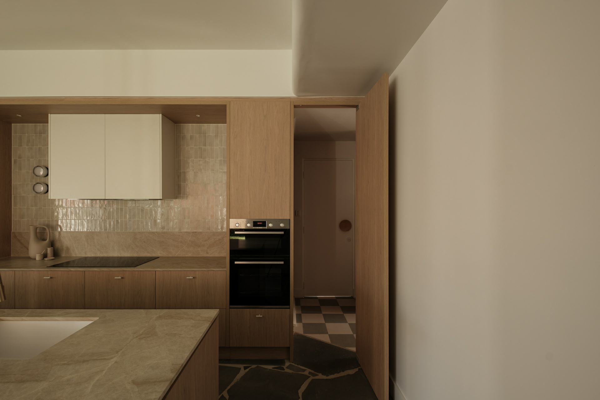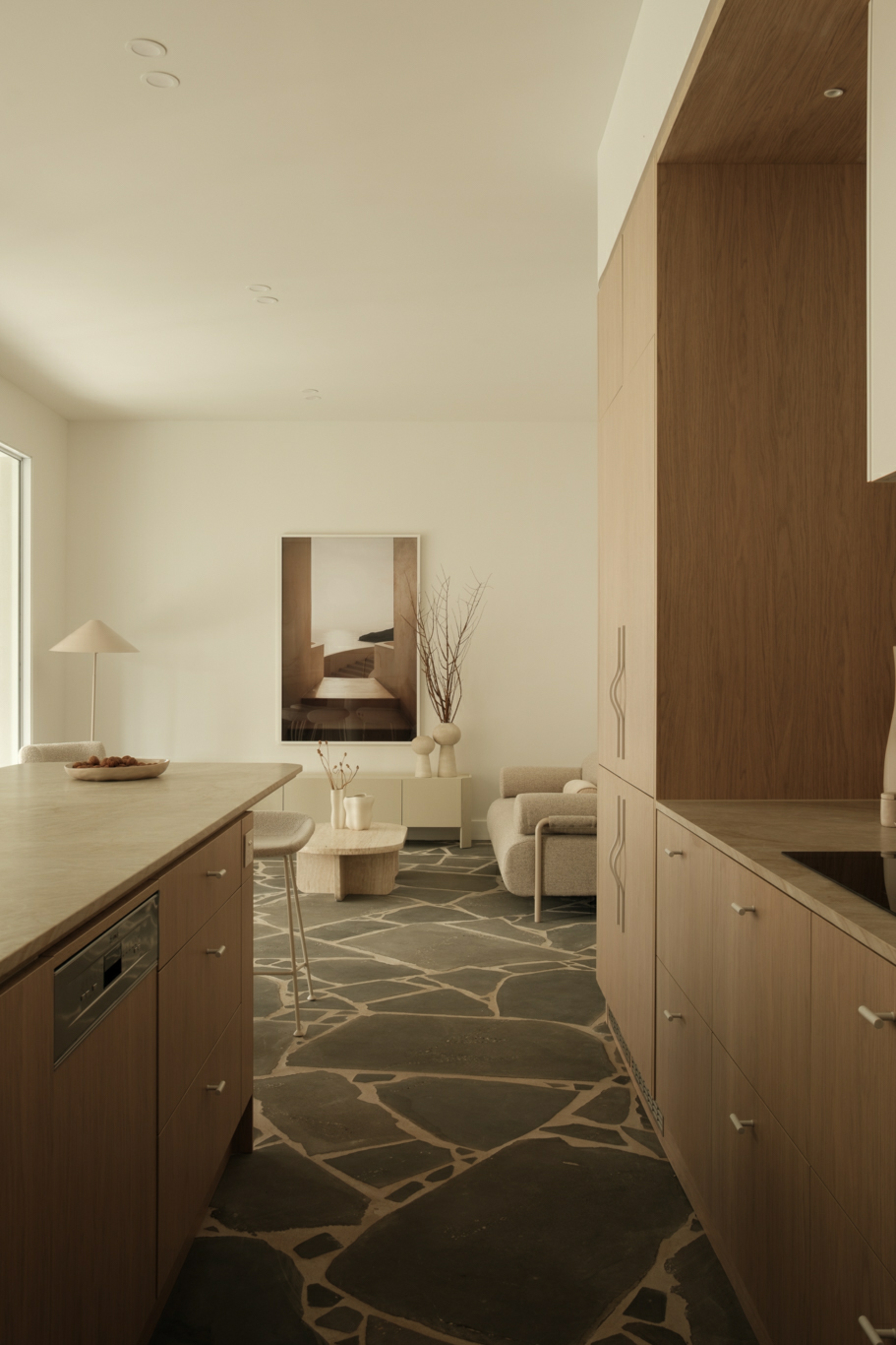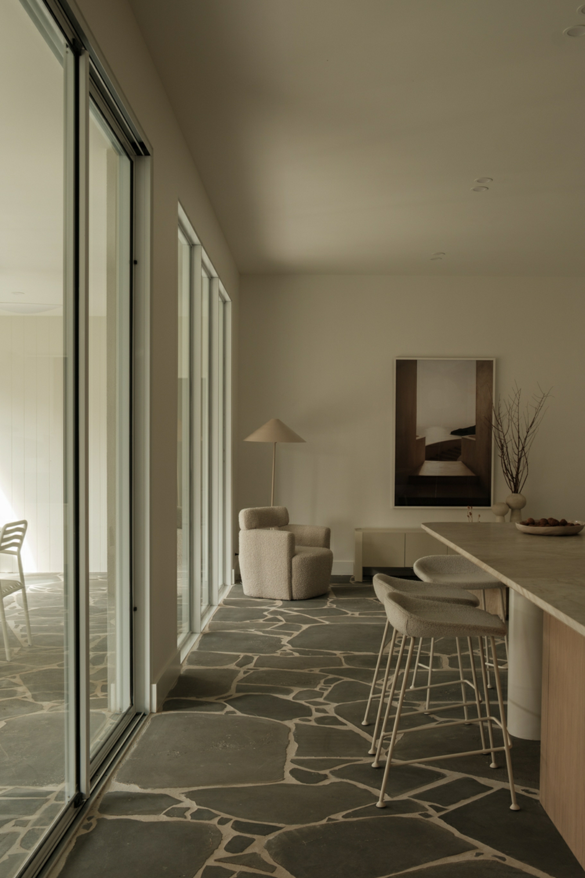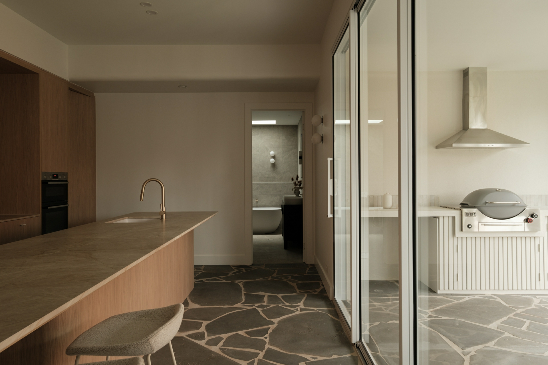At the heart of the home, the newly designed living area connects effortlessly to the outdoors, with full-height glazing opening onto a beautifully considered terrace, perfect for entertaining or relaxed family living. The kitchen has been crafted for both performance and longevity, featuring Smartstone Taj Mahal porcelain benchtops, Spanish handmade tile splashbacks, and fully integrated appliances including a double fridge and freezer, integrated dishwasher, Bosch stacked wall ovens, and a Smeg 90cm induction cooktop.