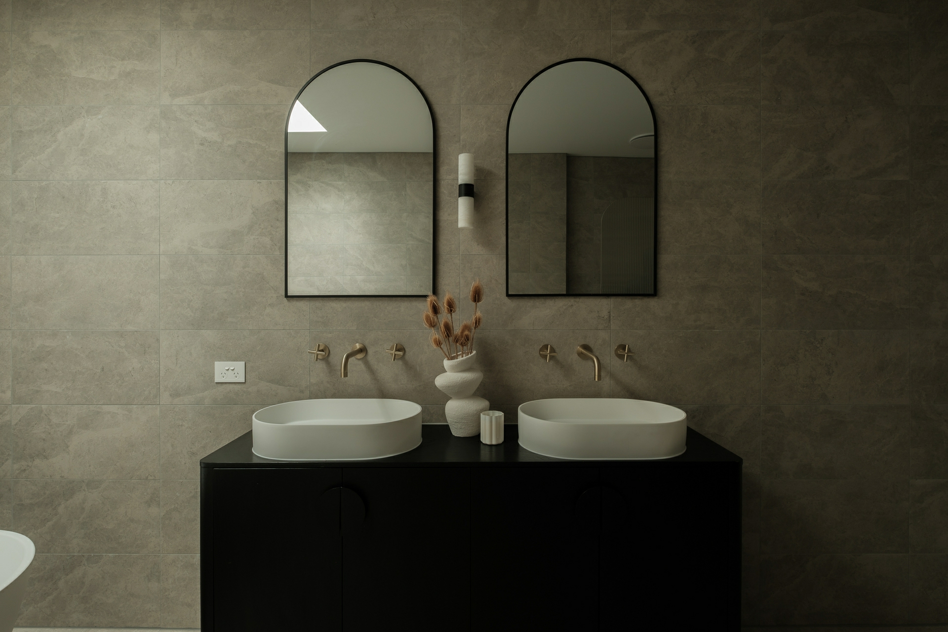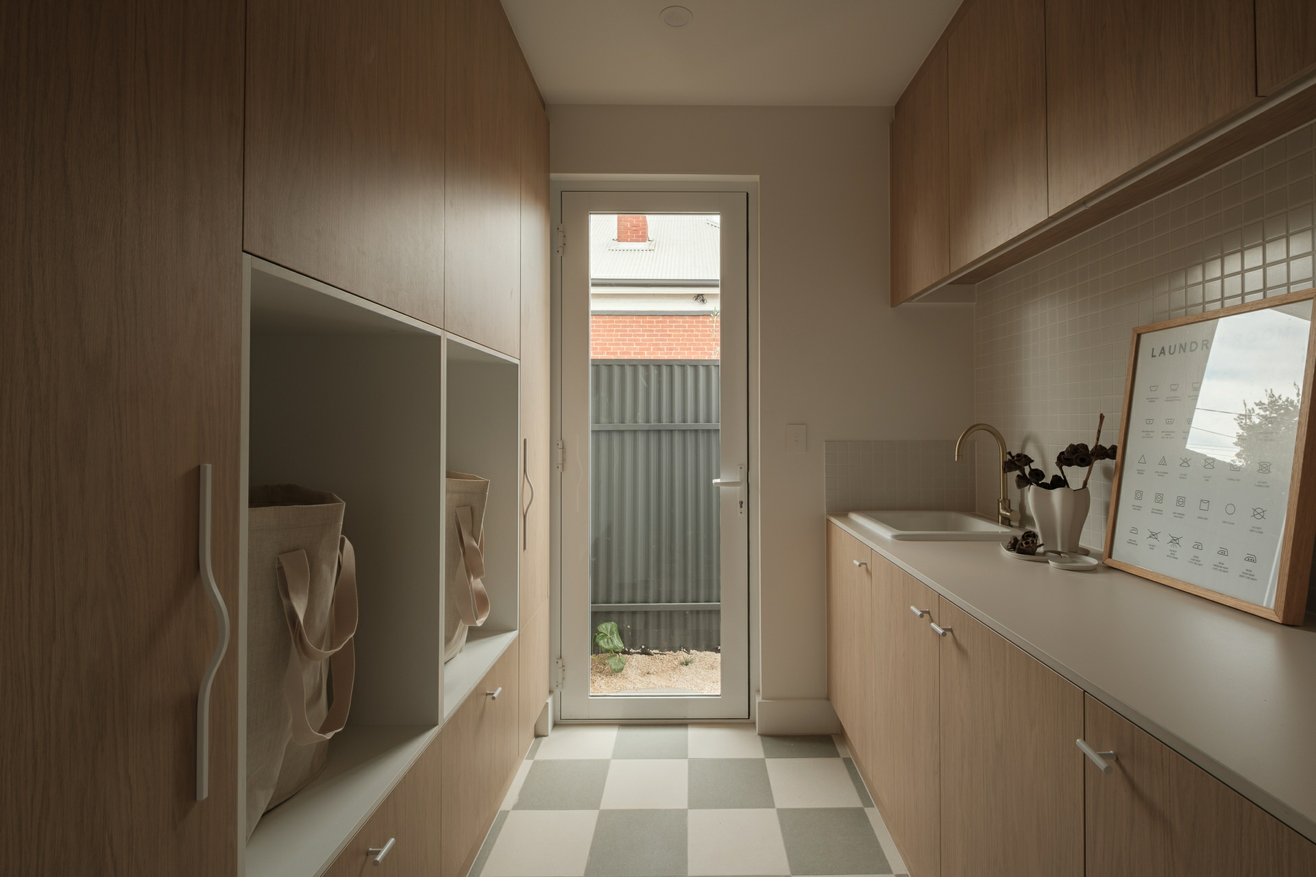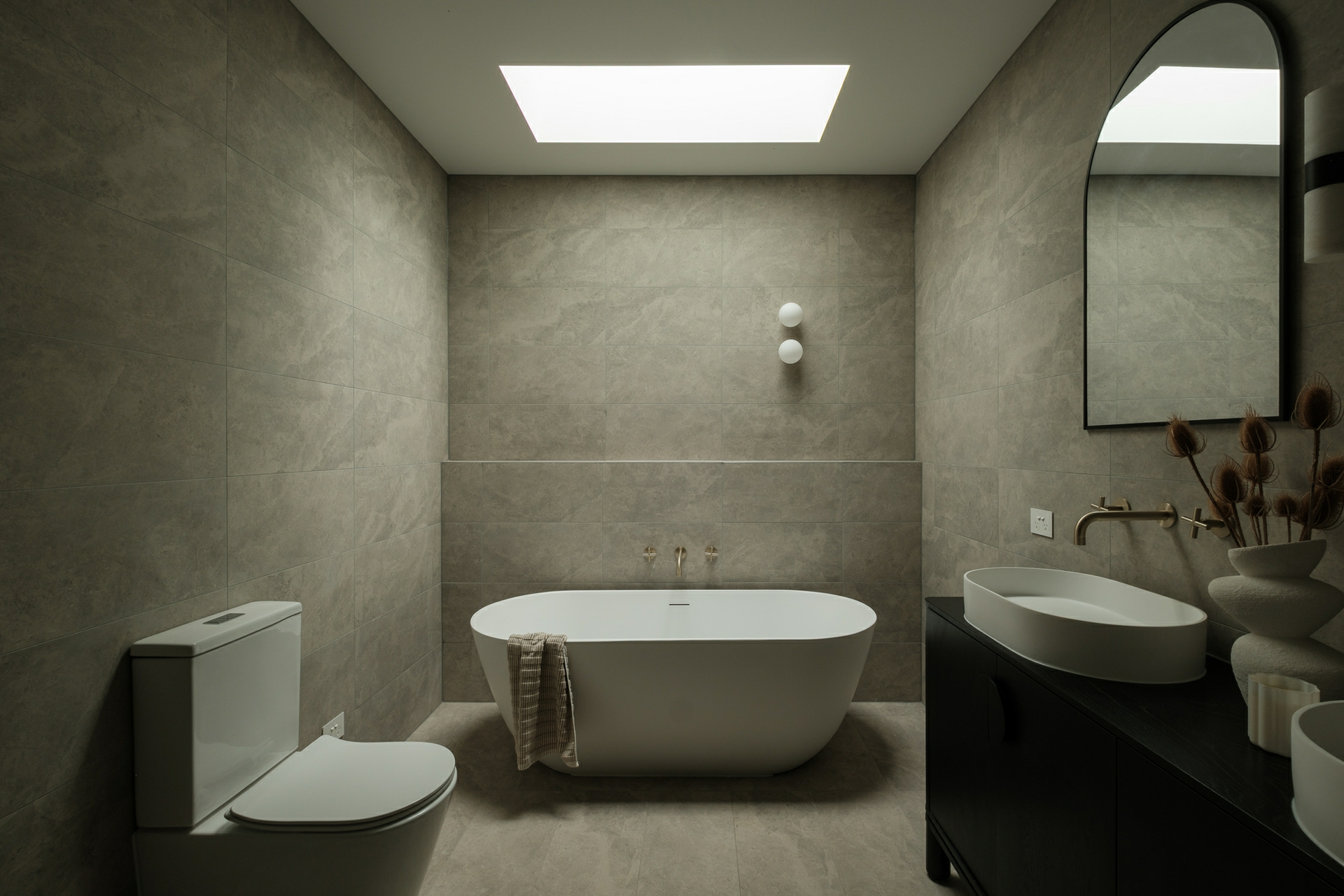 The main bathroom offers a luxurious retreat, complete with a dual vanity and a freestanding 1700mm bath positioned beneath a skylight, inviting natural light by day and tranquil sky views by night. A highly functional mudroom and laundry sit conveniently off the carport, incorporating full-height storage, integrated joinery, and thoughtful additions such as a charging station, LED lighting, and provisions for raised appliances.