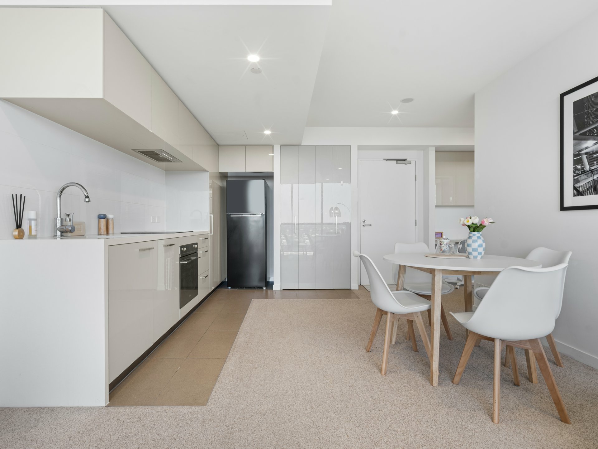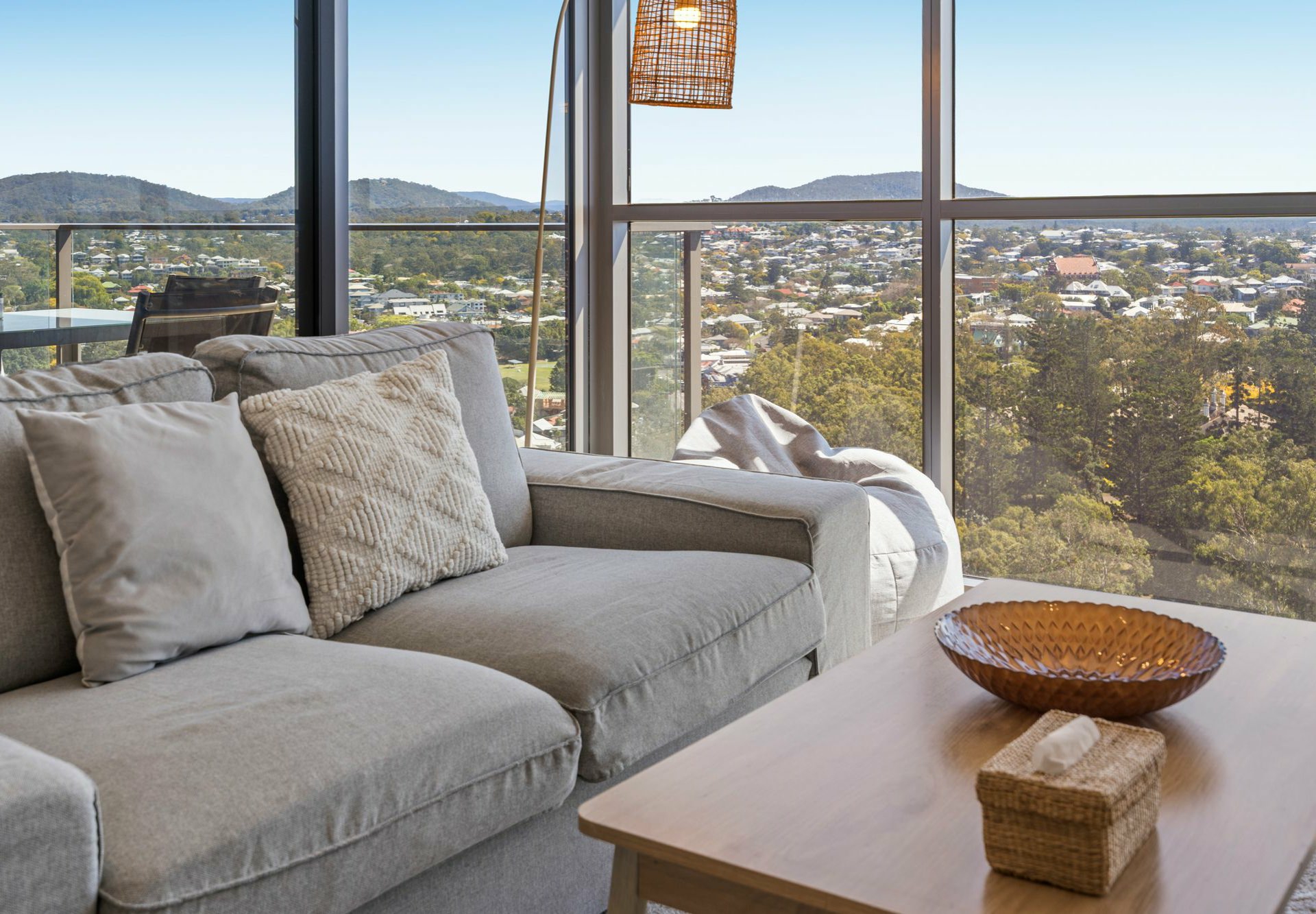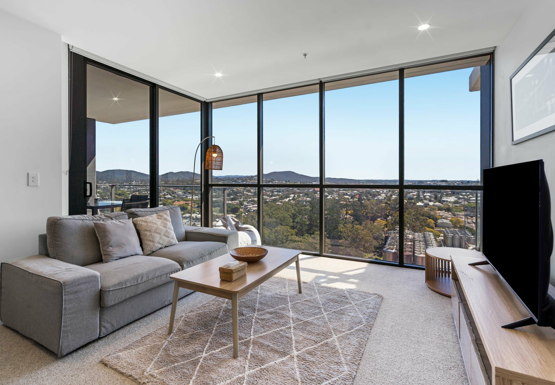Defined by tiling against the adjacent carpeted living/dining area, the galley-style kitchen has neutral-toned stone benchtops and matching cabinetry, a sleek induction cooker, concealed rangehood and elegant tapware. The living end of this open-plan hub has full-height windows to take in the epic views, and glass sliders onto an alfresco entertaining balcony with glass balustrade.
