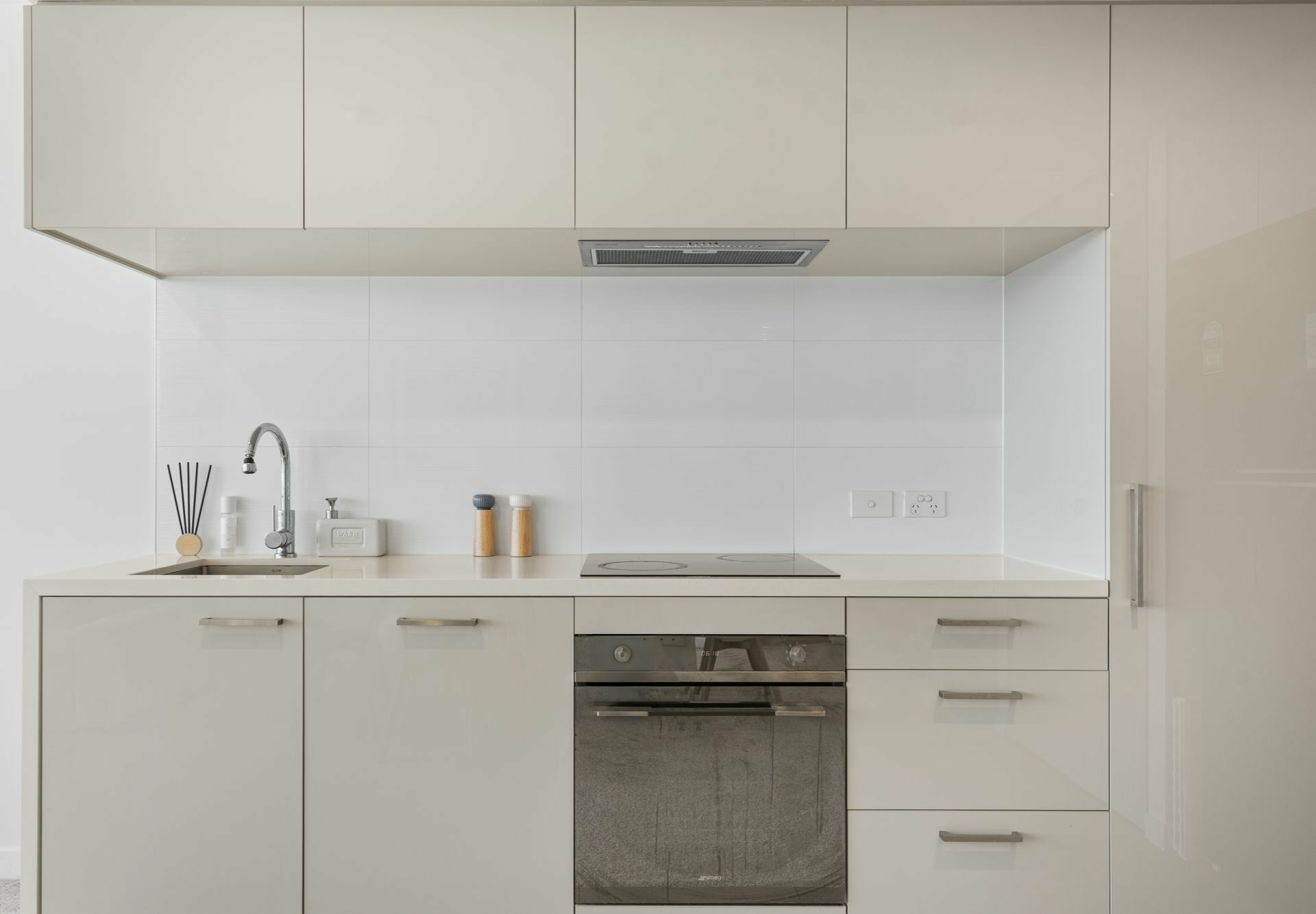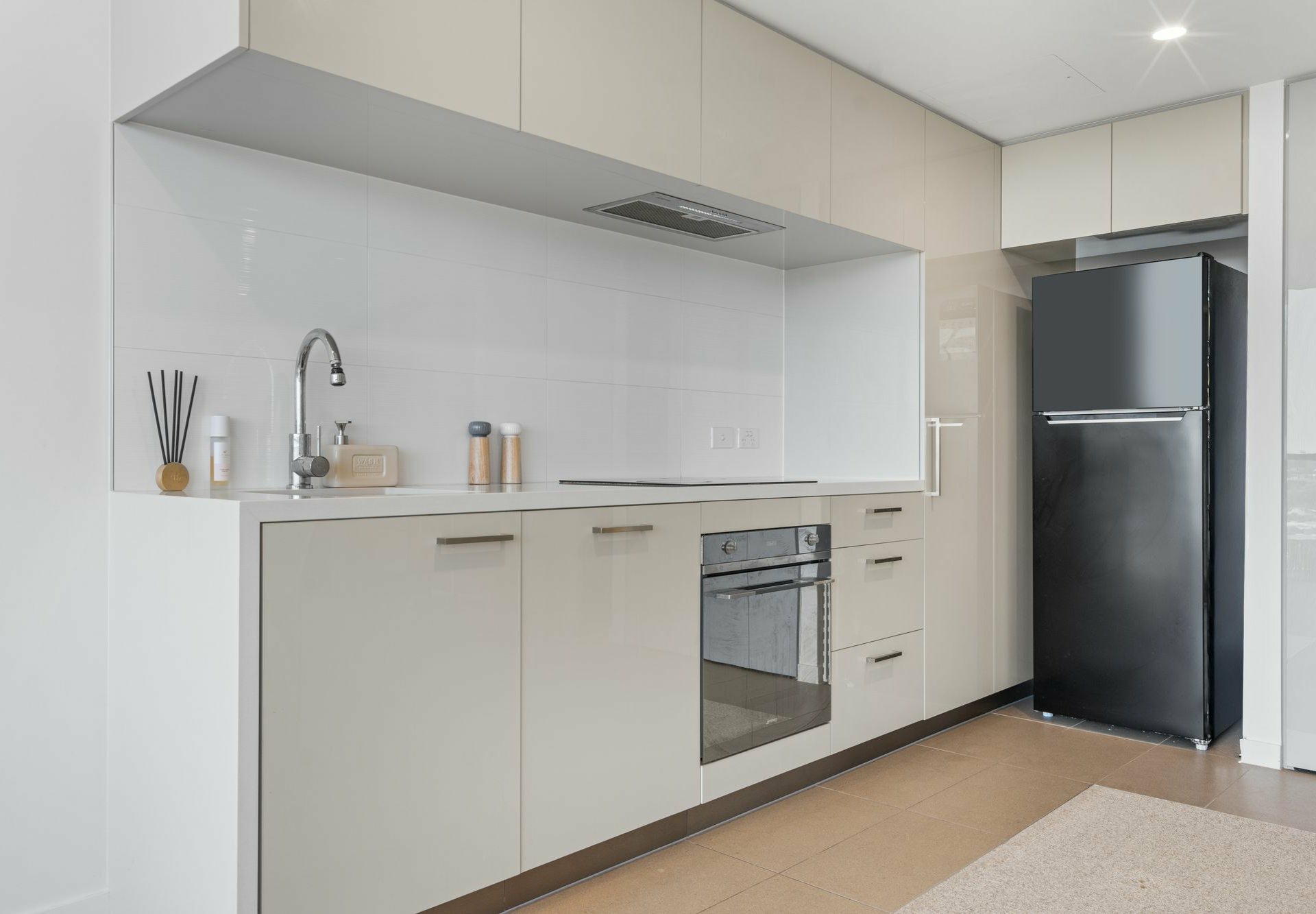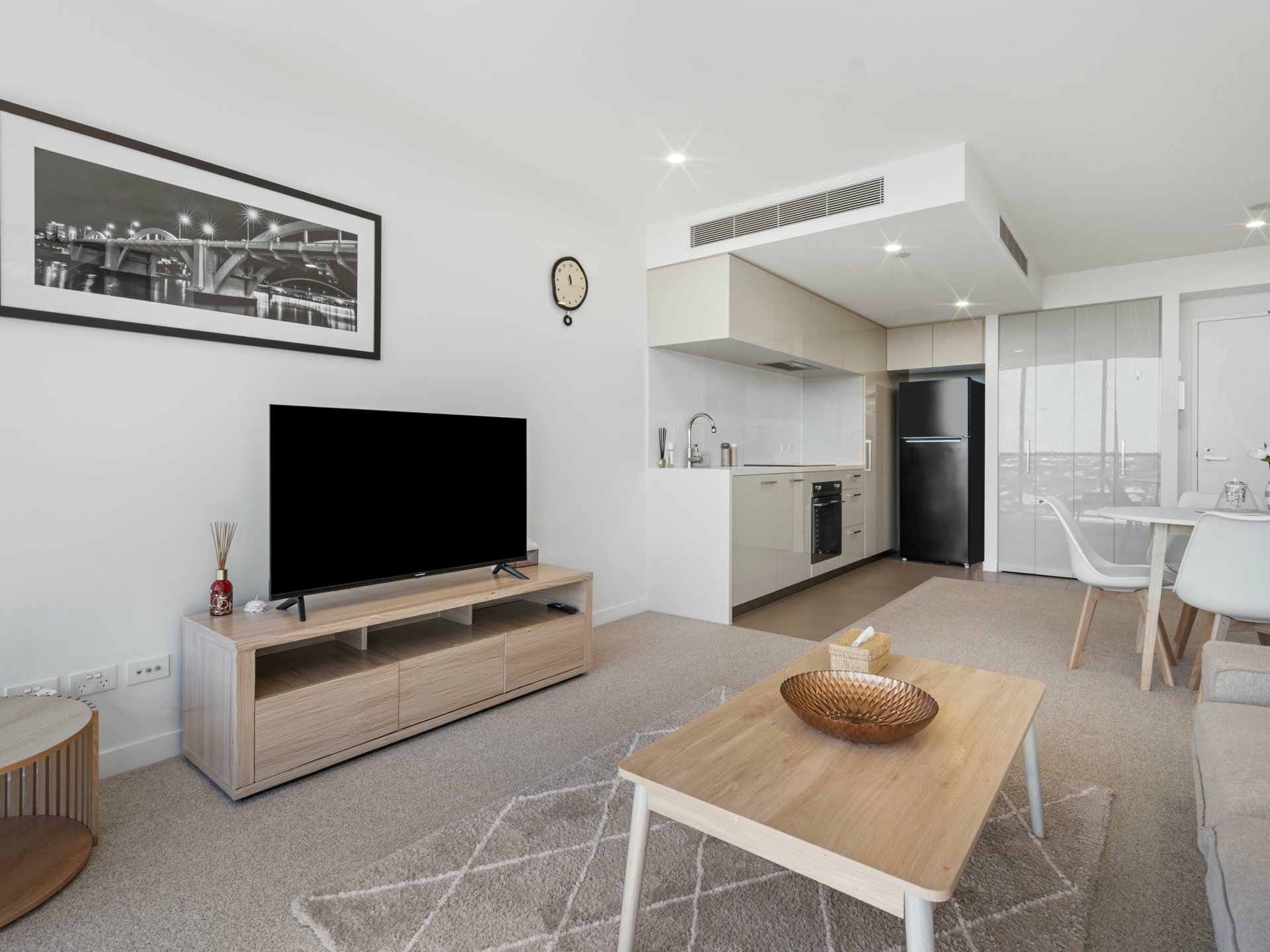 Defined by tiling against the adjacent carpeted living/dining area, the galley-style kitchen has neutral-toned stone benchtops and matching cabinetry, a sleek induction cooker, concealed rangehood and elegant tapware. The living end of this open-plan hub has full-height windows to take in the epic views, and glass sliders onto an alfresco entertaining balcony with glass balustrade.