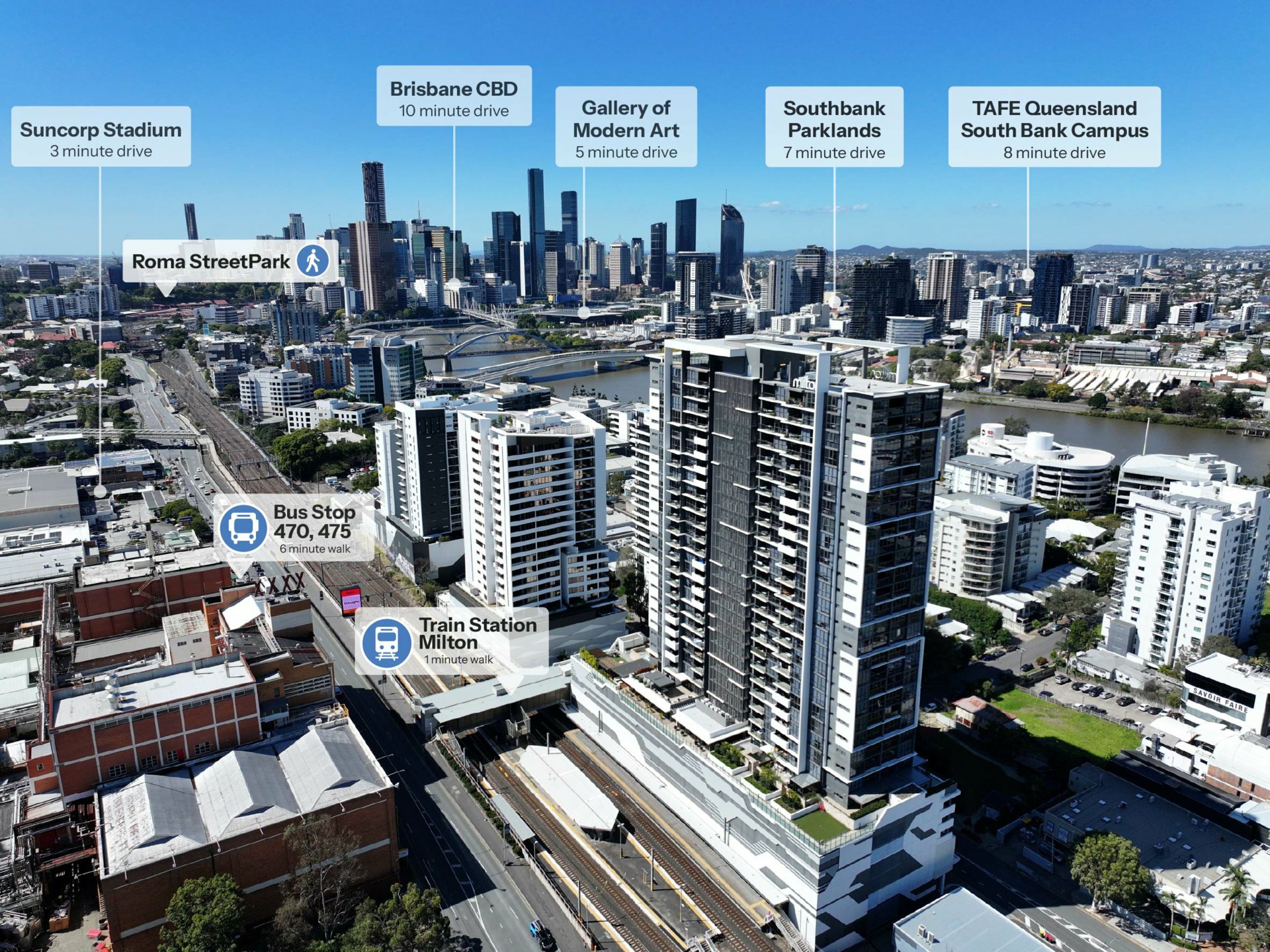 While it will be hard to drag yourself away from The Milton when you have a pool, spa, sauna, gym and one of the highest observation decks in Brisbane only a lift ride away, there's a world of fun awaiting right outside the building's entry foyer. This supreme location, so close to the river and the heart of the city, is the place to be if you like handy access to great eateries, boutique fashion, sporting entertainment and scenic walk/bikeways!
